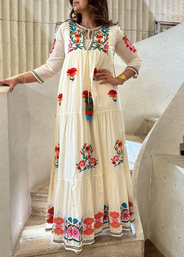 The Long Multicolor Embroidered Kaftan Dress (Product Code: AWS2-587) is a stunning addition to any woman's wardrobe, featuring vibrant multicolor embroidery that adds a lively touch. This long kaftan dress showcases a unique split round neck with a braided tie and tassel details, combining elegance with comfort. With its flowing silhouette and 3/4 sleeves, it offers ease of movement and versatility for various occasions, from casual outings to semi-formal events.