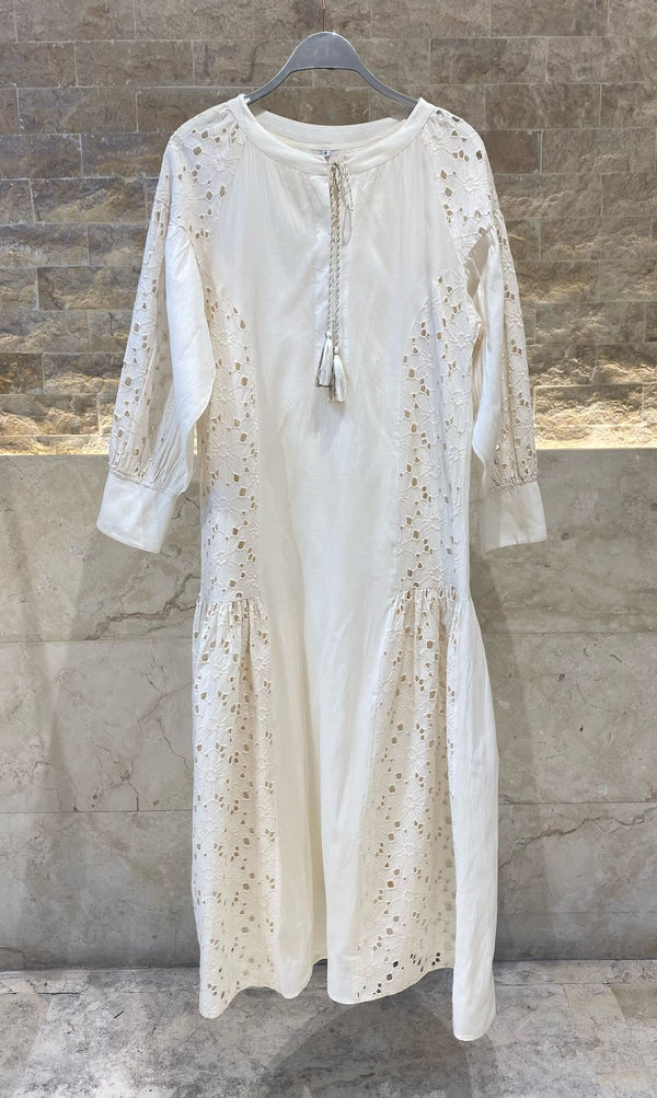 The Long A Line Kaftan Dress (Product Code: AWS2-591) offers a blend of elegance and comfort, perfect for any occasion. Designed with a split round neck, this sophisticated dress features dantel side details that enhance its chic appeal. The long puffed sleeves and drop shoulder design allow for ease of movement, making it a stylish yet practical choice. The tassel neckline and wide cuffs with cut details further elevate its visual charm. Whether you're heading to a casual gathering or a formal event, this versatile kaftan dress is a standout addition to your wardrobe.
