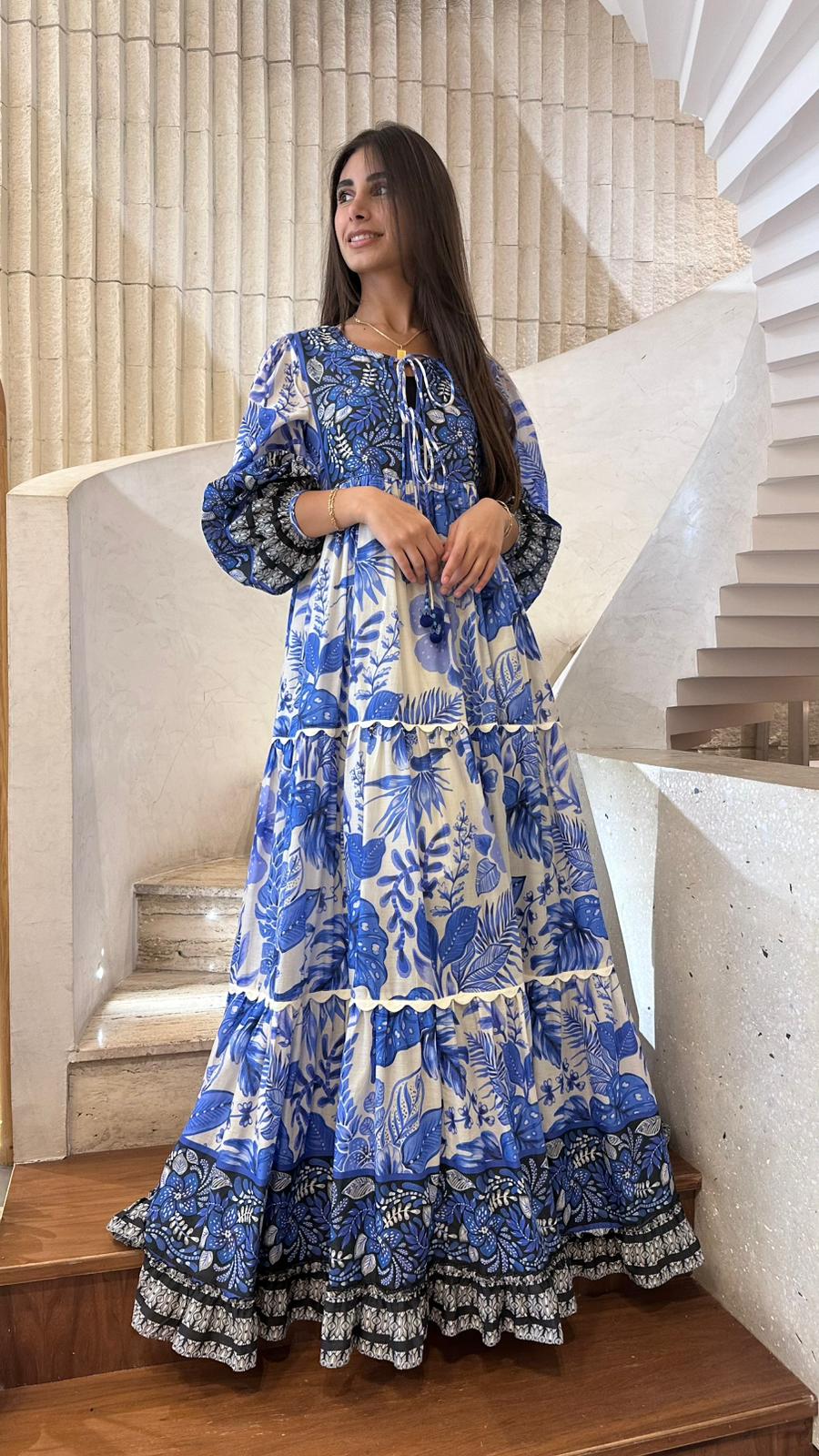 The Long Printed Kaftan Dress (Product Code: AWS2-863) is an oversized floral print dress designed for comfort and style. With a relaxed fit, this kaftan offers ease of movement, making it perfect for casual outings, beach days, or relaxed gatherings. The round V neck features a stylish split tie ribbon, while the long puffed sleeves with buttoned cuffs add a chic touch. The elegant black ruffles hemline enhances its overall flair, making it a standout piece in any wardrobe.