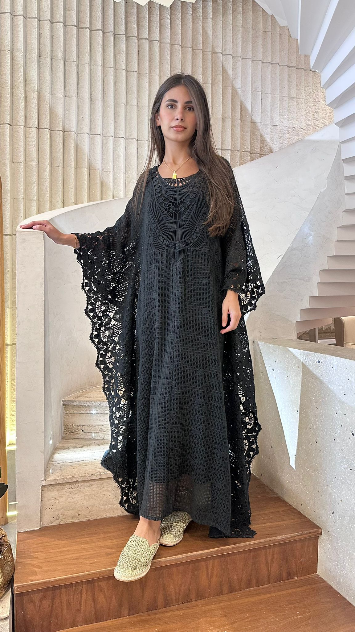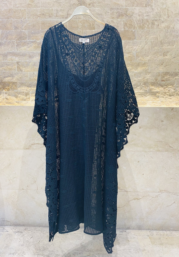 Black Crochet Embroidered Cotton Kaftan
