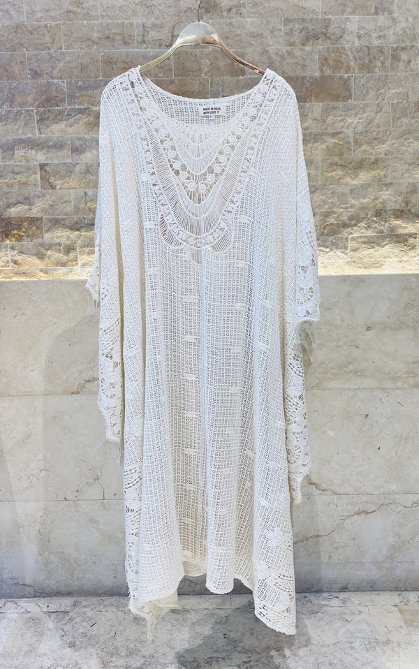 Scoop Neckline Oversized Crochet Embroidered Long Cotton Kaftan with coral spaghetti strap body slip