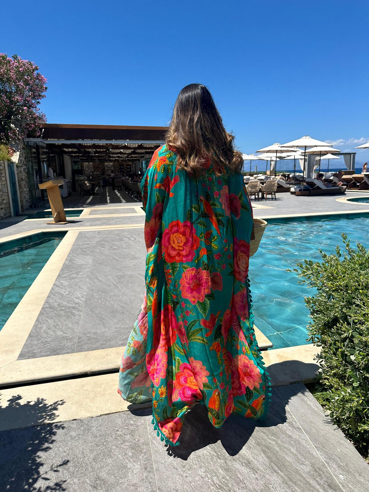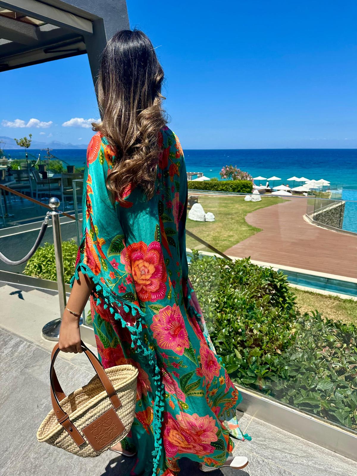 V Neck Printed Satin Long Kaftan Dress with tassel side details and long side slit details