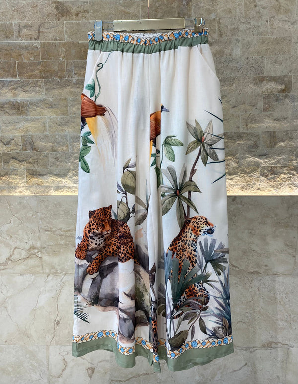 The Leopard Print Set (Product Code: 25002) offers a stylish and bold look, perfect for warm weather. This ensemble features an oversized shirt with a unique leopard and garden print, accompanied by wide-leg pants designed for comfort and versatility. The shirt boasts a curved hem and placket button closure, while the pants include a high waist and elastic waistband for a flattering fit. Ideal for casual outings or relaxed gatherings, this set ensures you stand out effortlessly.