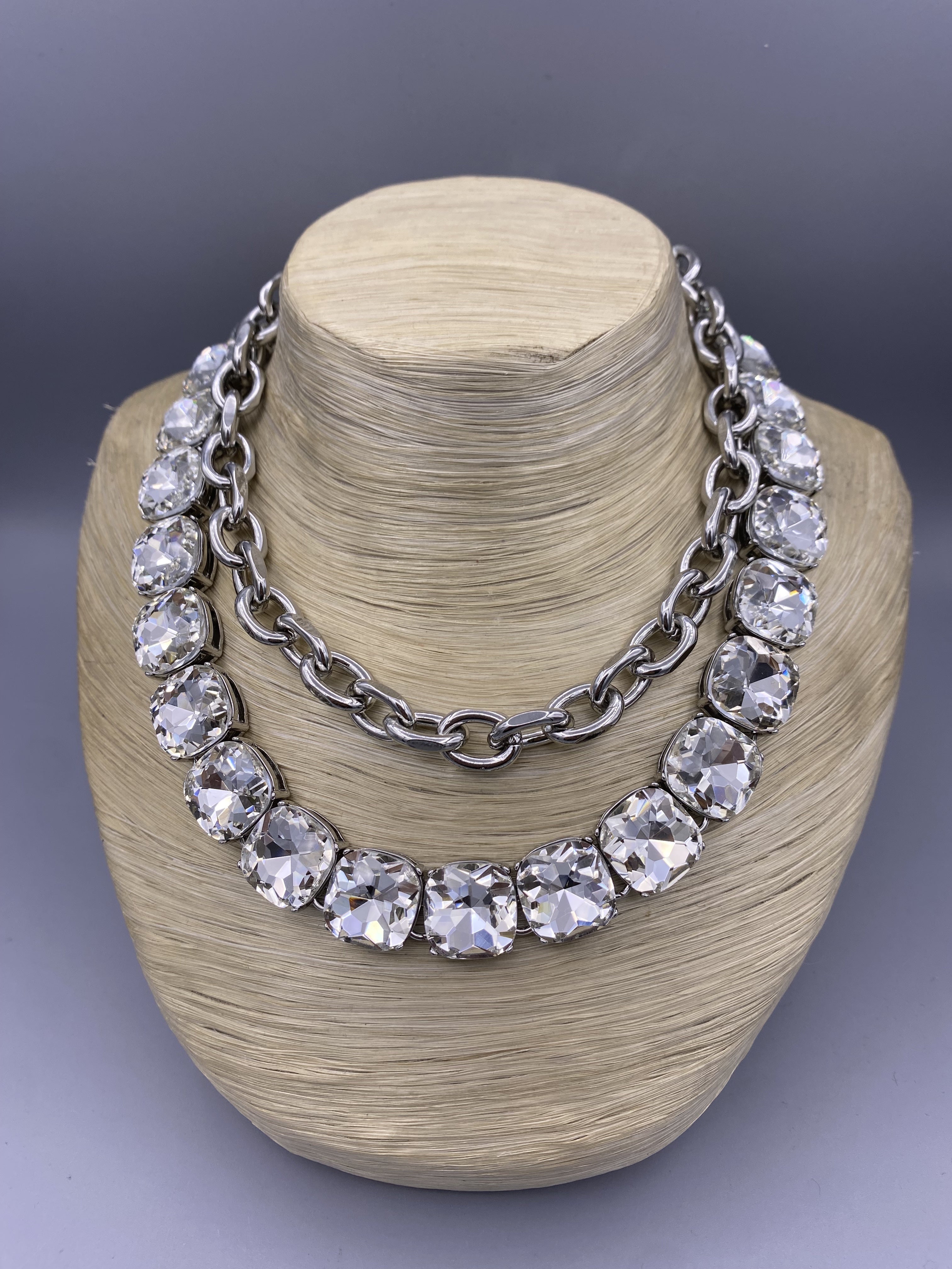 Set of Crystal jewel-style necklace and a metallic chain. Both pieces feature a shiny silver finish, bringing sophistication to any outfit. Ideal for special occasions, they can be worn together or separately for a versatile look.