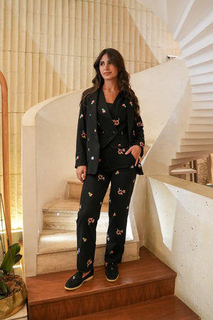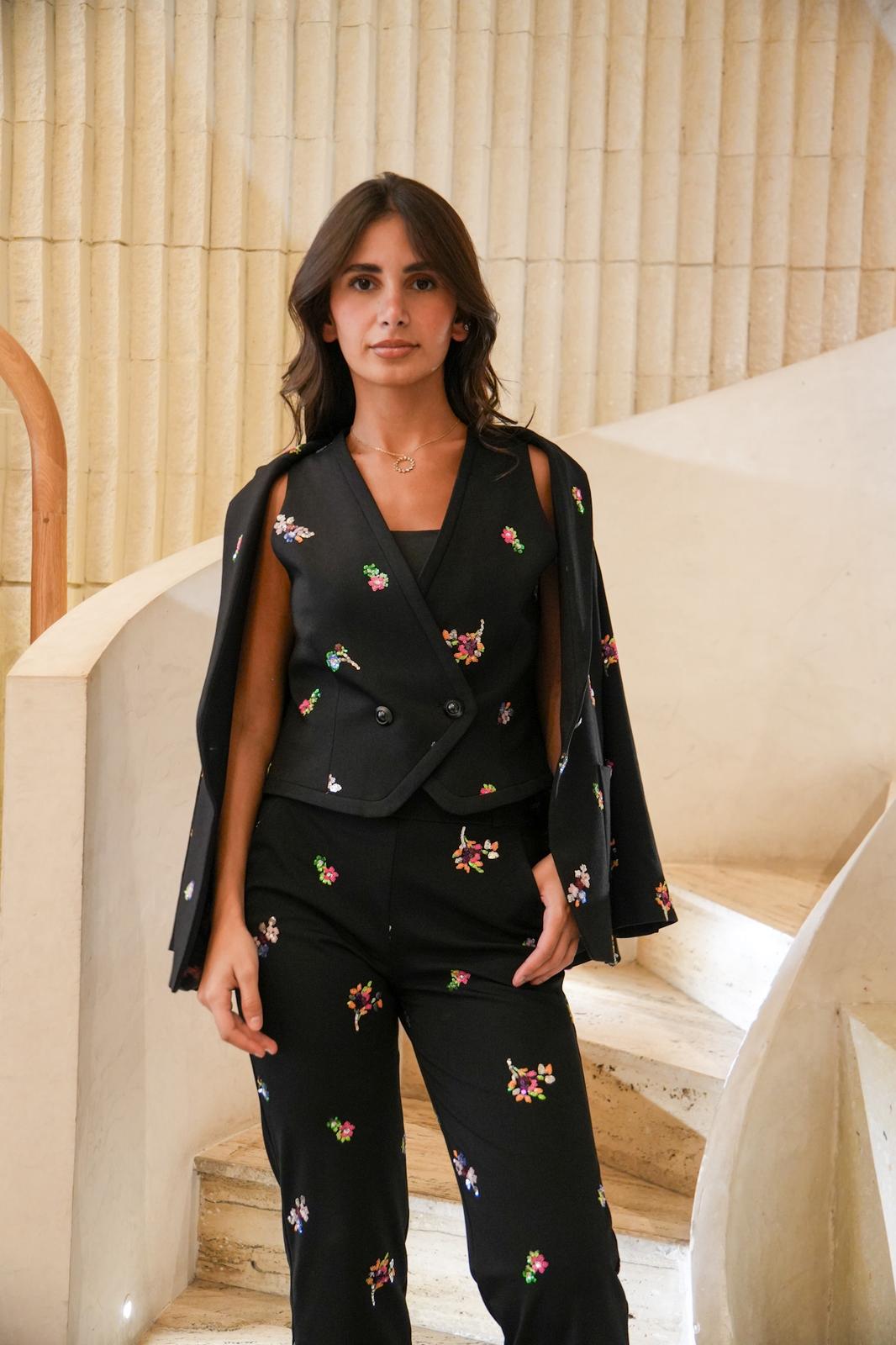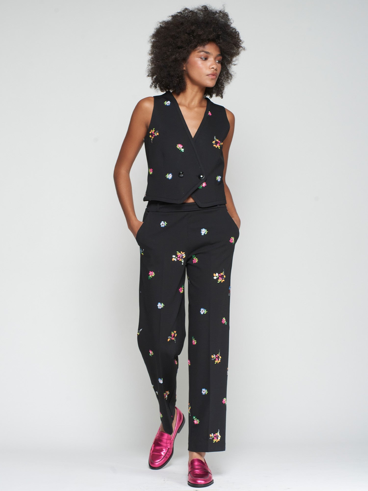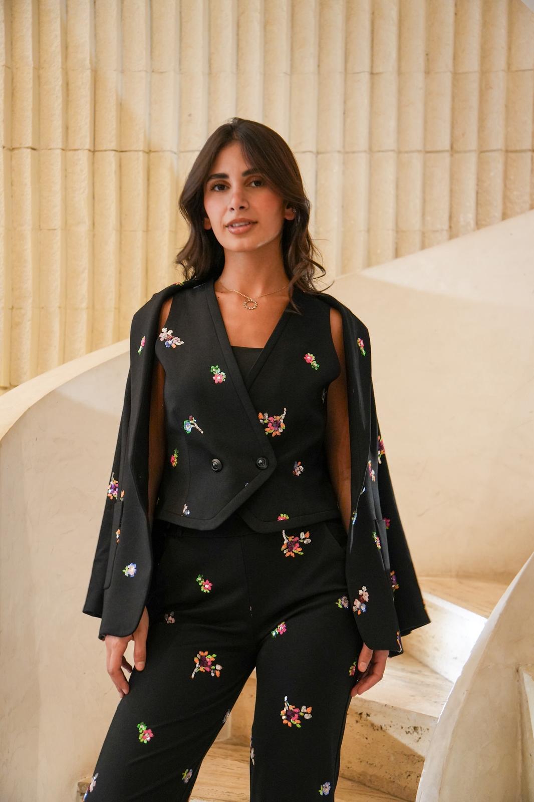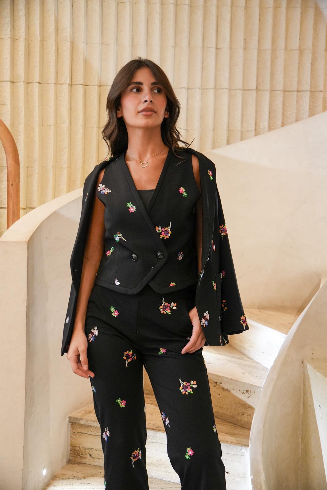 32874/32871 سترة مطرزة بالزهور مع ياقة مطوية وبنطلون بقصّة مستقيمة