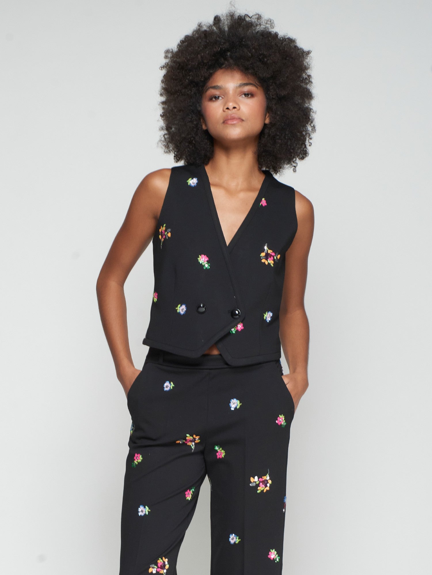 V Neck Buttoned Wrap Waistcoat Vest with multicolour floral sequin embroidery. Straight cut with subtle waist shaping. Made from structured Roma knit fabric with a smooth finish