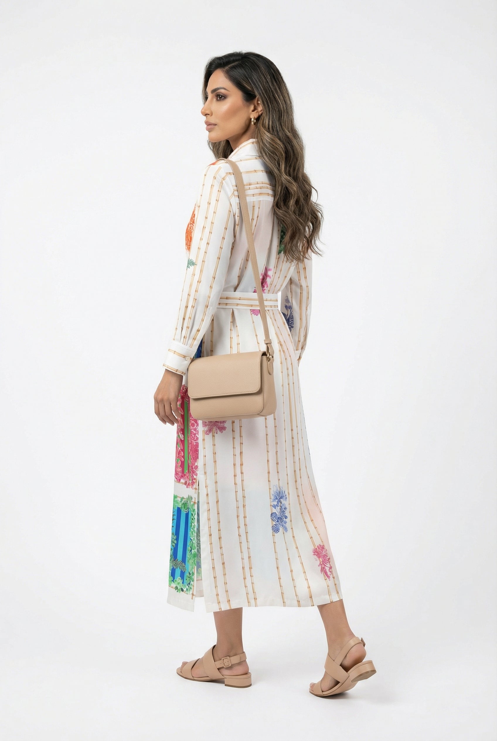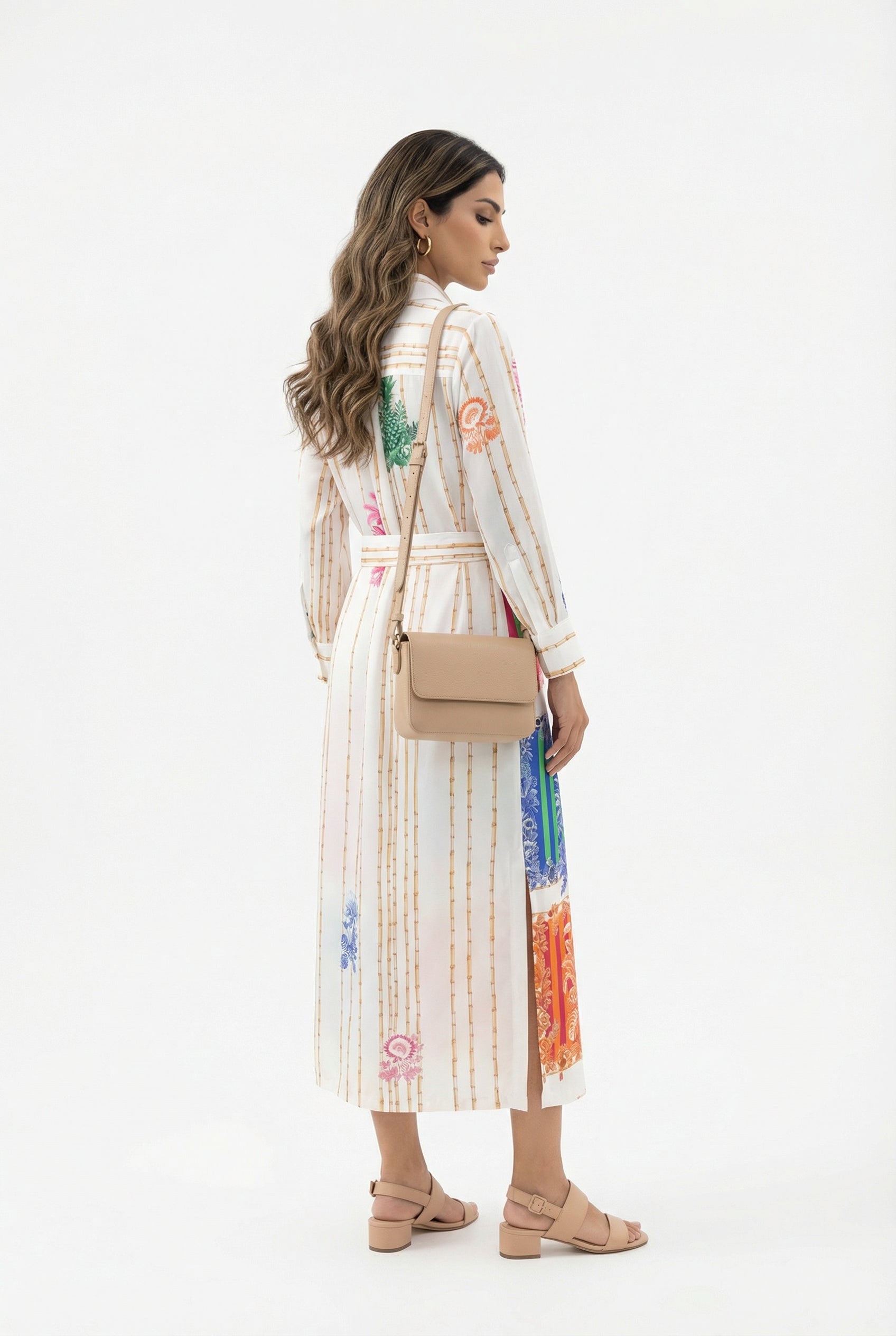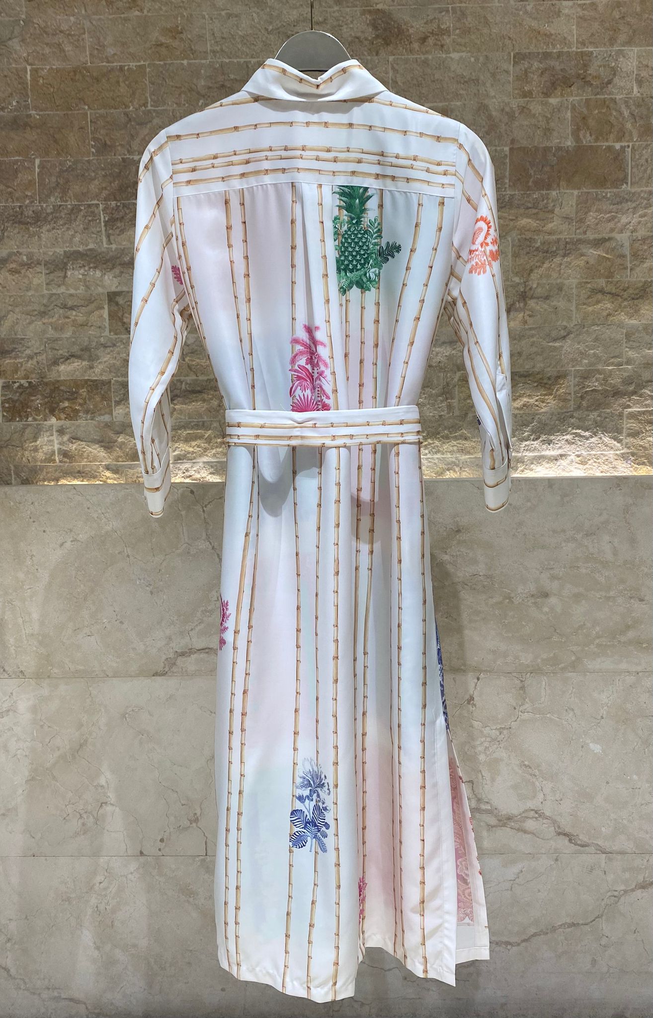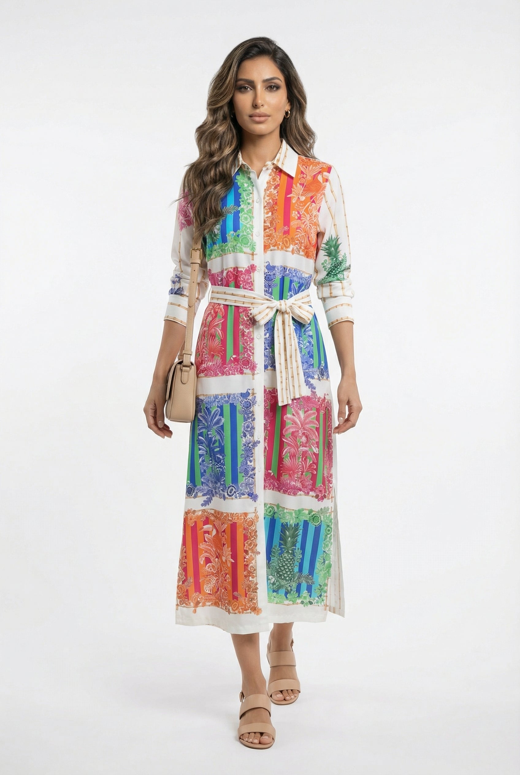 Collared Buttoned Patchwork Print Tencel Long Dress with detachable belt, colorful nature inspired motiff print, side slit, bamboo stalk back print details and three quarter buttoned sleeve