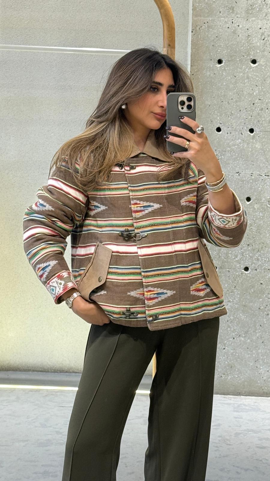 Placket Snap Buttoned Velvet Collared Quilted Jacket with 3 cherokee hooks details, multicolor lines, flap velvet pockets and long sleeve with embroidered cuff