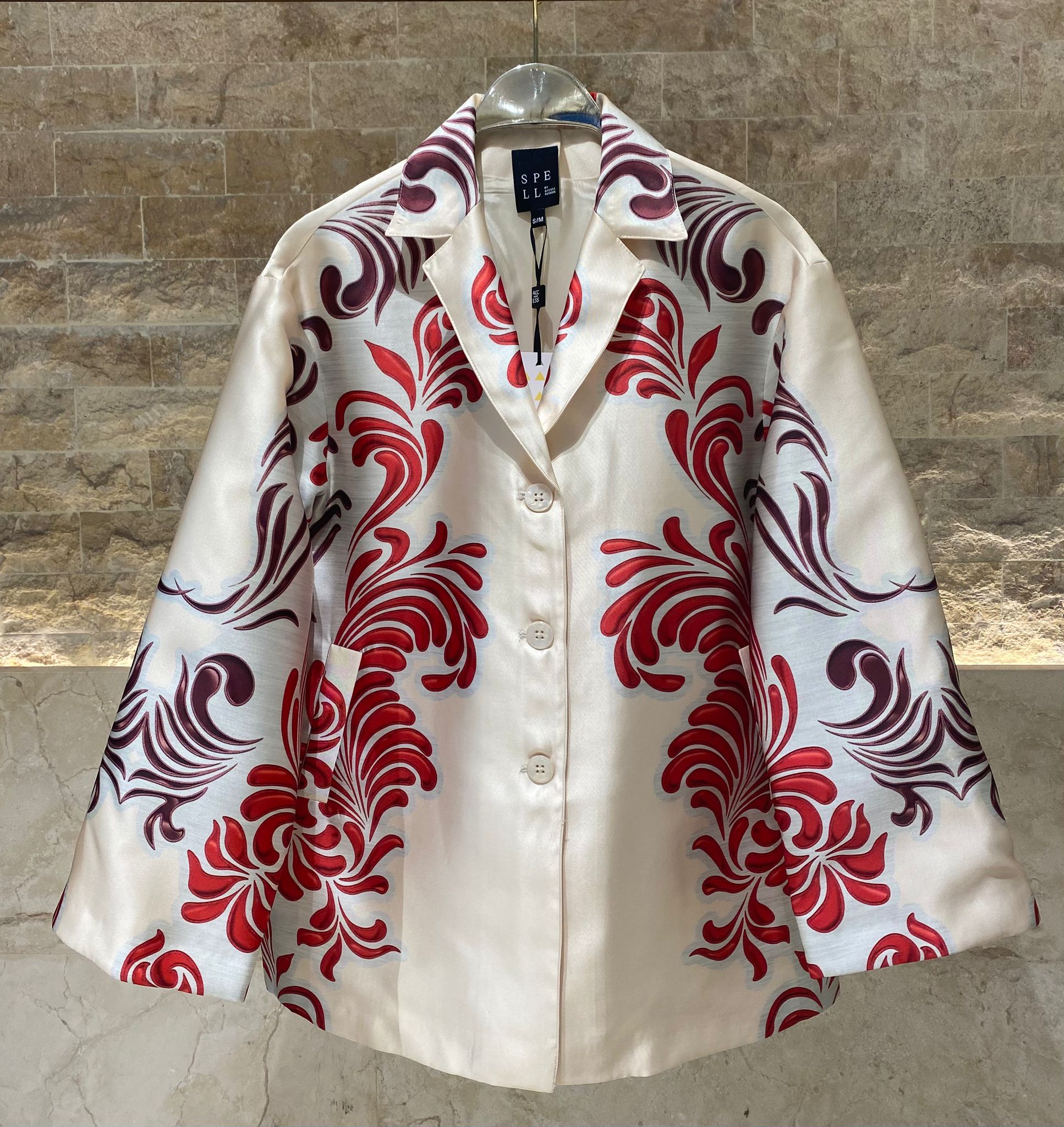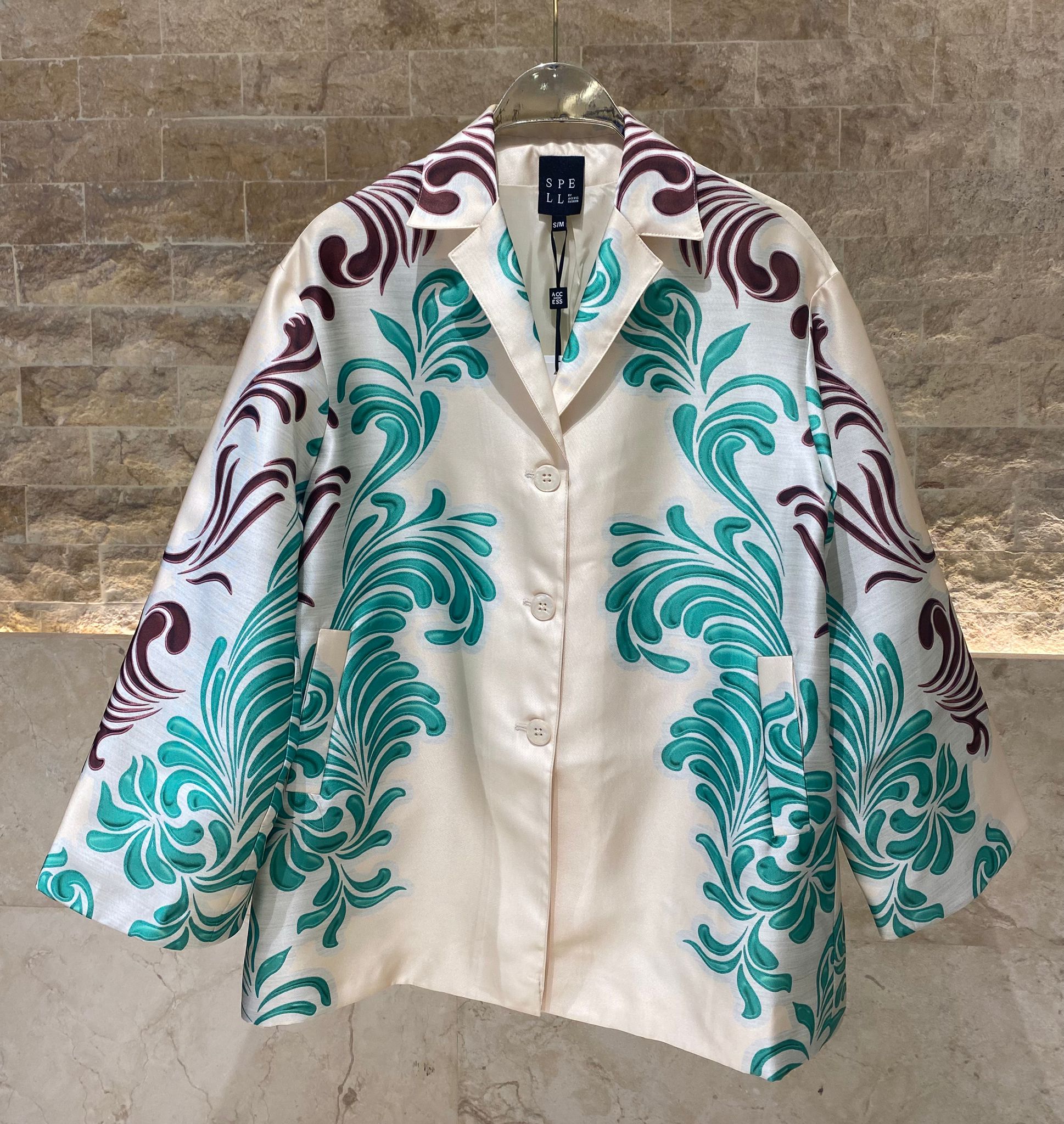 Notched Lapel Collared Buttoned Oversized Printed Jacket with side welt pockets and long sleeve