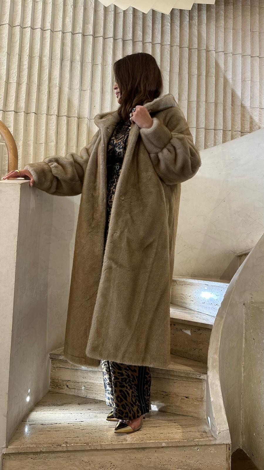 Isabella معطف طويل من الفرو الصناعي بغطاء للرأس