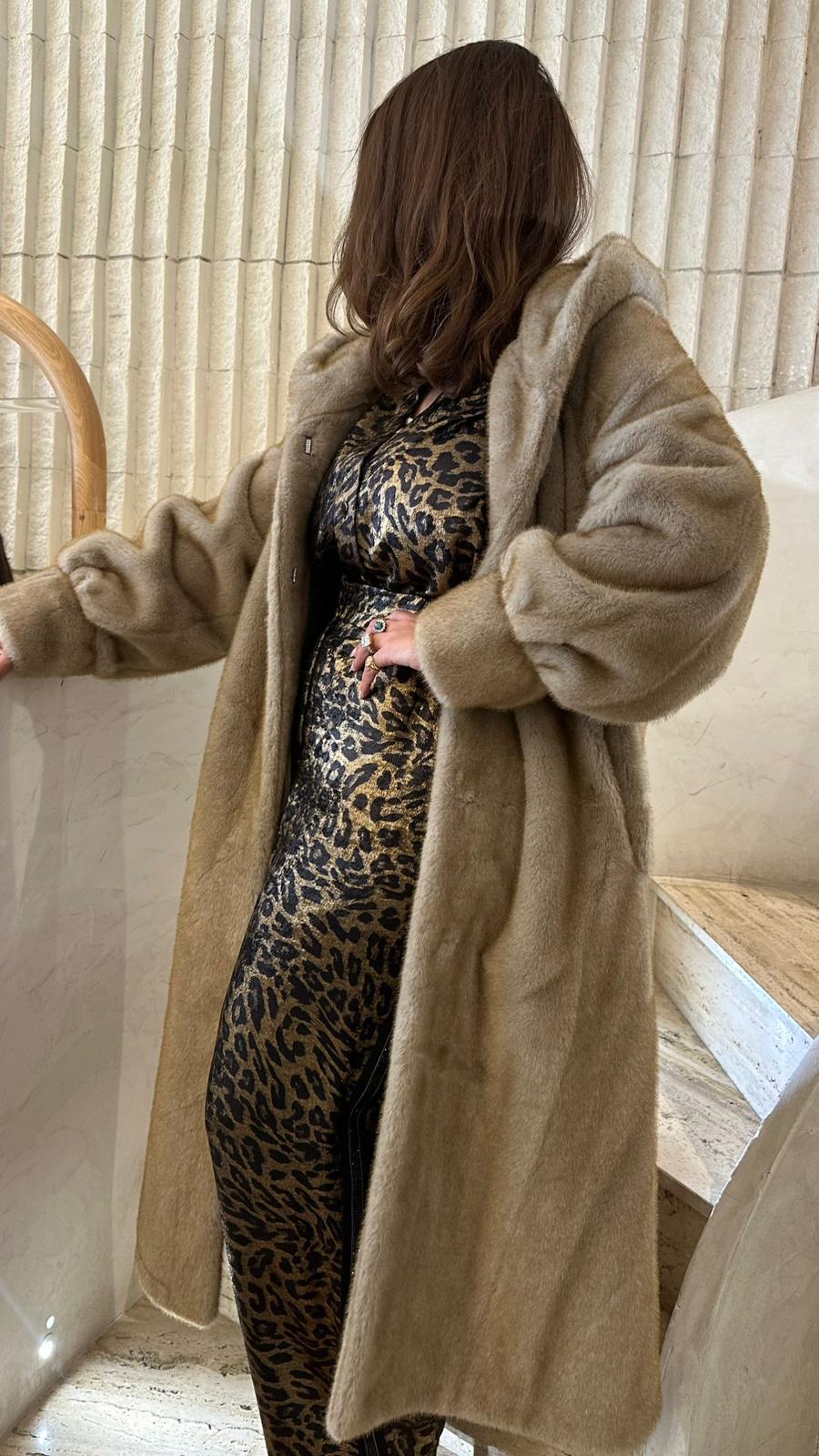 Hook Closure Hooded Oversized Cut Faux Fur Long Coat with slip side pockets and long wide sleeve with cuff