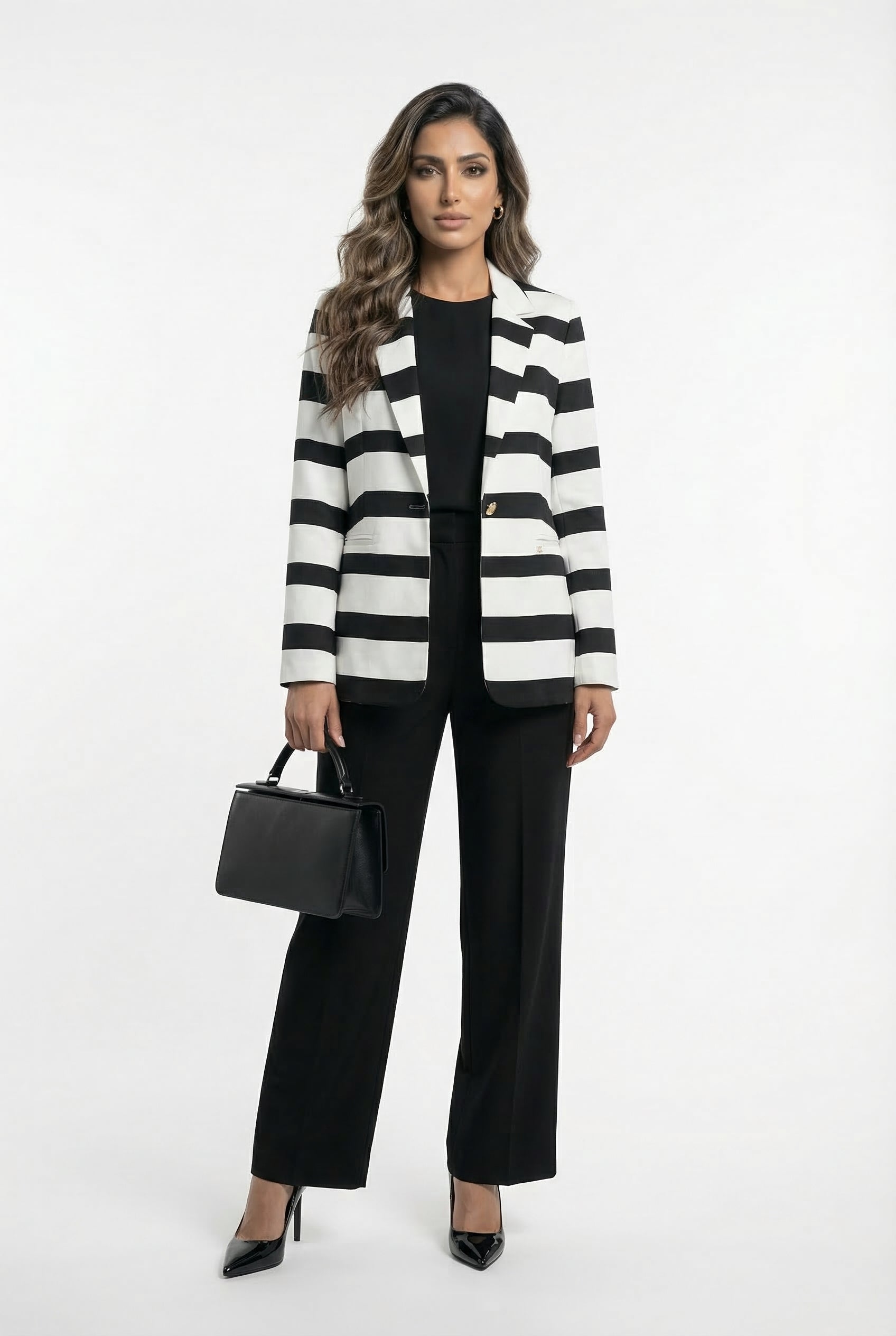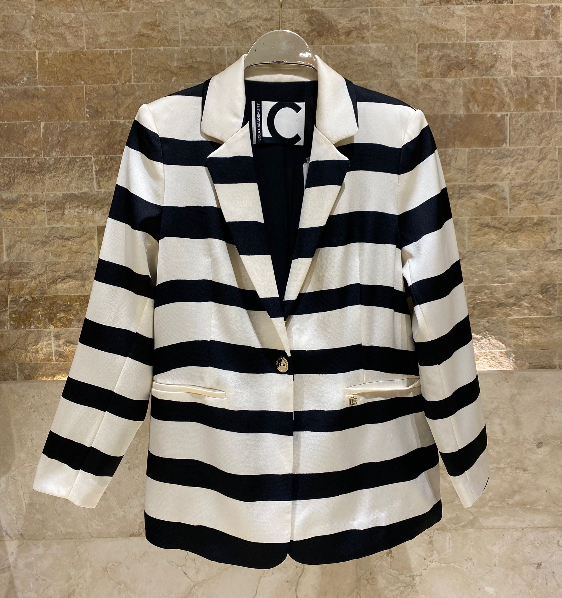 This LS2602032 Classic Lapel Collared Satin Jacket features a sophisticated cream and black stripe pattern that enhances any outfit. With its single button closure and tailored fit, it offers a polished look suitable for smart office wear or elegant evening outings. The padded shoulders and long sleeves add structure and style, while the welt pockets provide practical detailing.