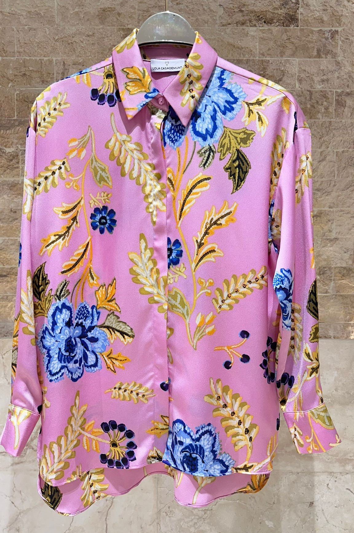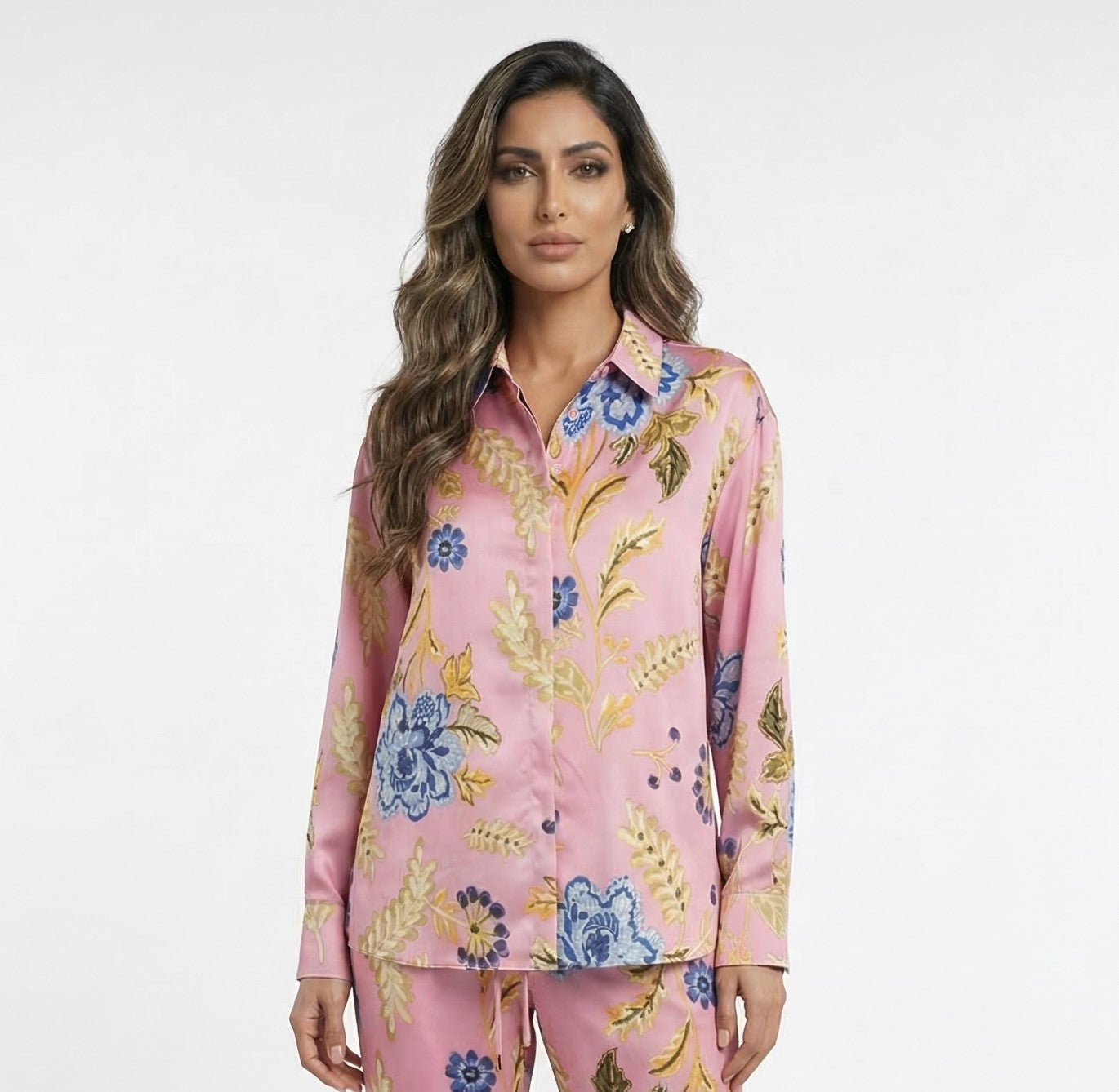 LS2615052 Placket Buttoned Floral Print Oversized Satin Shirt