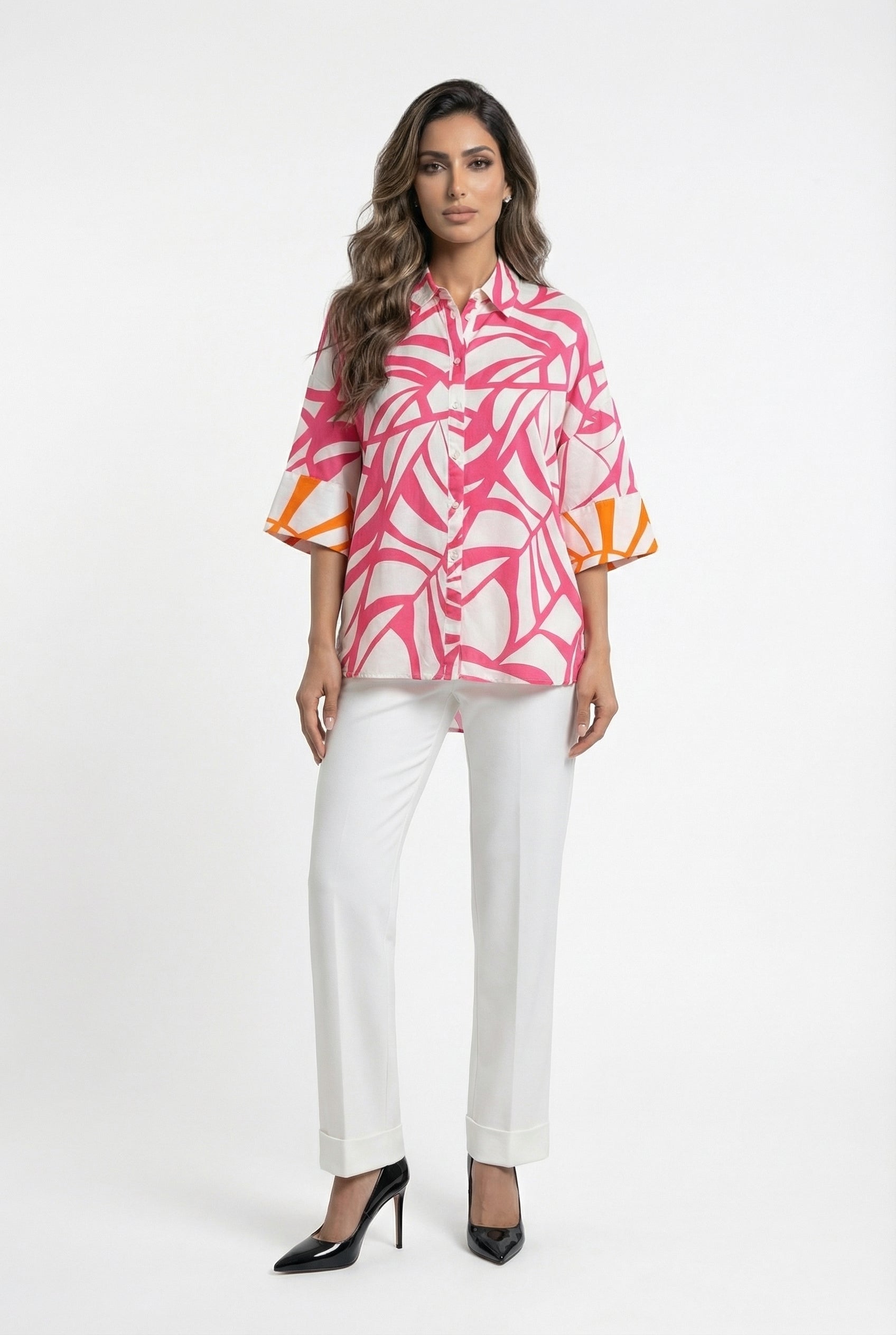 Buttoned Collared Oversized Distinctive Pink Leaf Print Shirt with drop shoulder and wide short sleeve with orange cuff details