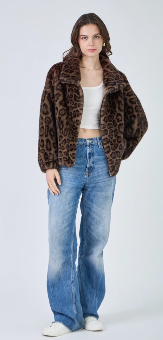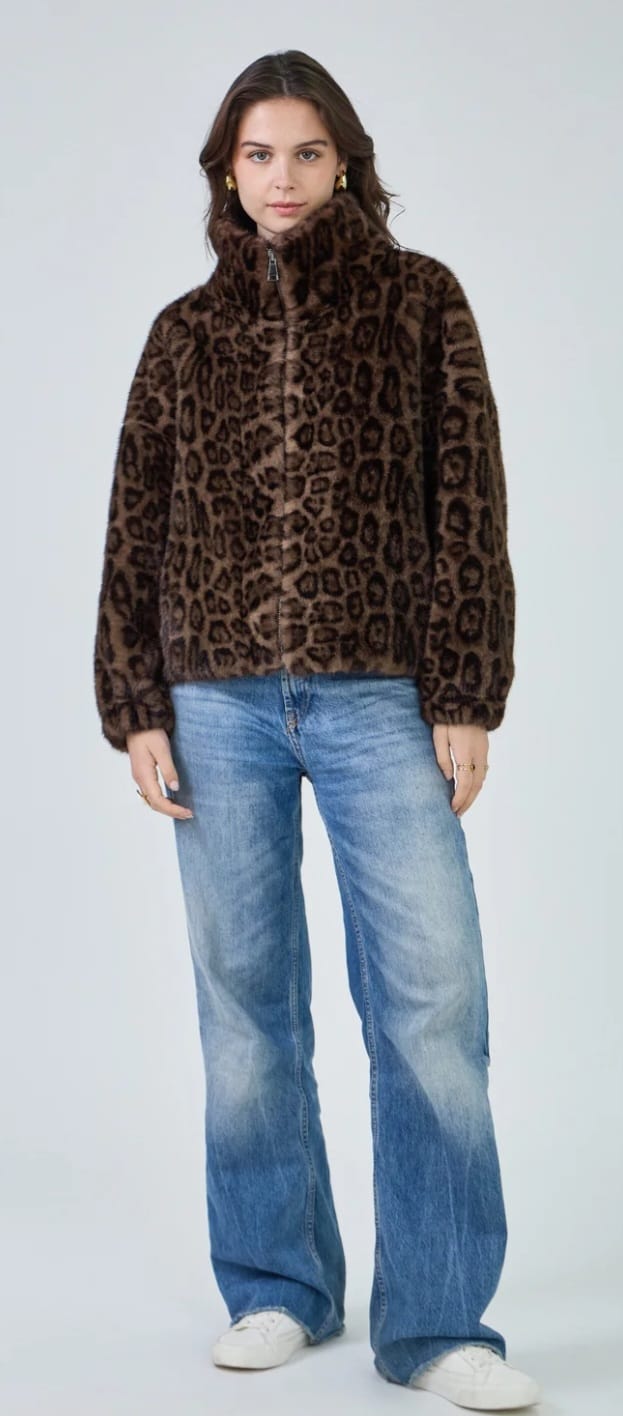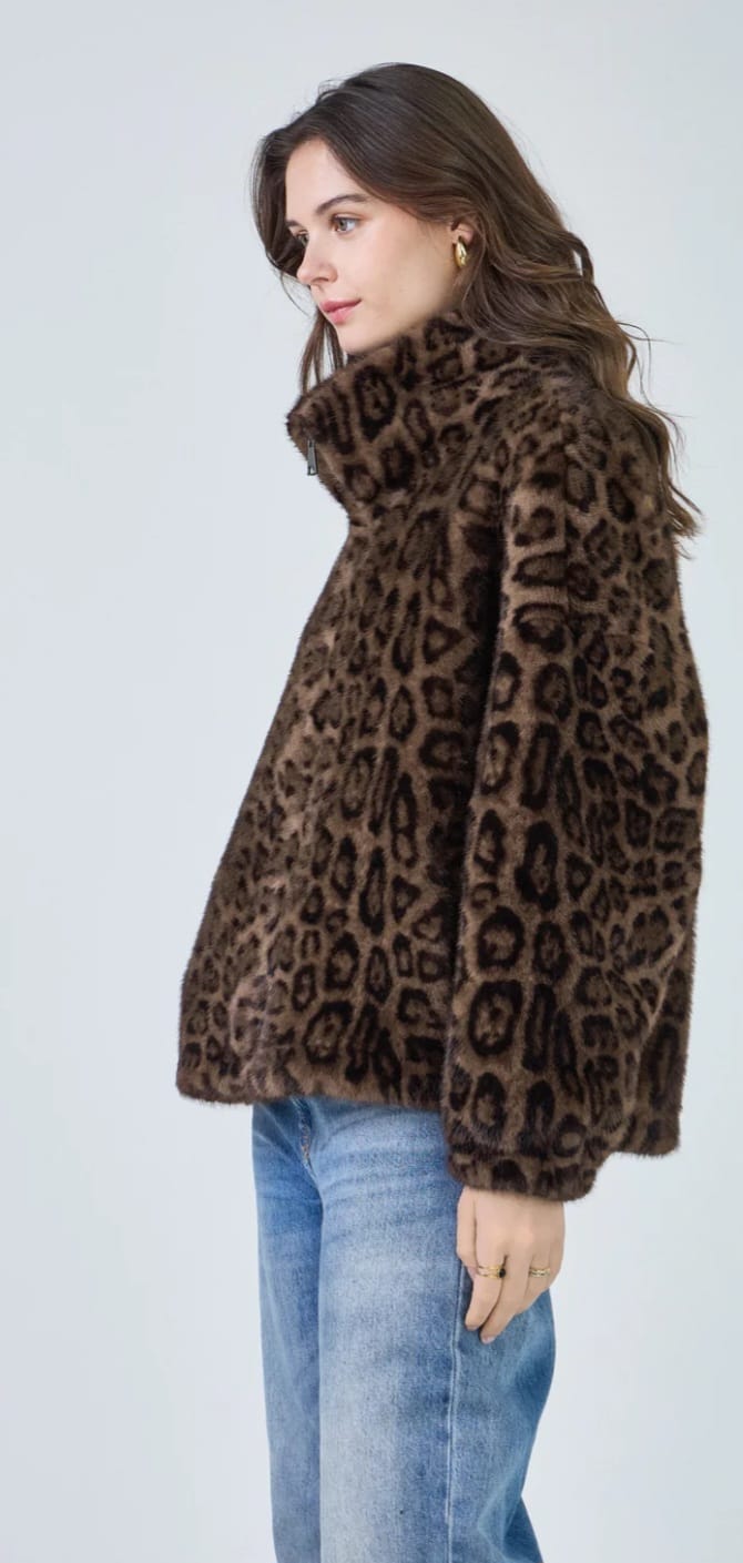 Zippered Closure Soft High Collar Leopard Print Oversized Short Faux Fur Jacket with drop shoulder, slip side pockets and long puffed sleeve