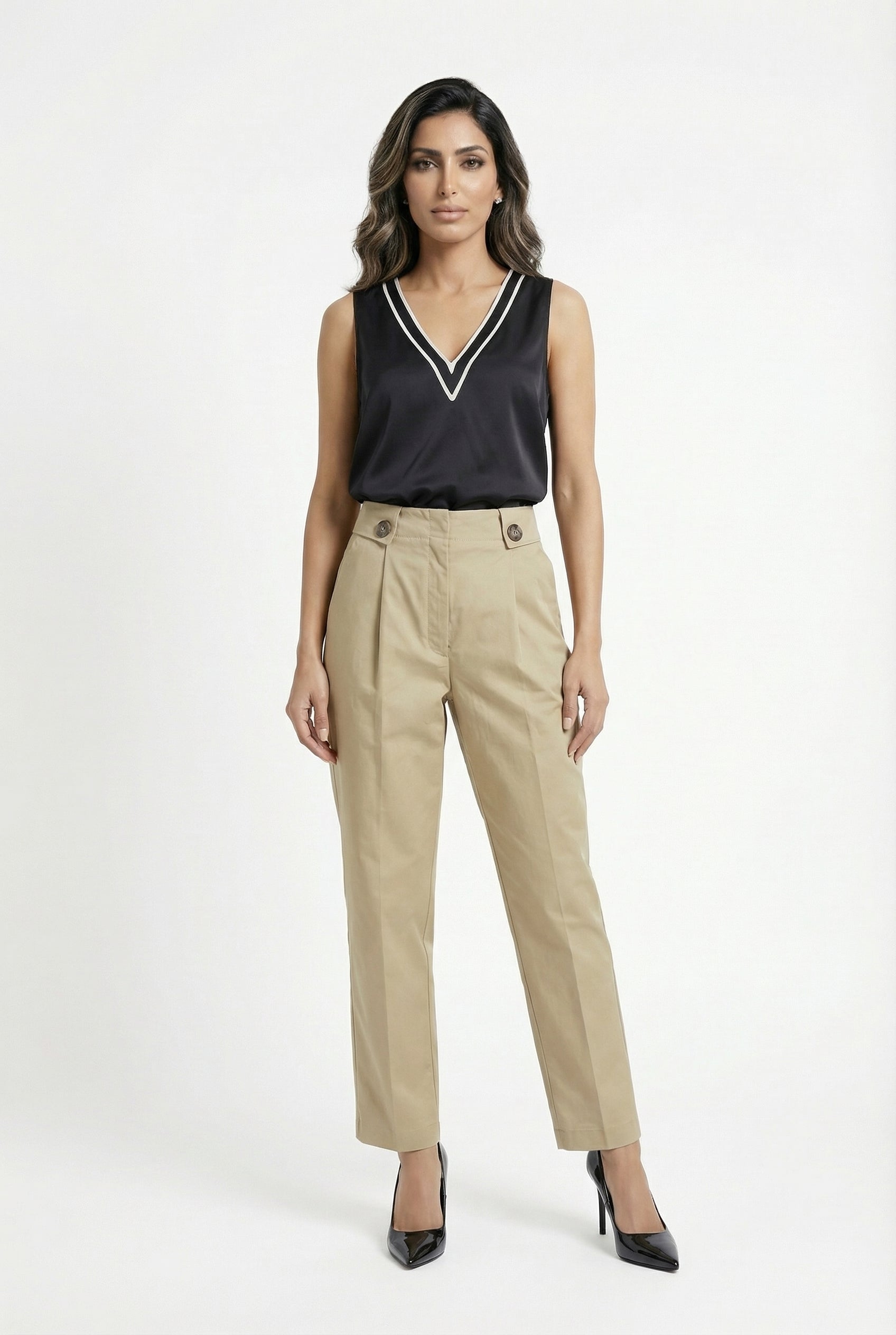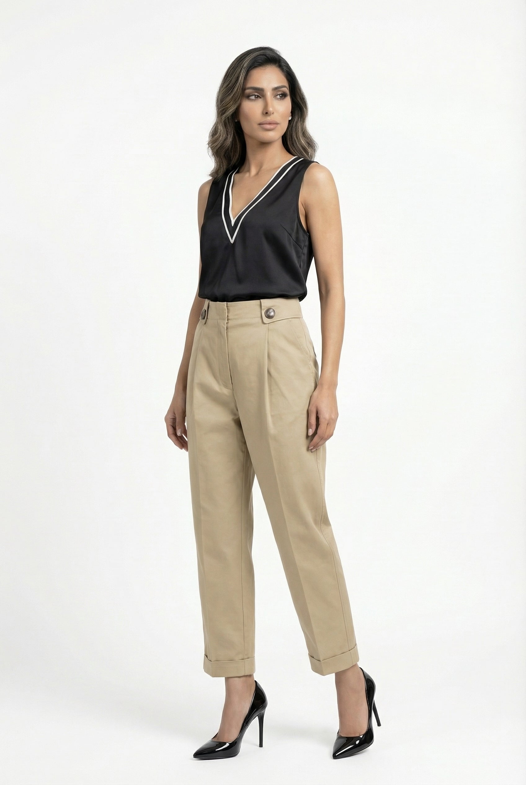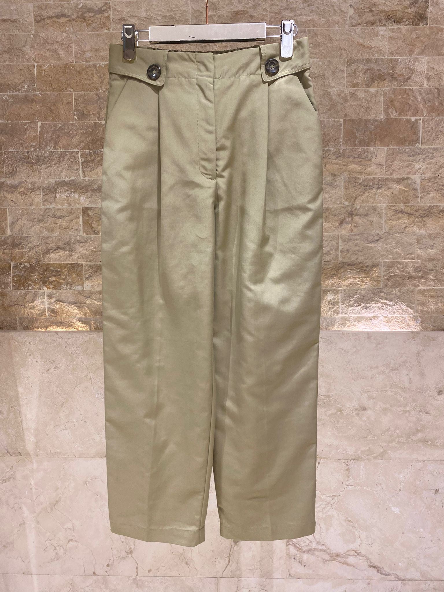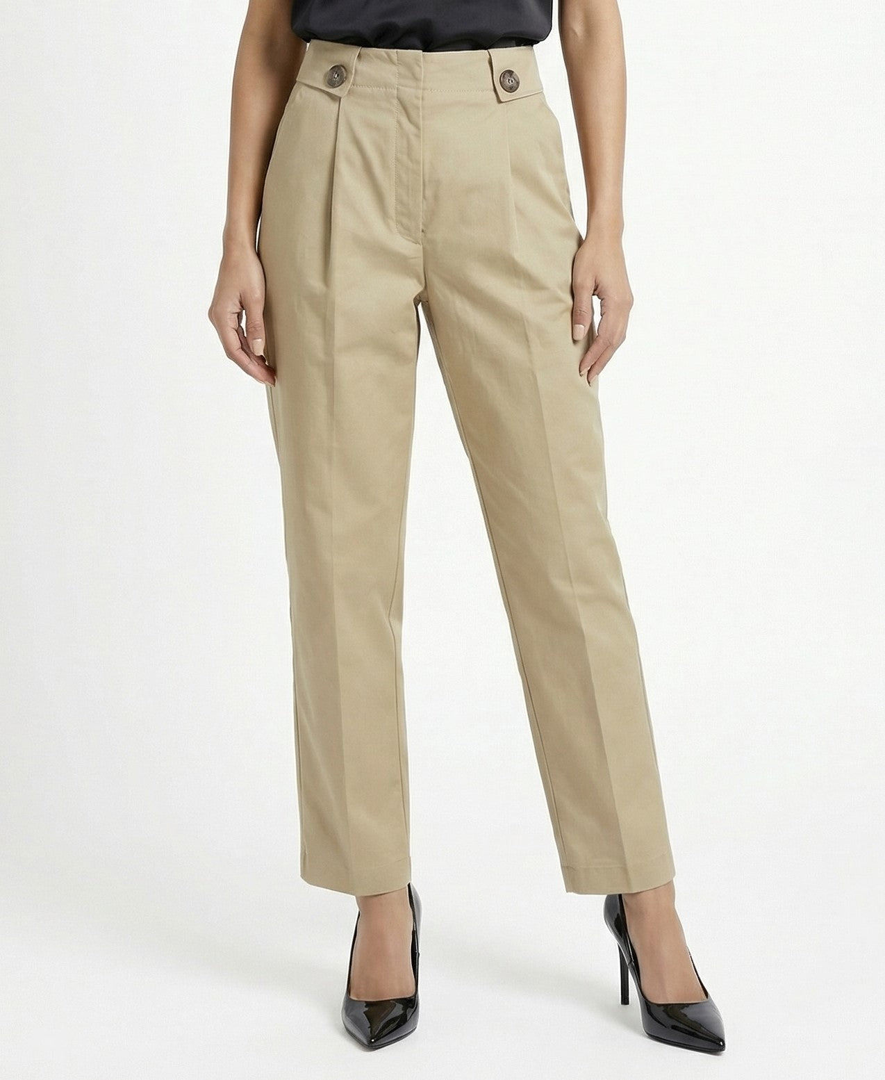 Zippered Hook and Eye Pleats Wide Leg Pants with wide band and buttons detailed, slip pockets, elastic waistband back details and welt back pockets