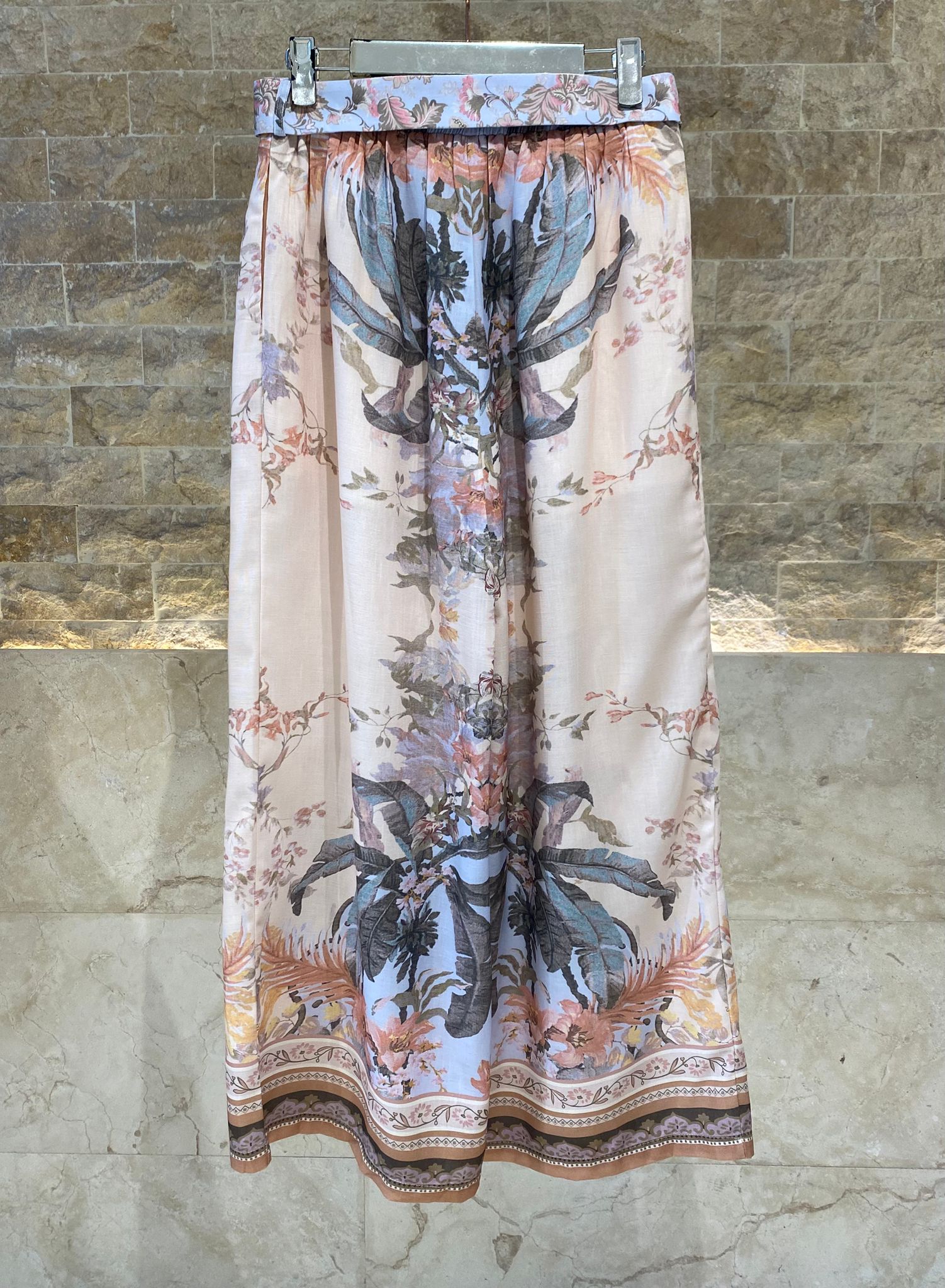 Floral and Fauna Print Wide Leg Belted Pants with front pleats detailed, slip pockets and elastic back waistband details