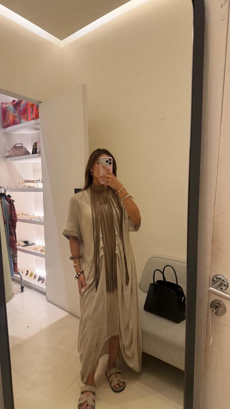 S373/0406 Loose Fit Dress crafted from luxurious viscose satin, designed for ultimate comfort and elegance. Featuring a deep V neckline and cold-dyed finish, this dress showcases a modern touch. The central seam pleats enhance its relaxed silhouette, while the short sleeves add a stylish flair.