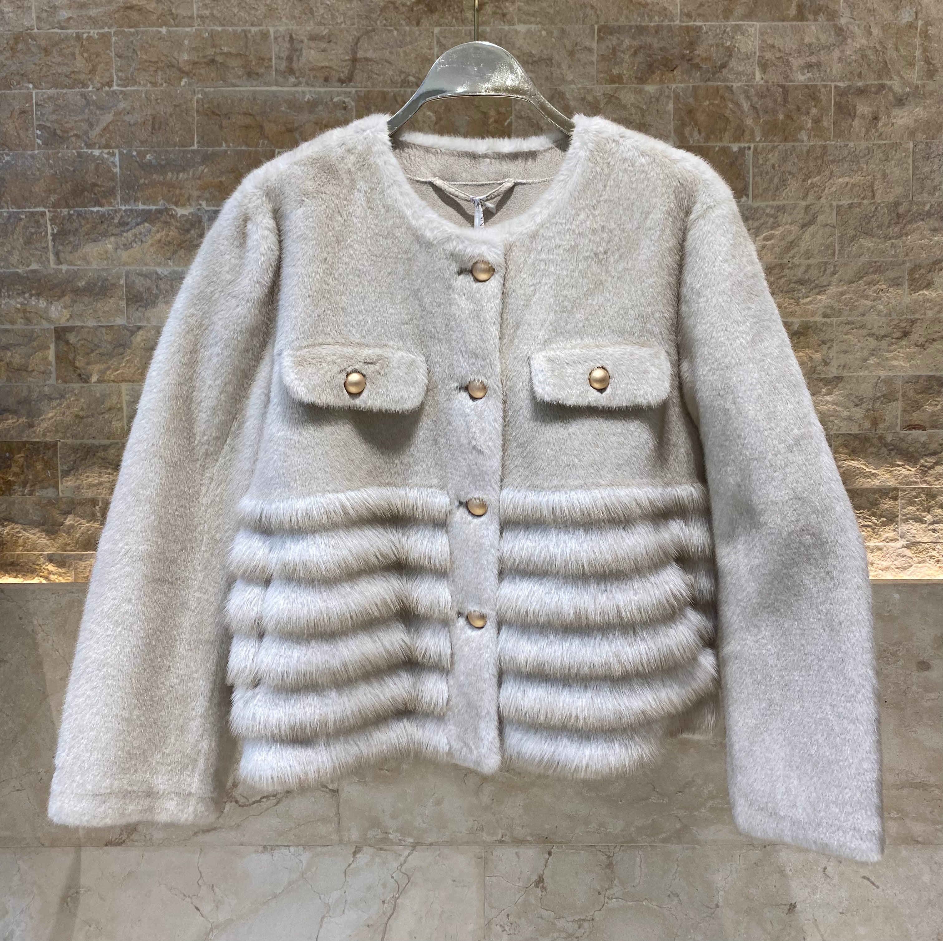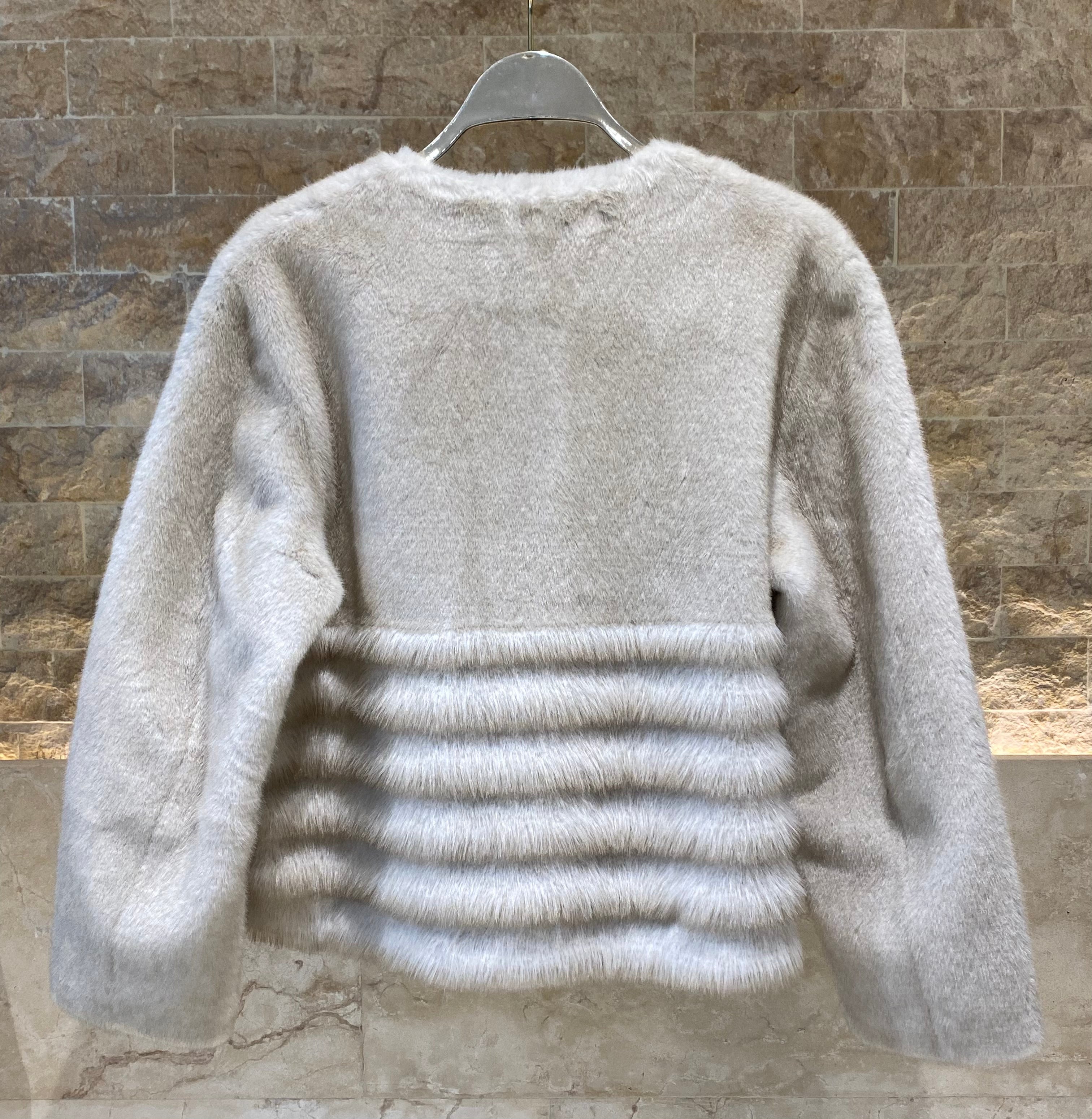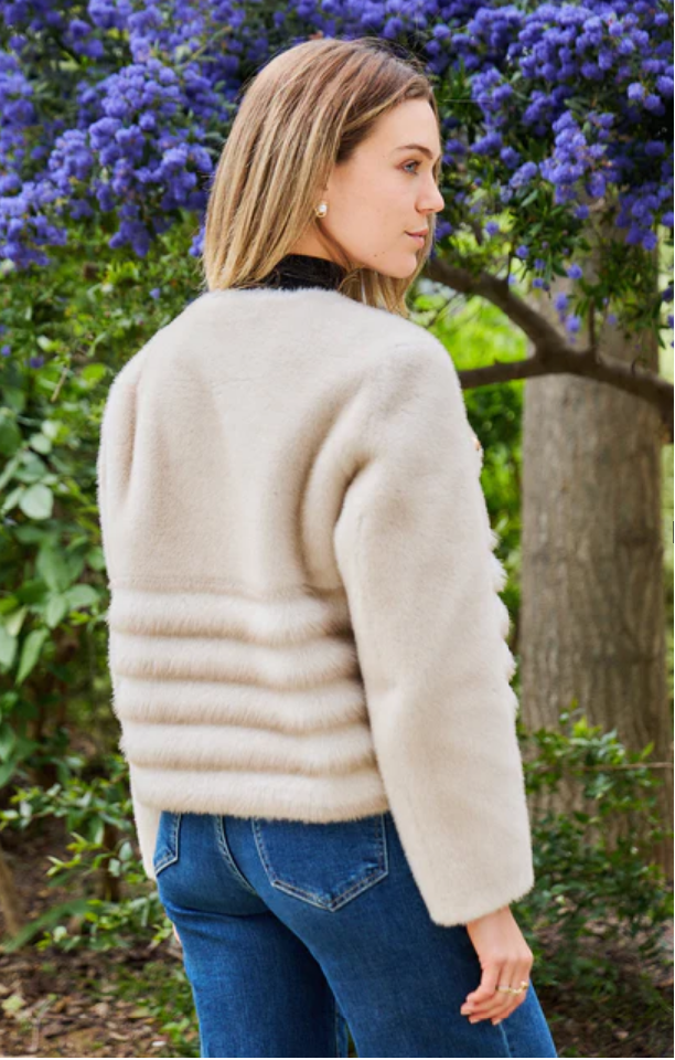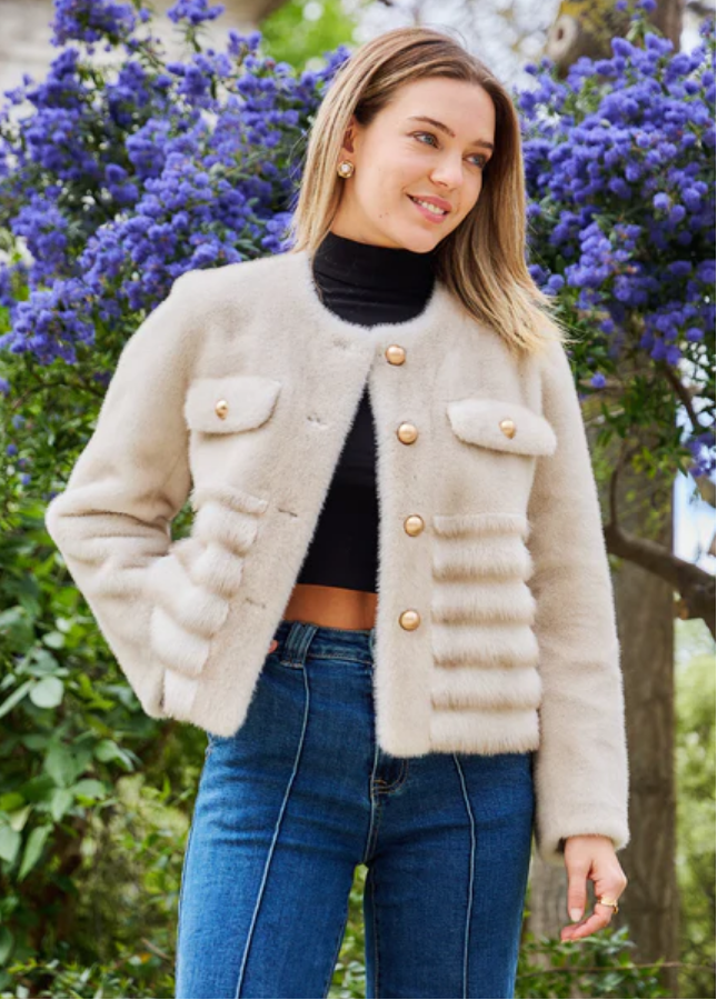 Round Neckline Buttoned Short Straight Cut Faux Fur Jacket with flap button details and long sleeve