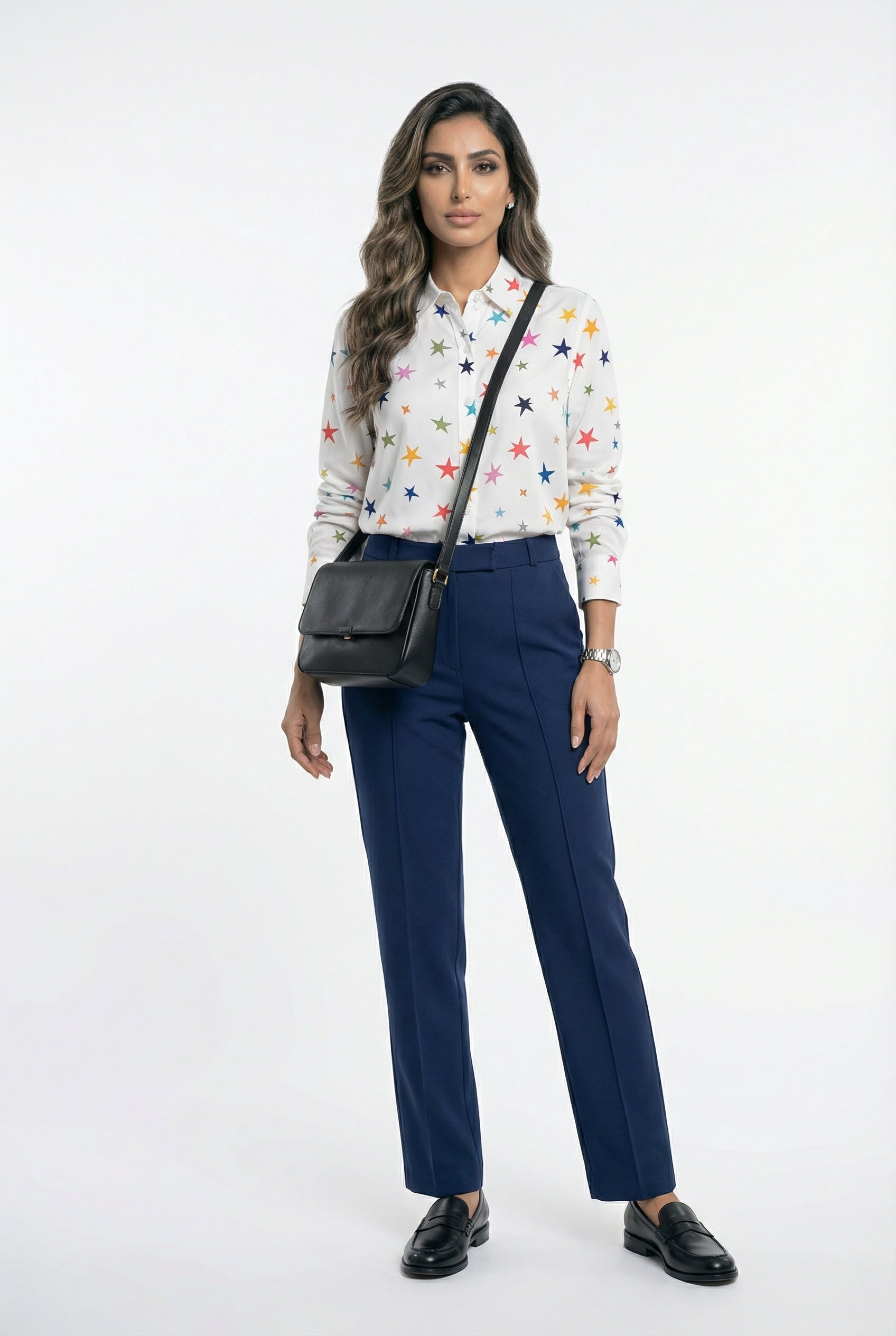 - Style: Mid-rise waist with belt loops