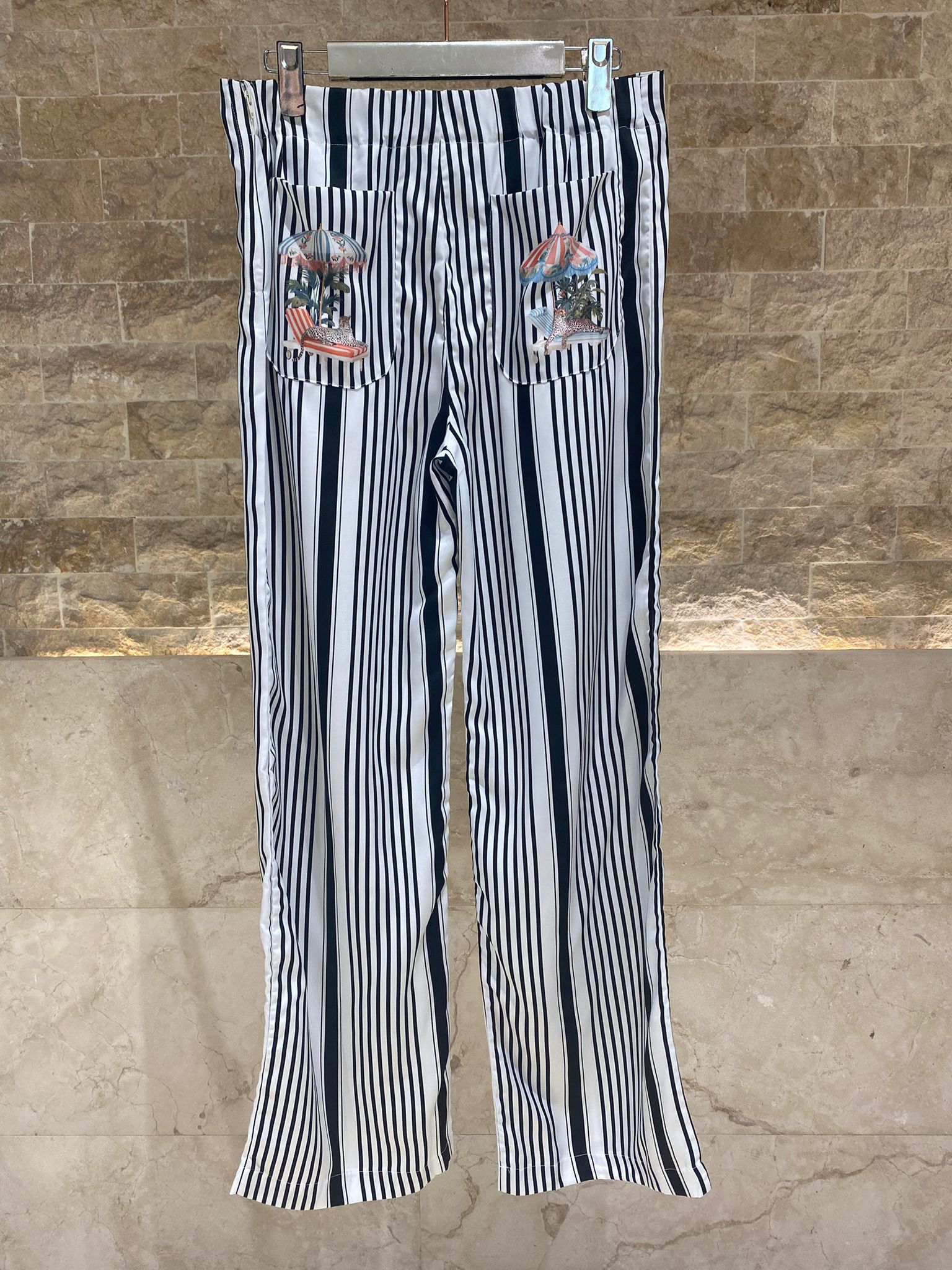 33650 Vertical Striped Pants feature a modern straight cut with a wide leg design. The striking black and white vertical stripes create an elongating silhouette, making them perfect for both casual and smart-casual outfits. These pants are equipped with a convenient side zipper, slip pockets, and an elastic back waistband for a comfortable fit. The two back patch pockets add a unique flair with playful cheetah and umbrella print details.