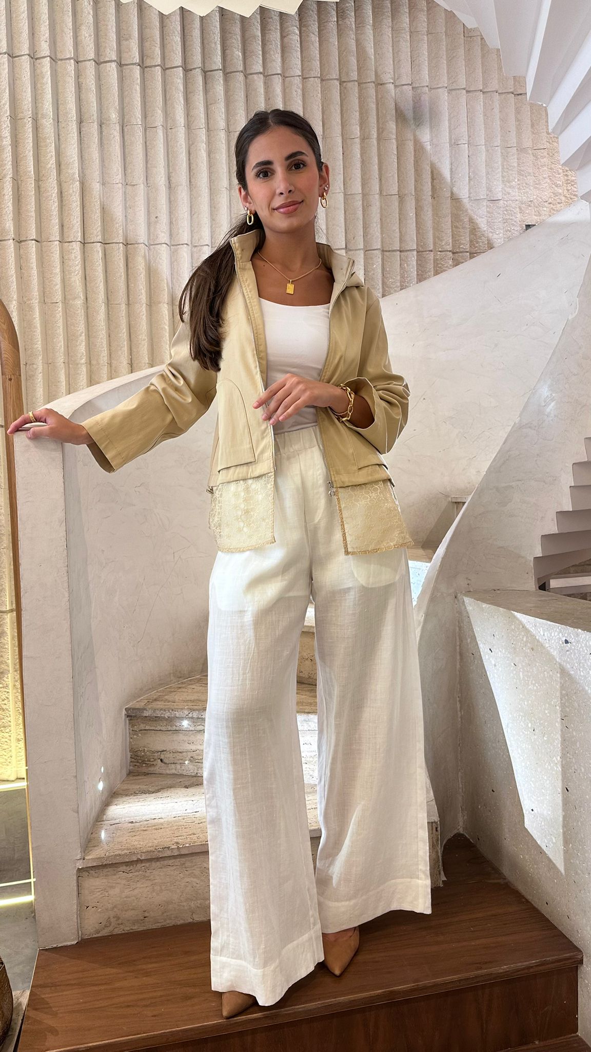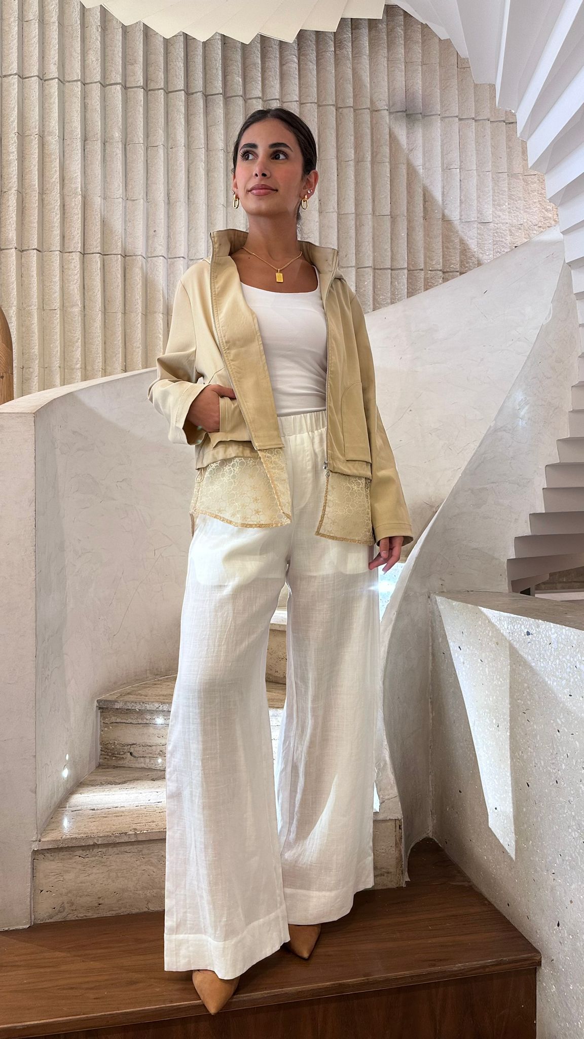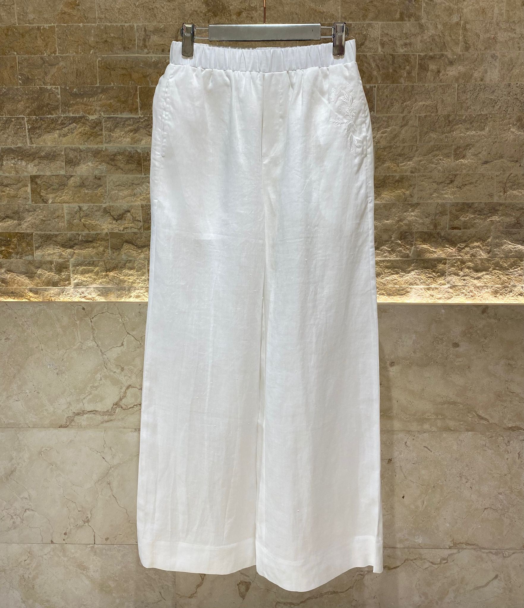 Elastic Waistband Wide Leg Linen Pants with embroidered side pockets details, slip pockets and back welt details