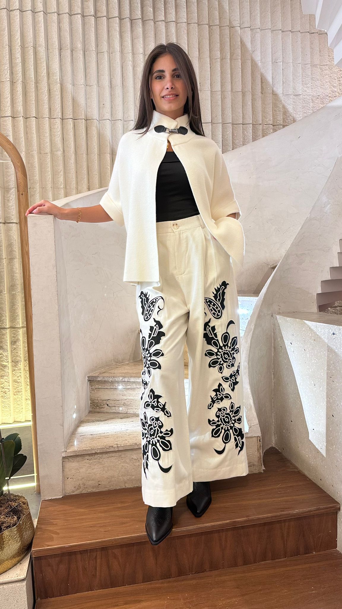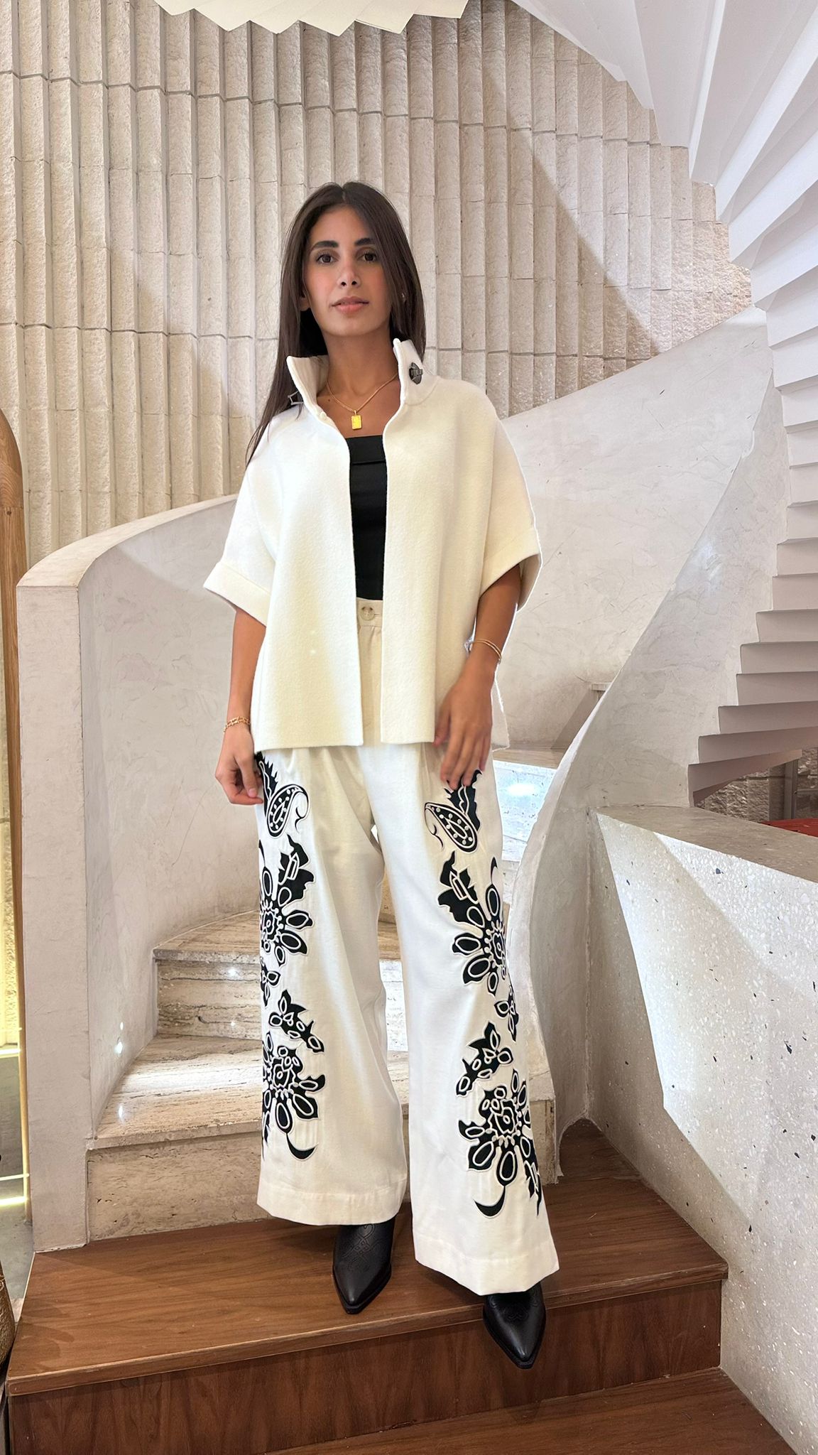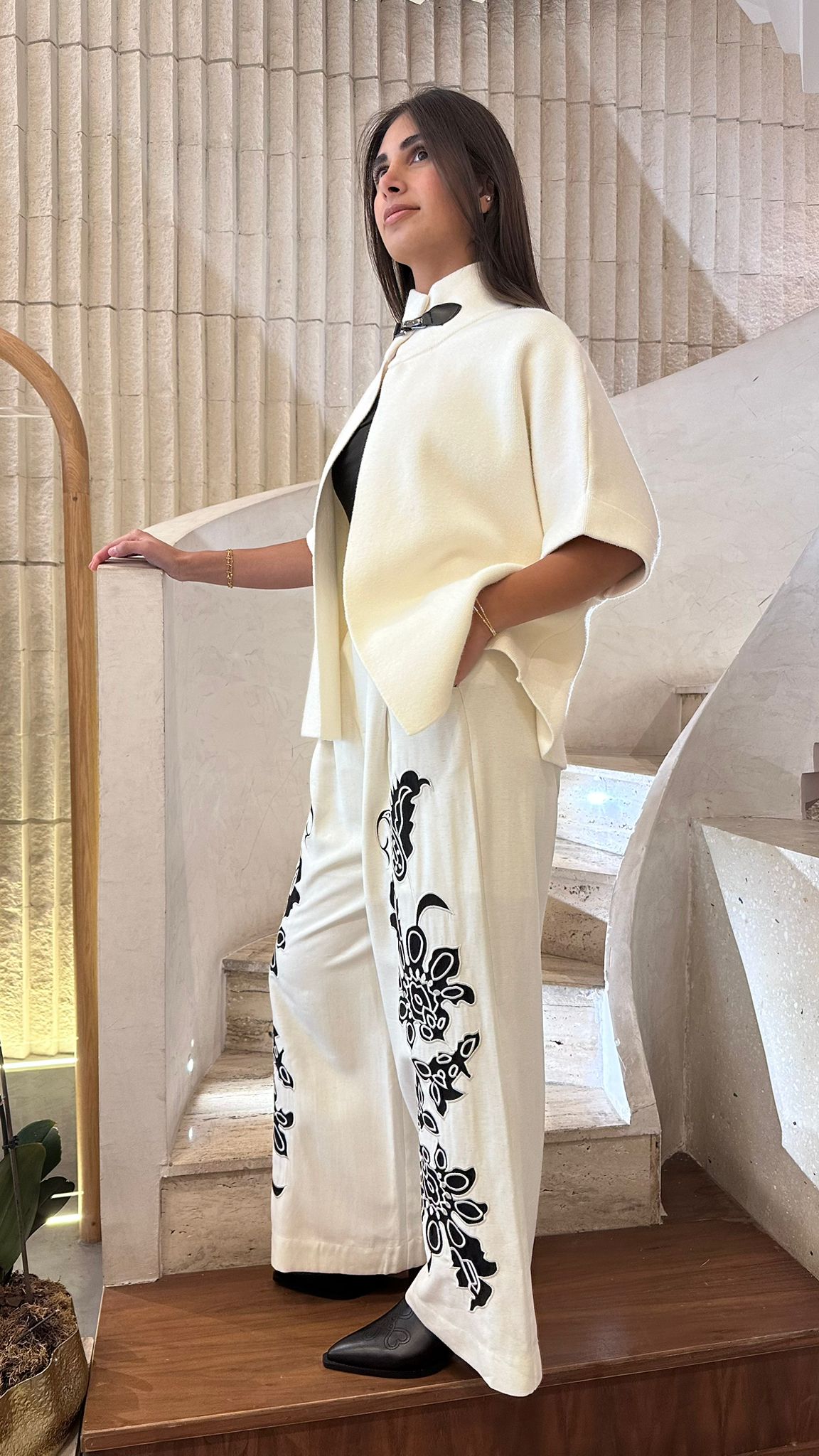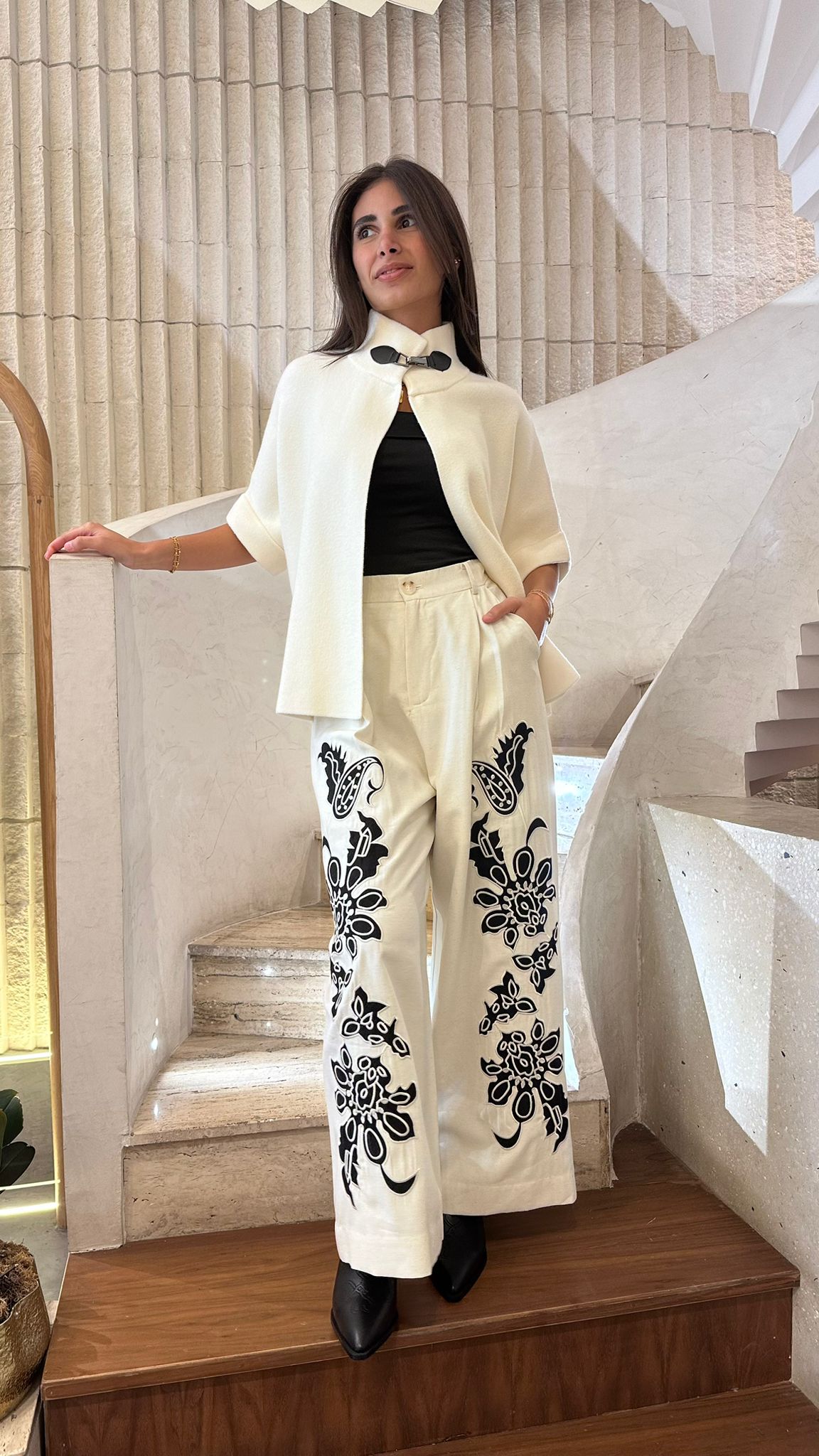 MJ253241 بنطال واسع الساق بنقشة مطرزة بألوان متباينة فنية
