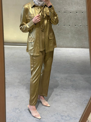 Buttoned Collared Laminated Shirt with four front flap pockets, long sleeve with buttoned cuff and adjustable gathered side and back details