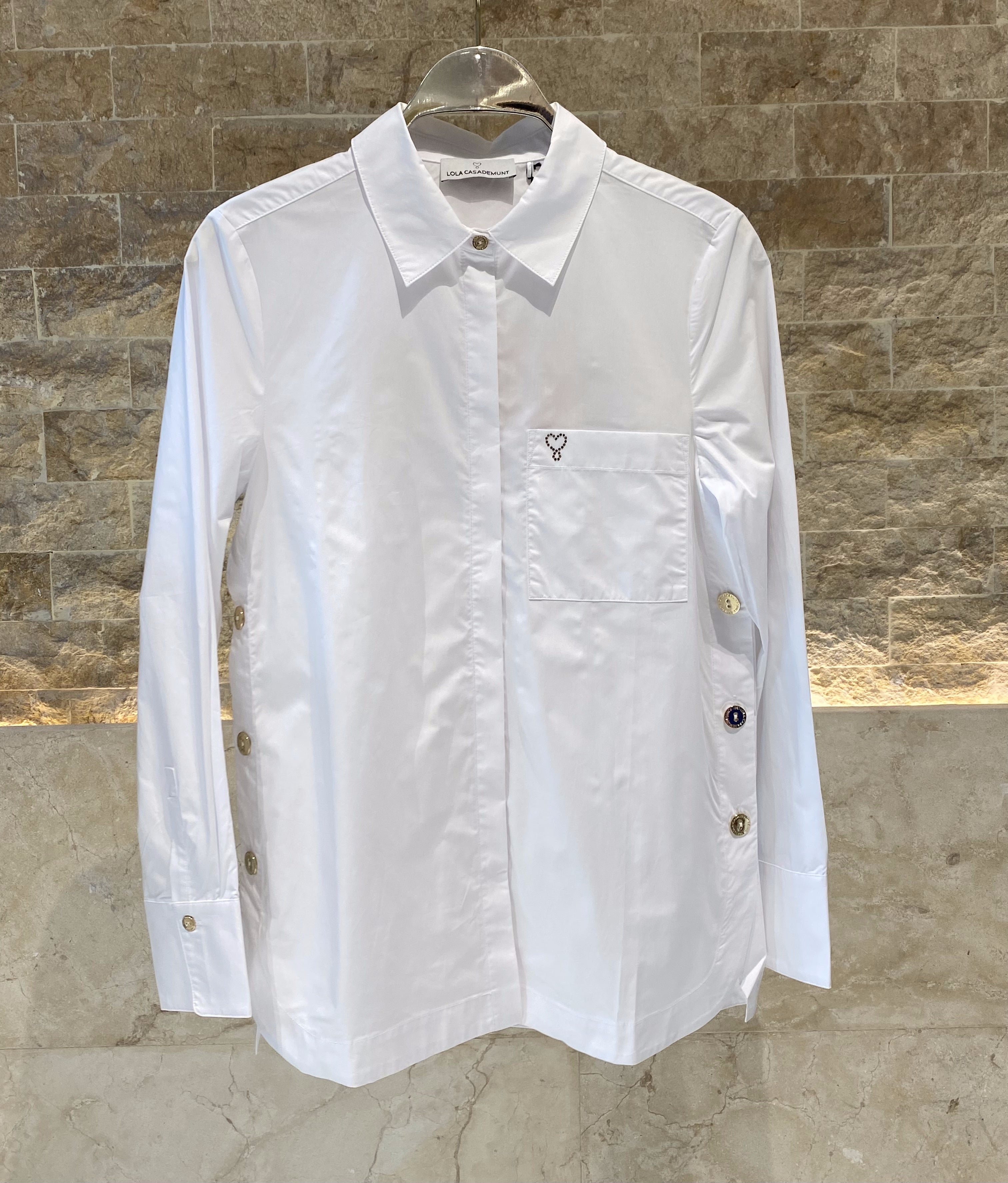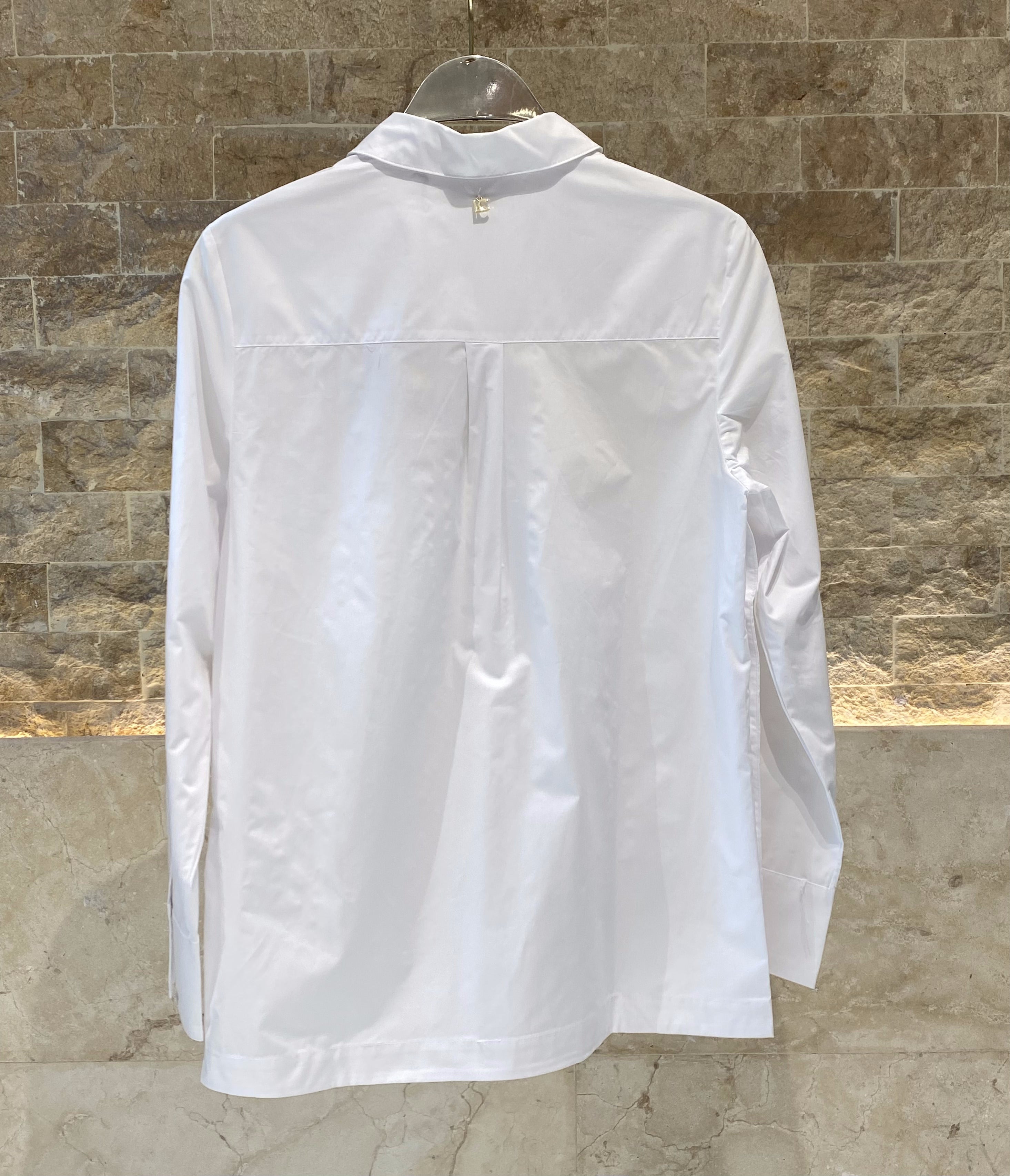 Buttoned Classic Collared Oversized Poplin Shirt with gold button side details, front patch pockets, curved front hem, straight back hem details and long sleeve with buttoned cuff