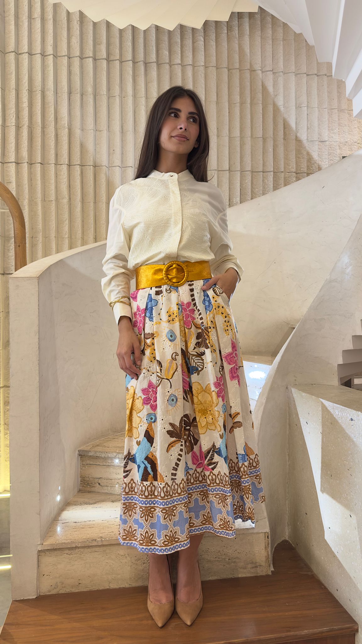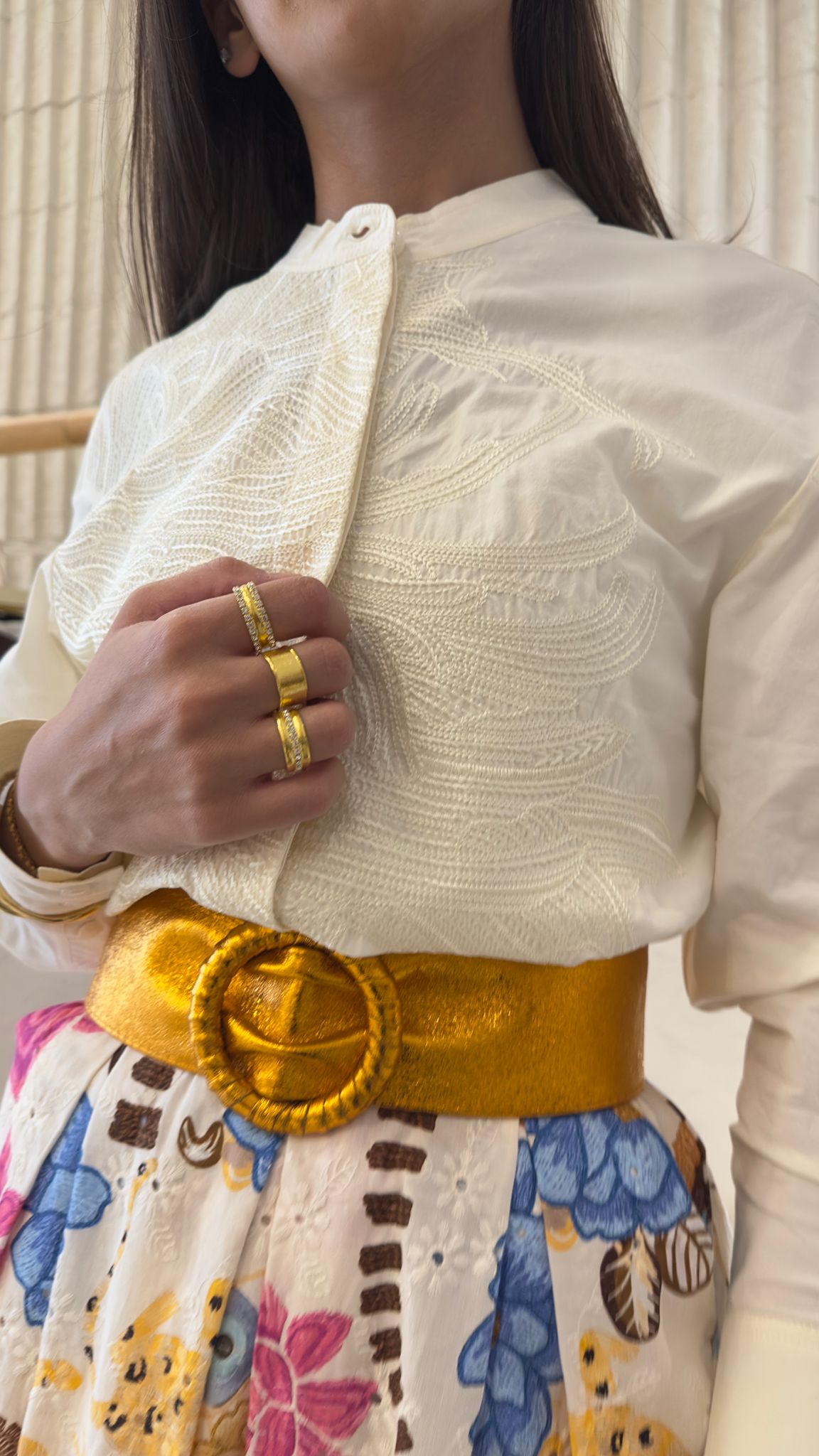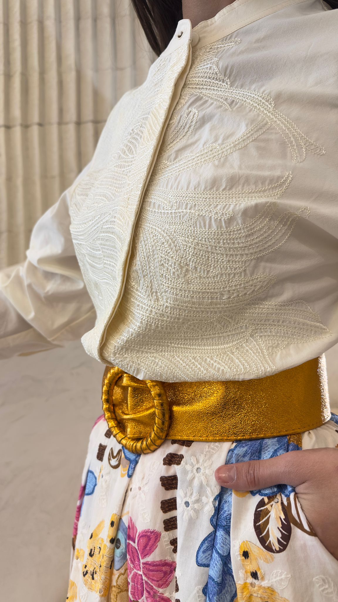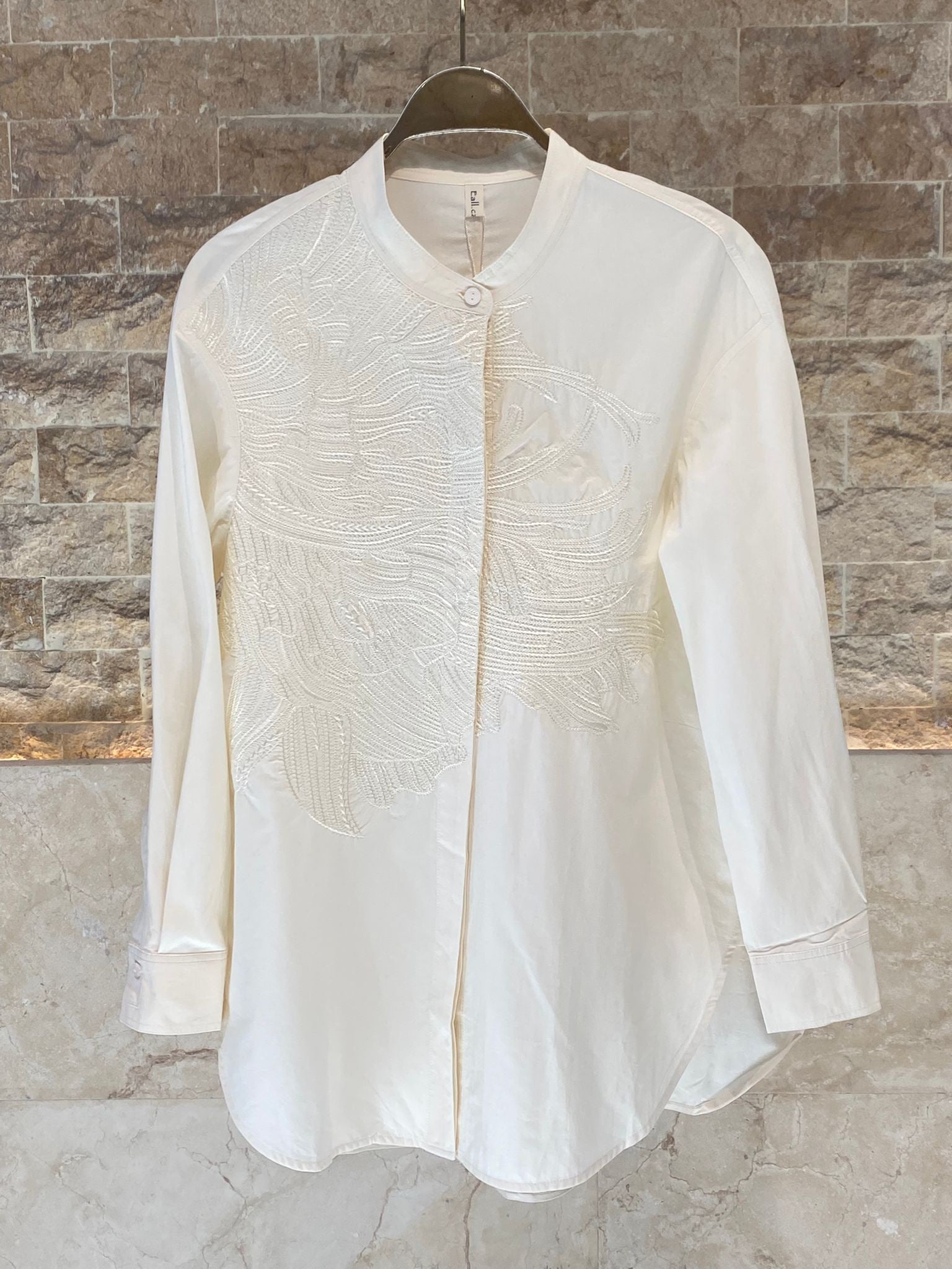 Buttoned Mao Collared Embroidered Loose Fit Cotton/Viscose Top with curved hem and long sleeve with buttoned cuff