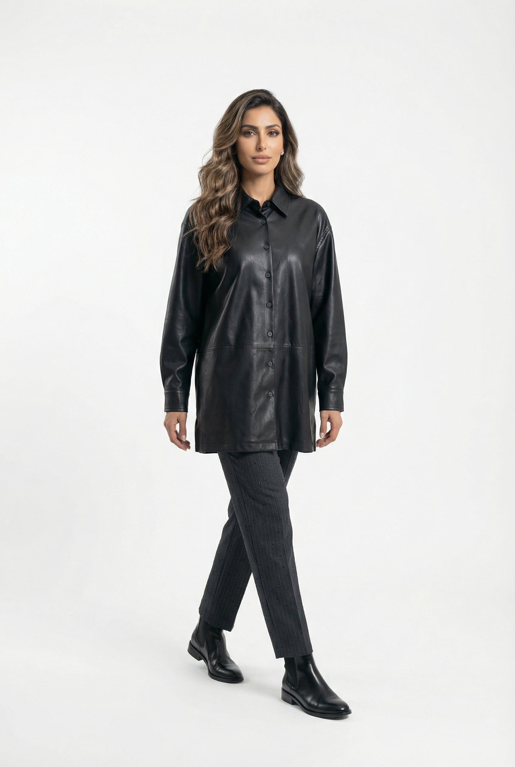54-7009 Faux Leather Long Shirt قميص طويل من الجلد الصناعي