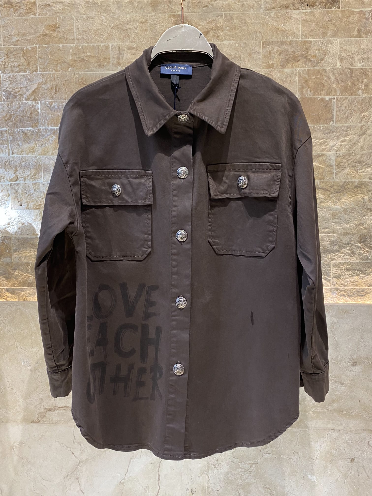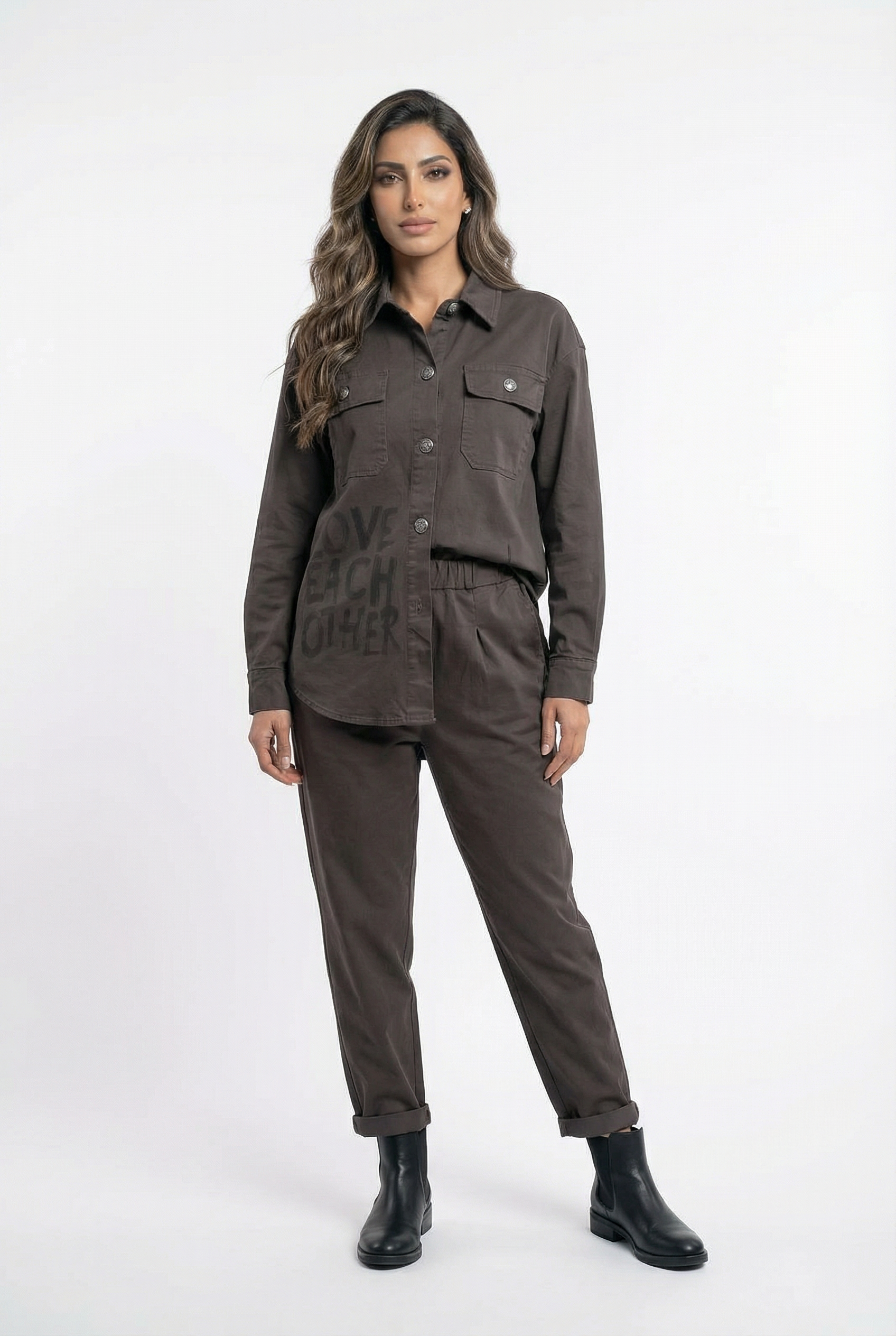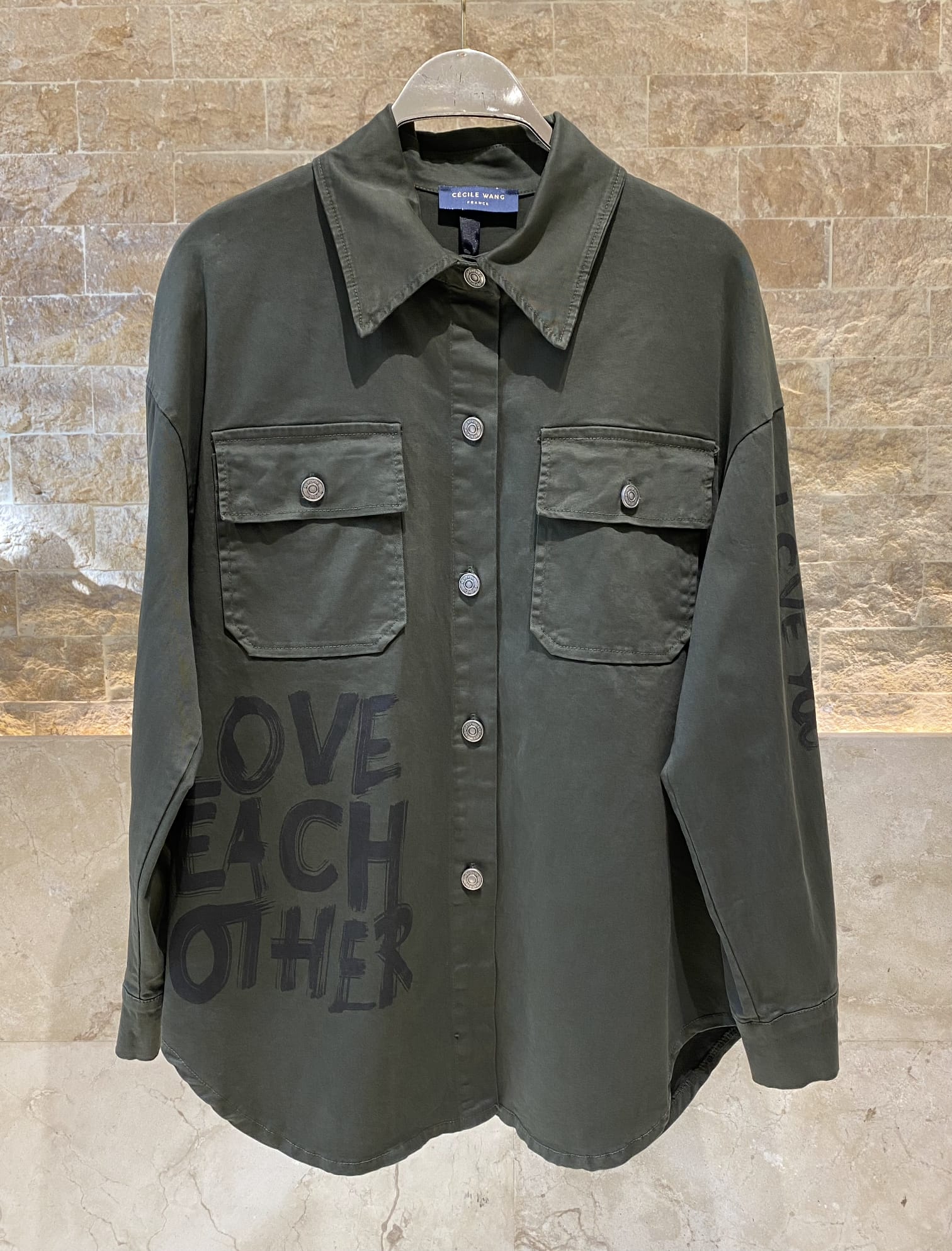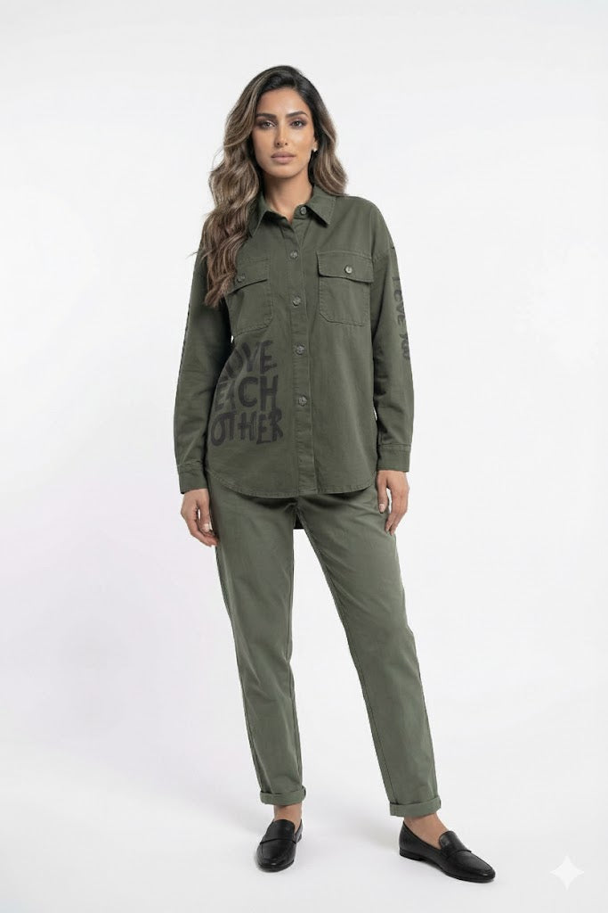 Buttoned Shirt Collared Shirt Jacket with LOVE EACH OTHER Prints, flap buttoned pockets, drop shoulder, curved hem, long sleeve with buttoned cuff and BE GOOD AND ALL LOVE YOU details and WOMEN LIFE FREEDOM BACK details