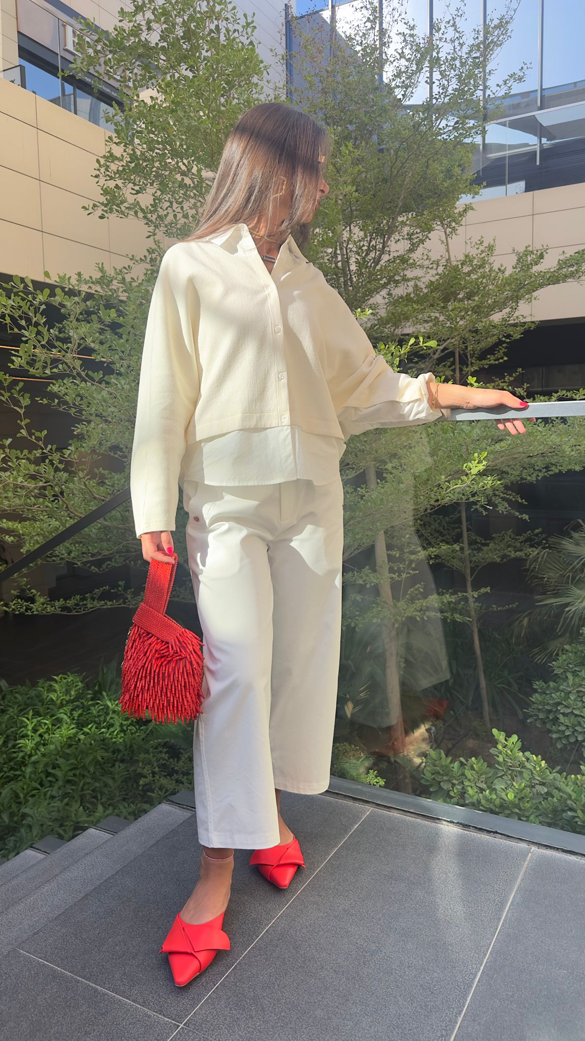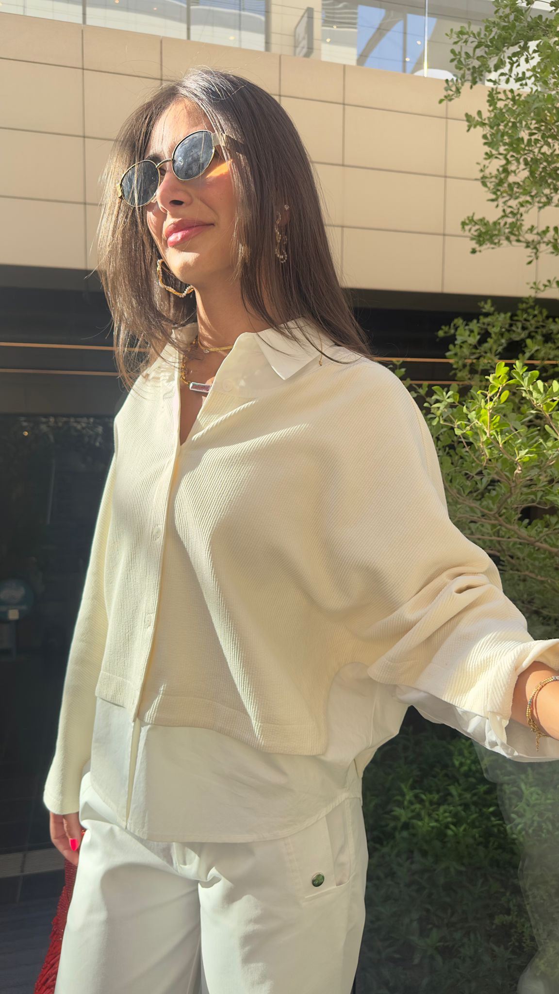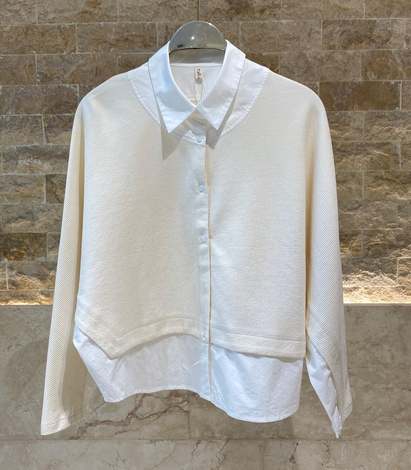 Buttoned White Collared Rib Short Shirt with white cotton hem details and long batwing rib sleeve with white cotton details