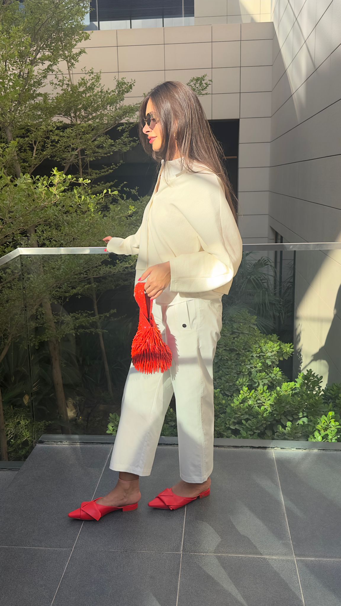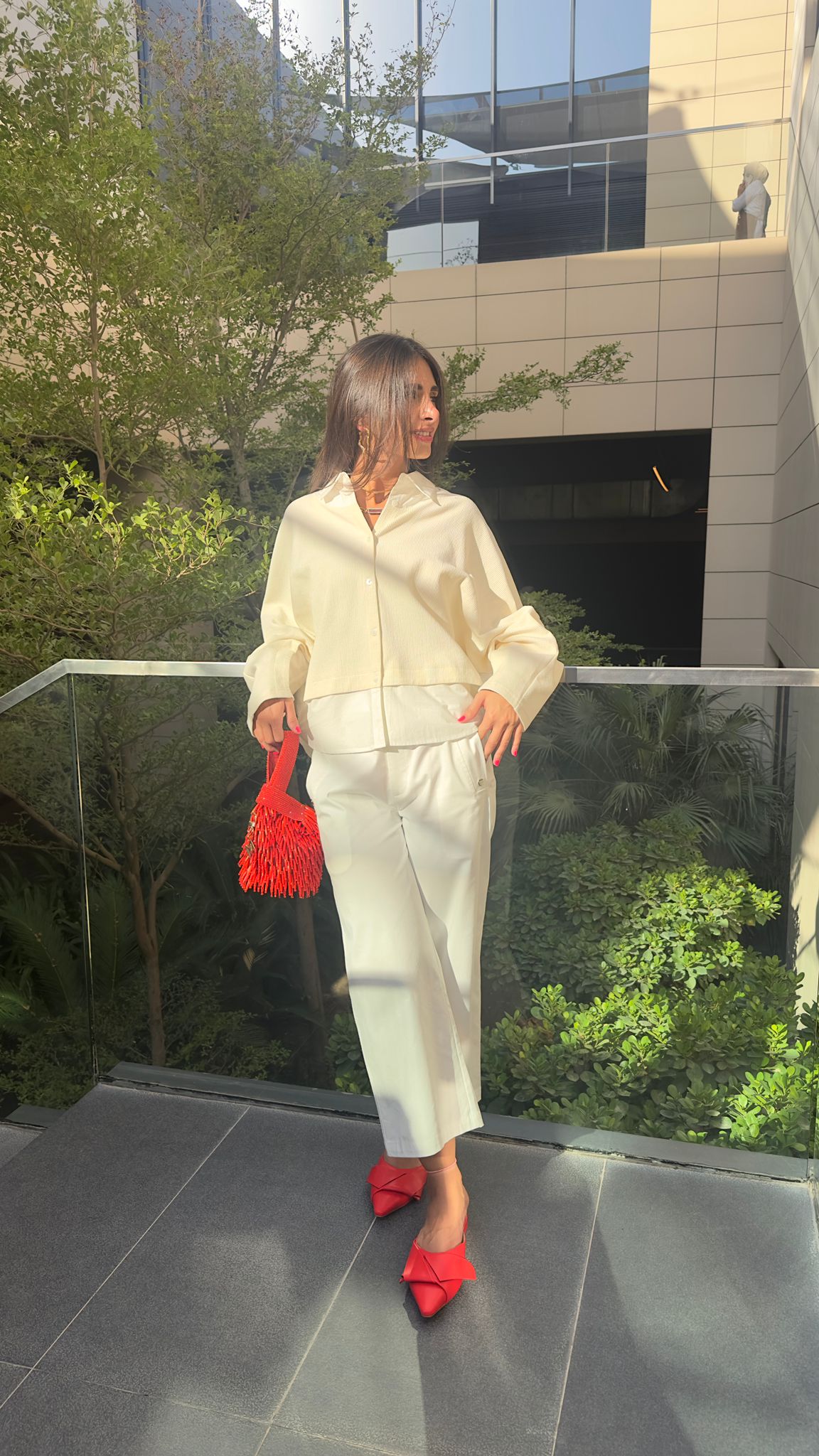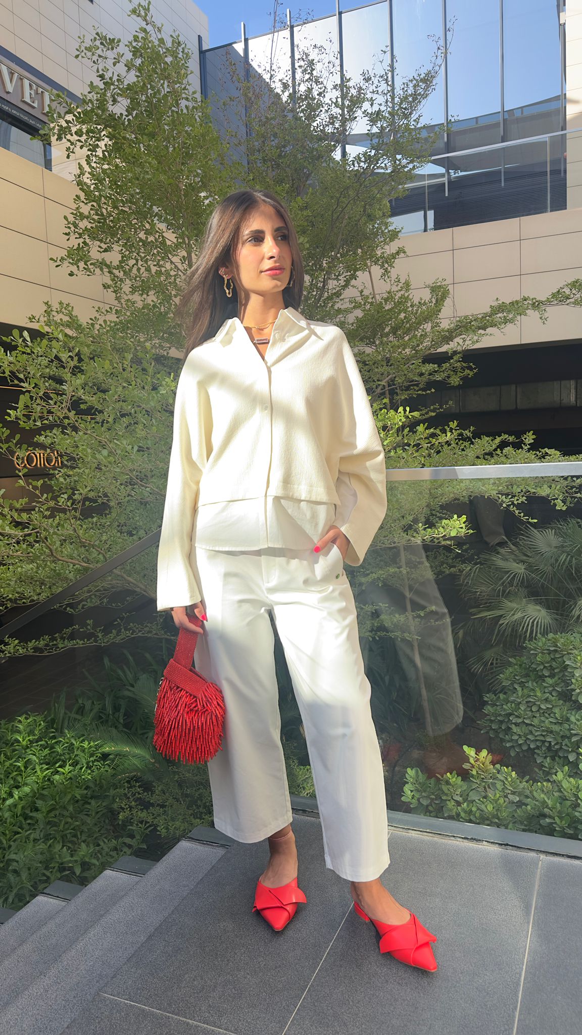 Buttoned White Collared Rib Short Shirt with white cotton hem details and long batwing rib sleeve with white cotton details