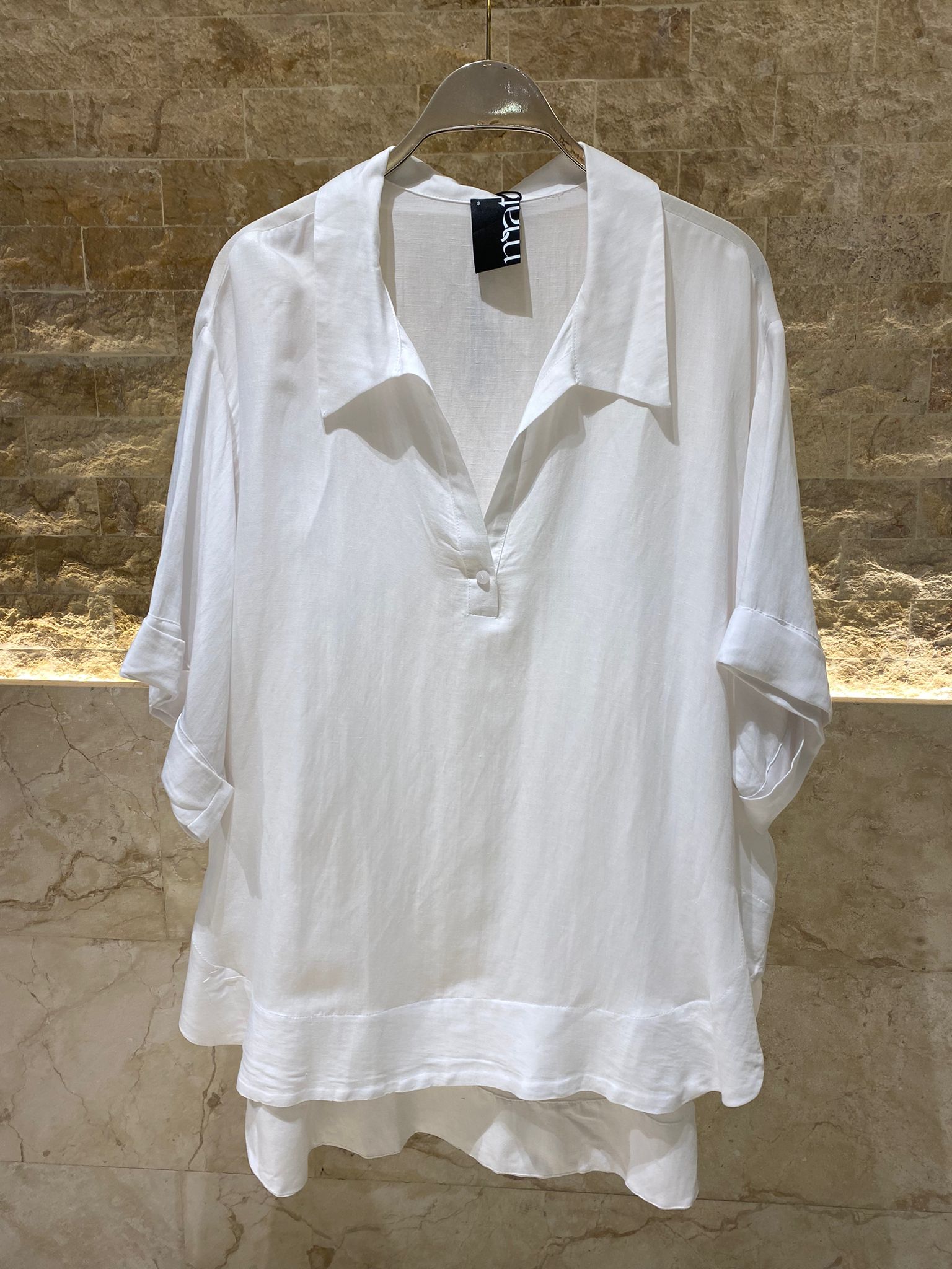 V Neck Collared Single Buttoned Oversized Long Back Linen Shirt with drop shoulder, curved hem andshort wide roll up sleeve
