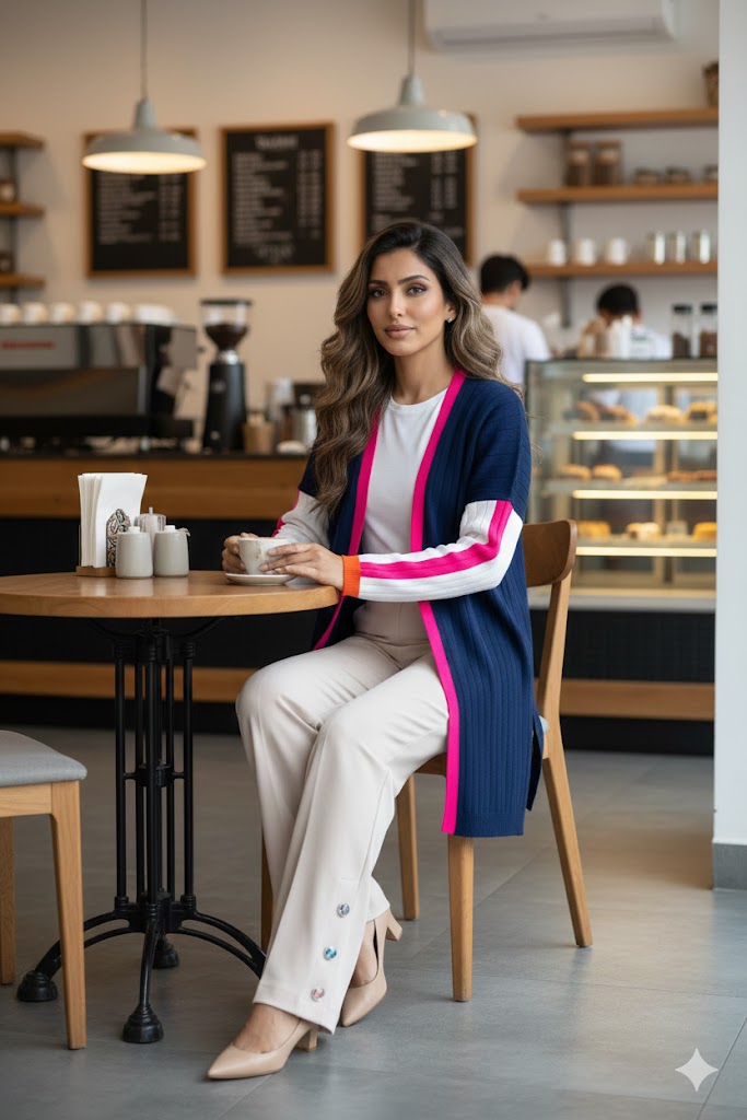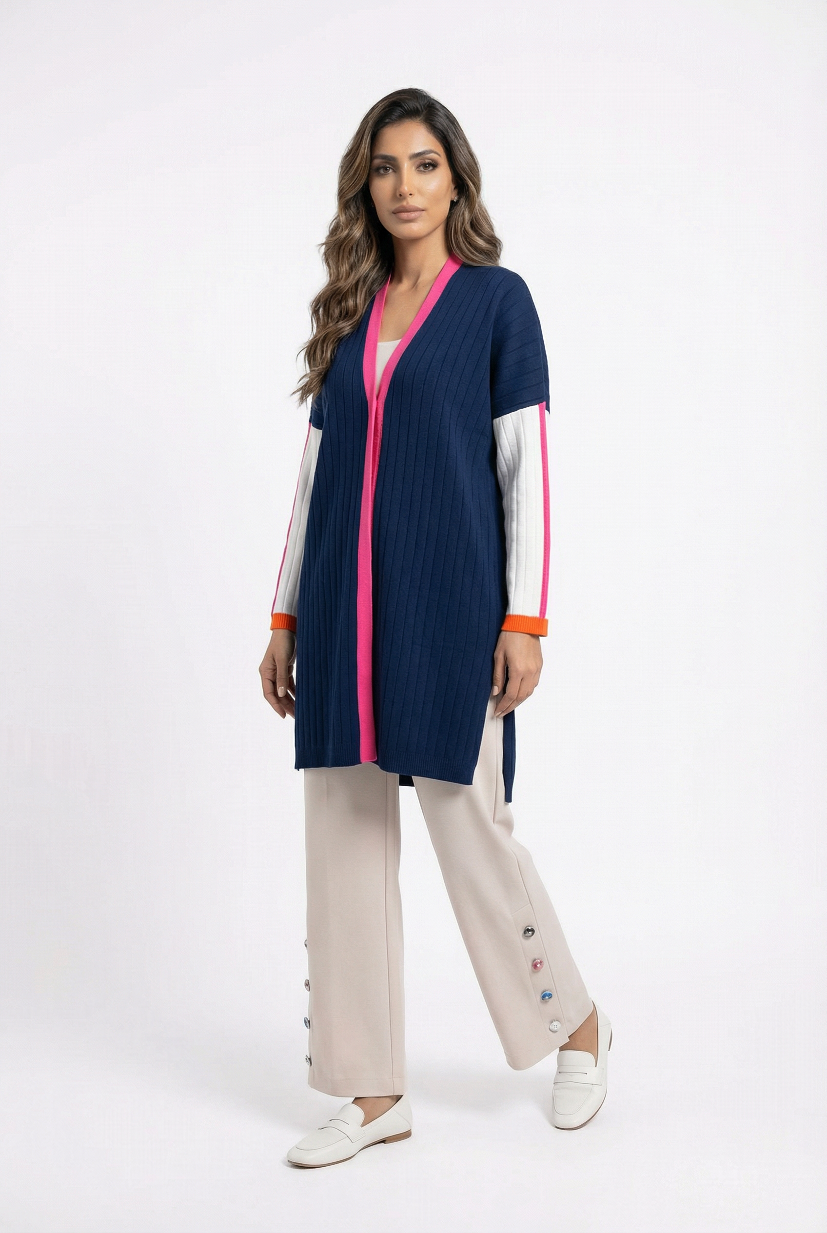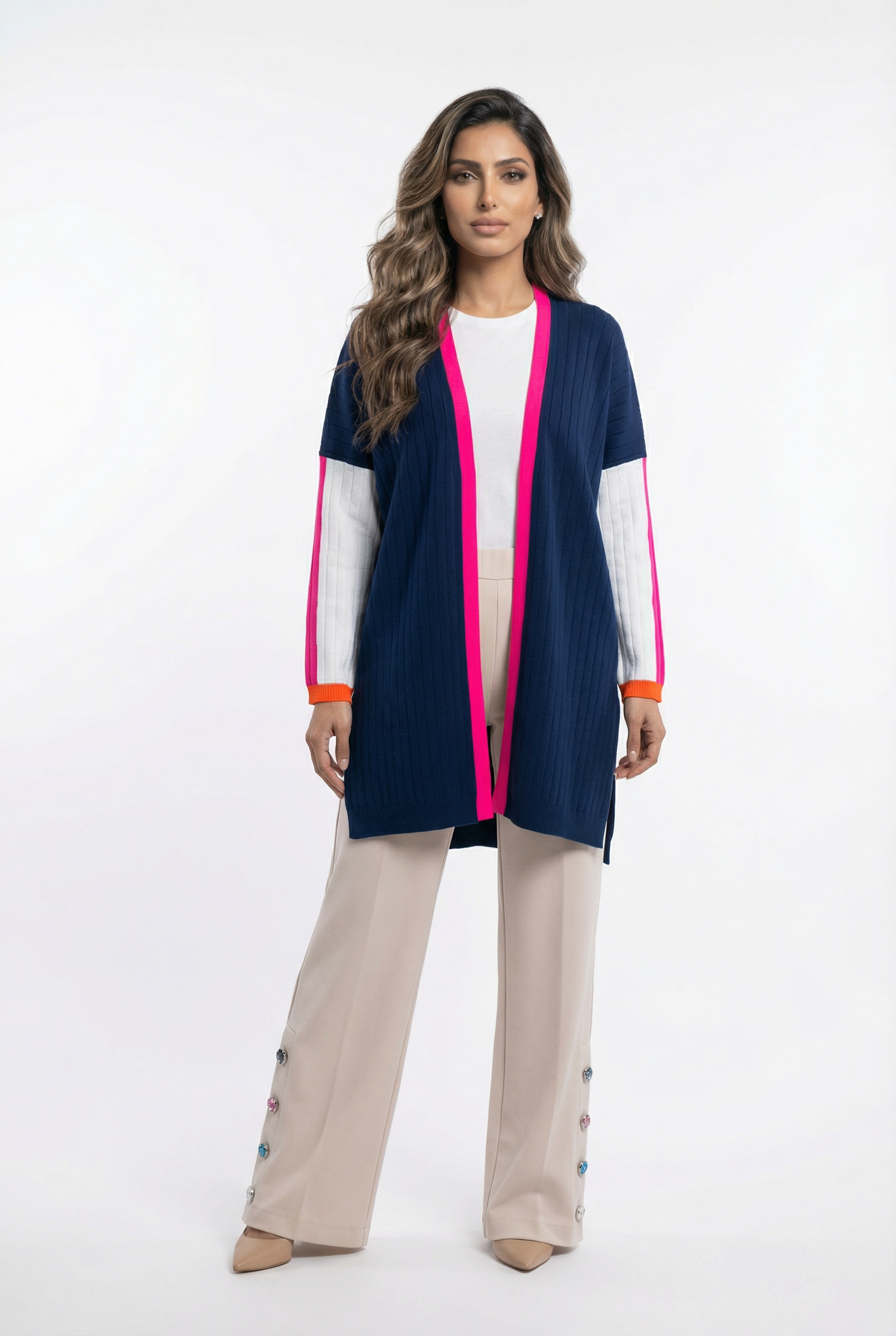 Midi Ribbed Cotton Cardigan with pink contrasts , drop shoulder and 3/4 white sleeves with pink details and orange cuff rib hem details