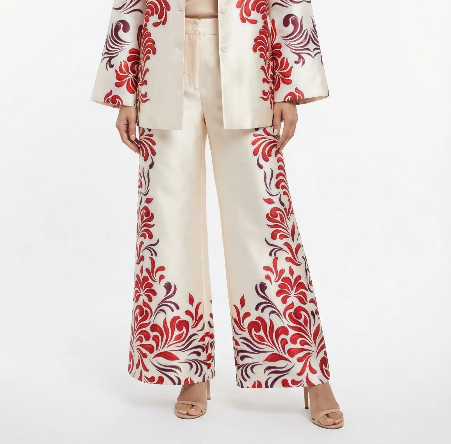 53-5127 Distinctive Printed Flare Pants are designed with a unique buttoned and zippered closure, featuring a striking printed design that adds a bold statement to your outfit. These wide-leg pants offer a flowing silhouette and are perfect for creating an elegant look. The smooth, satin-like finish enhances the overall appeal, making them a versatile choice for various occasions.