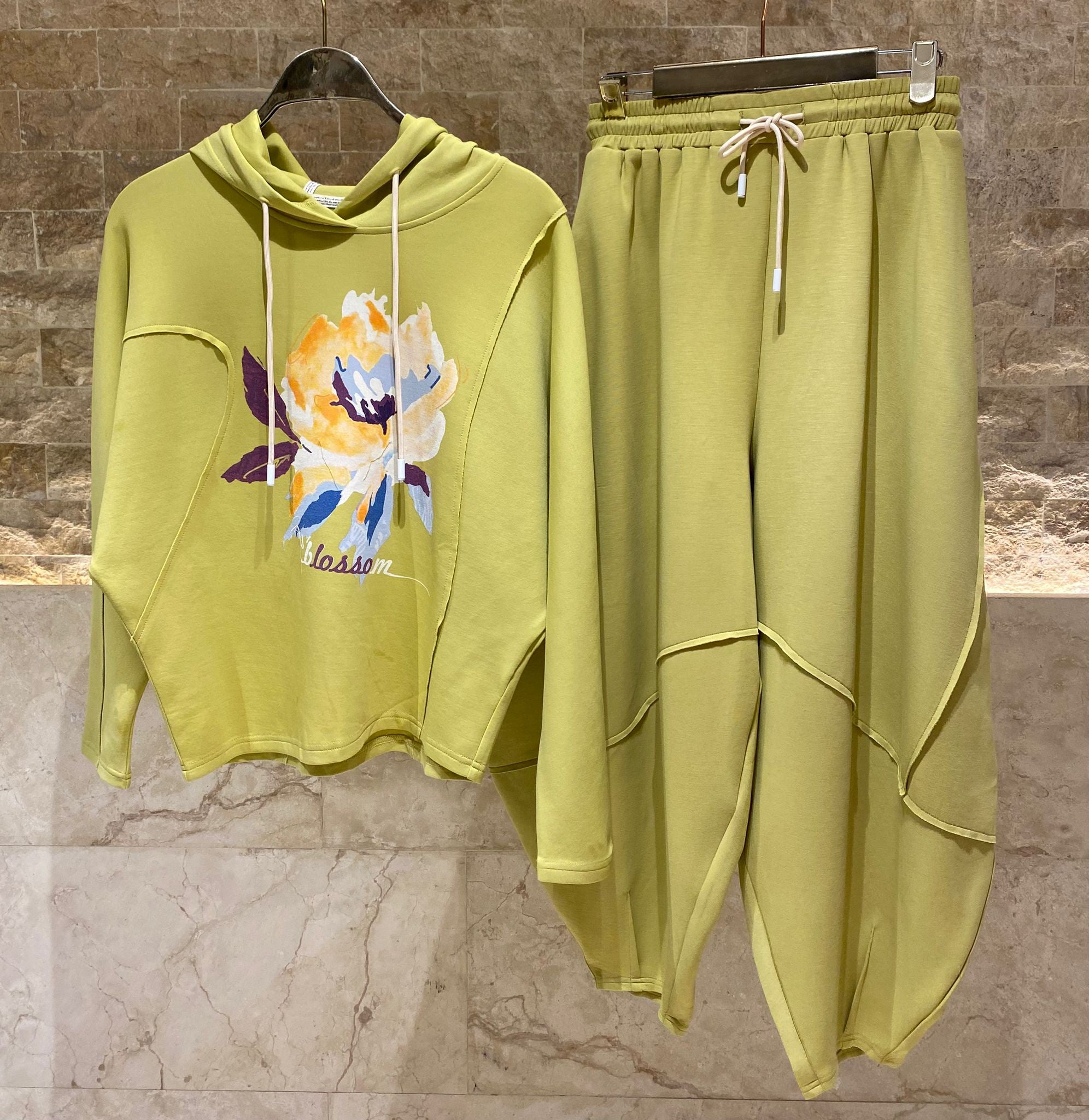 Hoodie Sweat Shirt with flower print and long sleeve. Paired with Elastic Waistband Baggy Pants with adjustable tie and side pockets