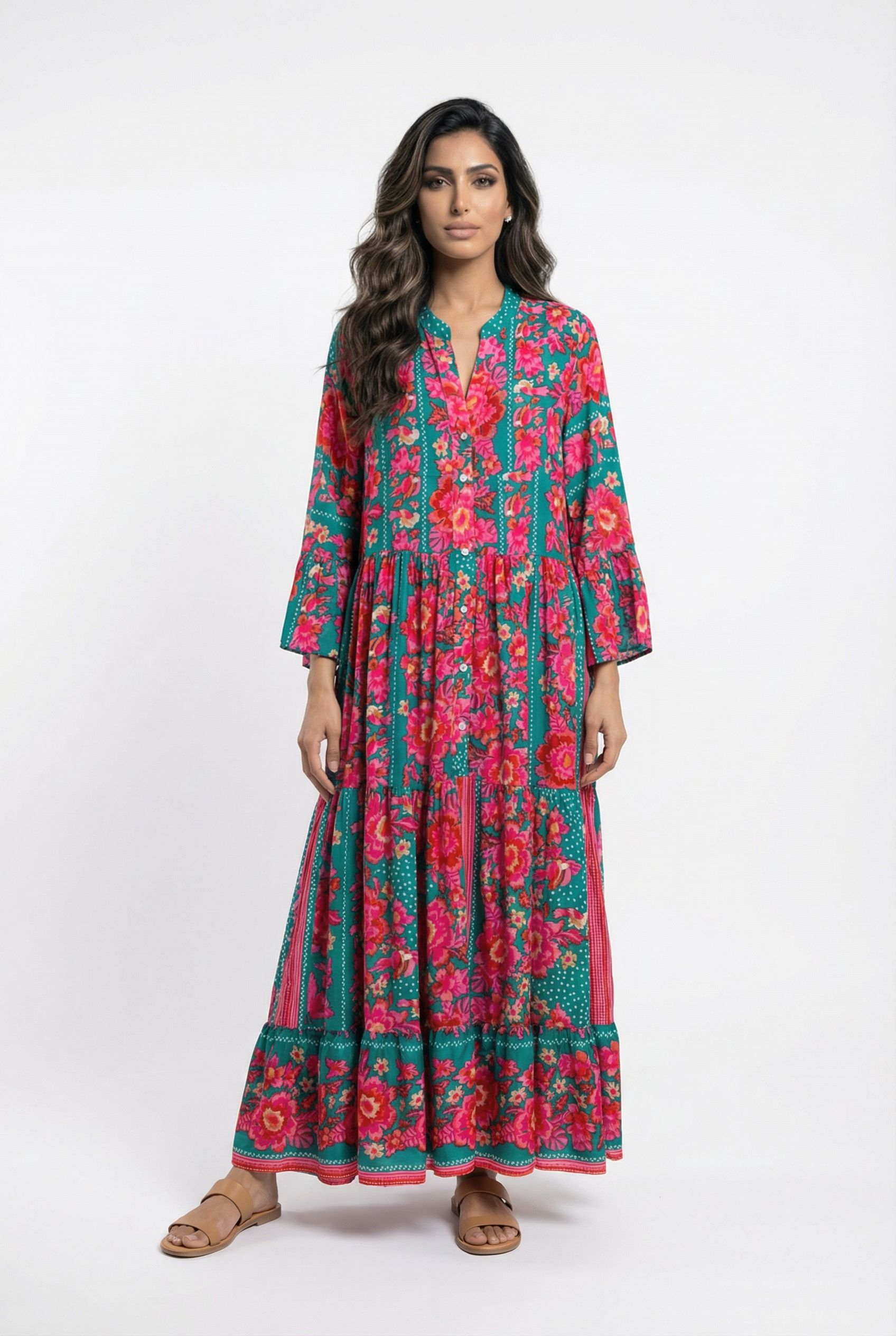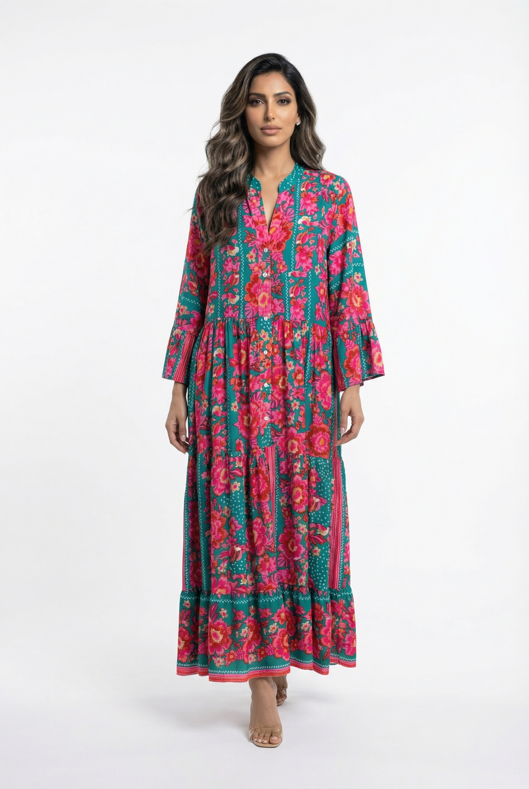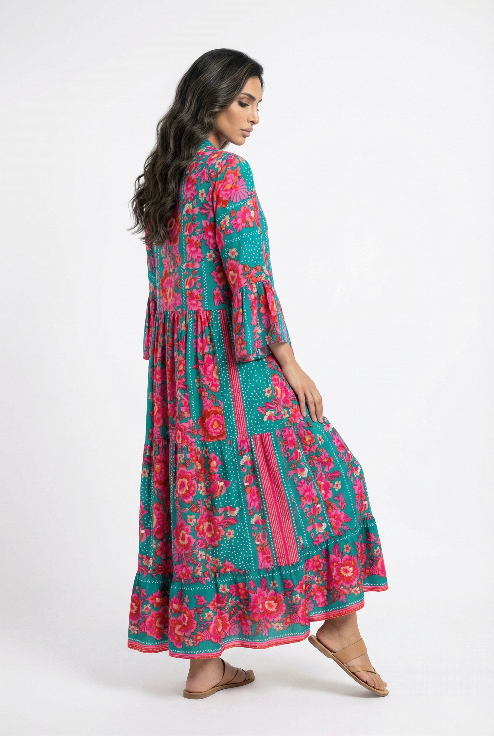 V Round Neck Half Buttoned Pink Floral Flowy Tiered Long Dress with long bell sleeve