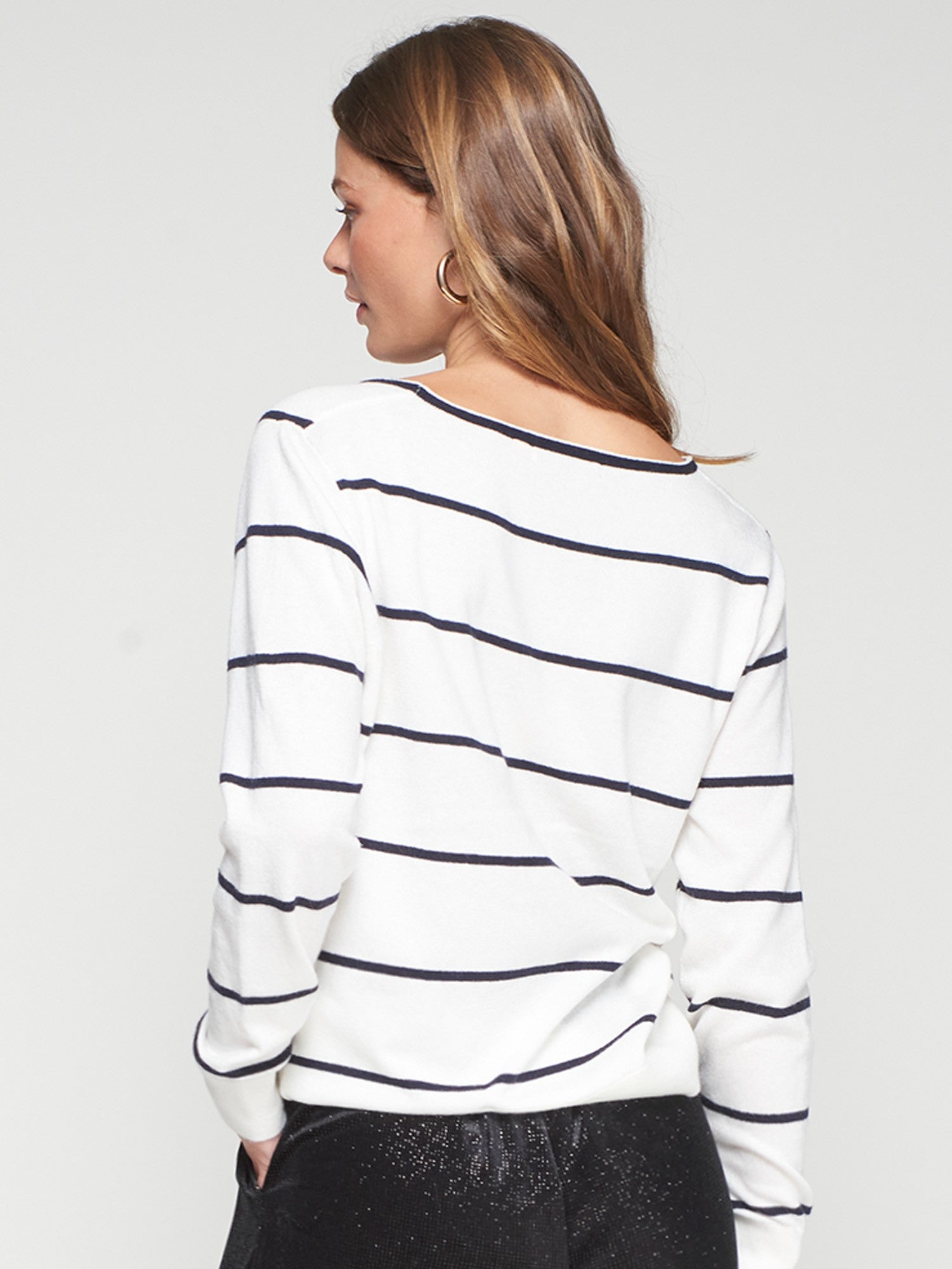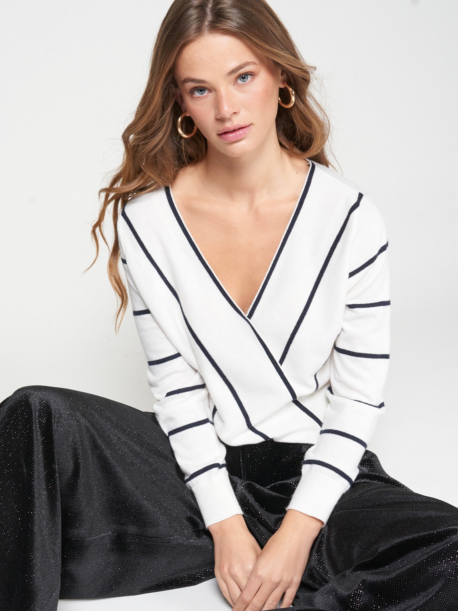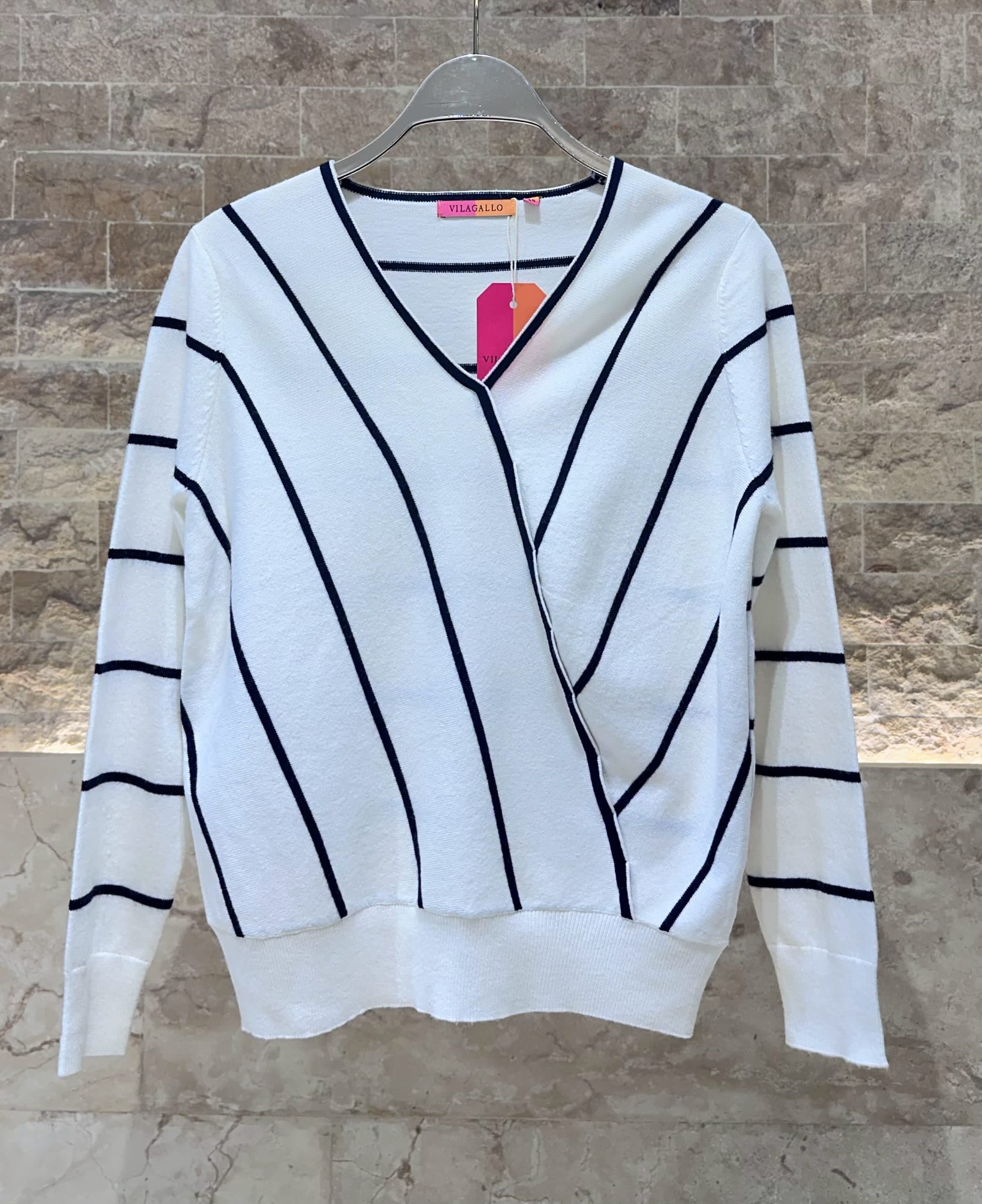 V Neck Navy Striped Knitwear Top with ribbed hem and long sleeve and ribbed cuff