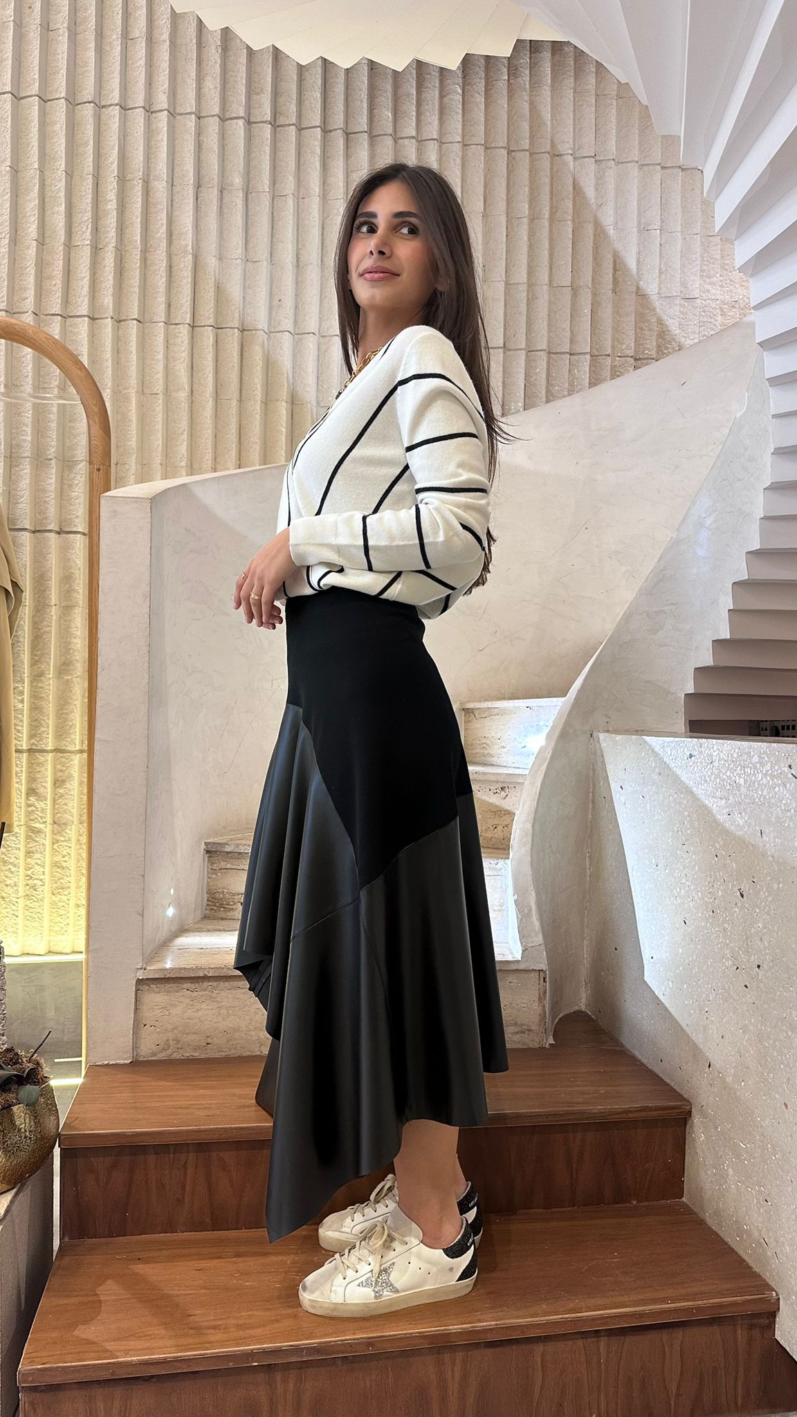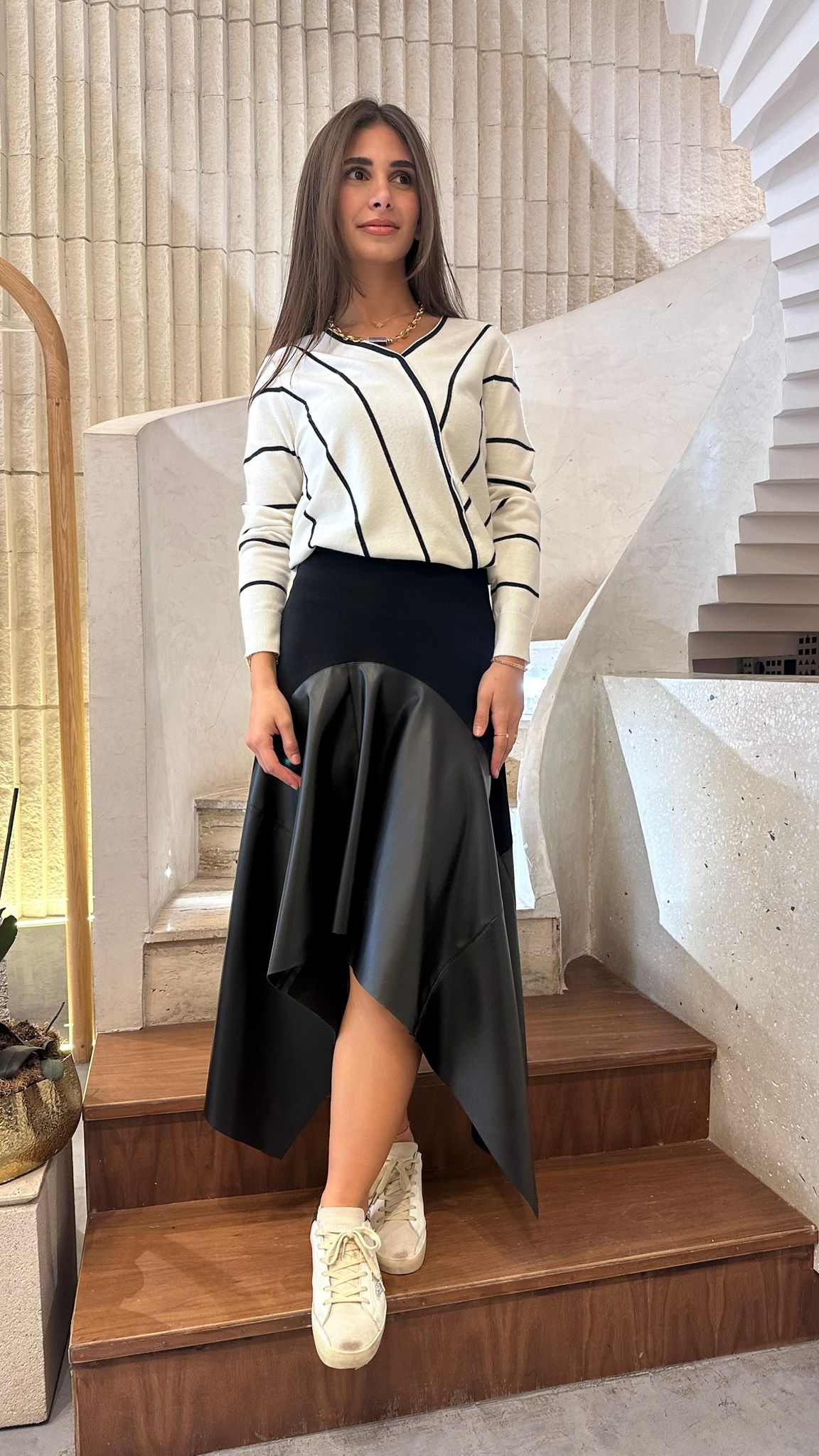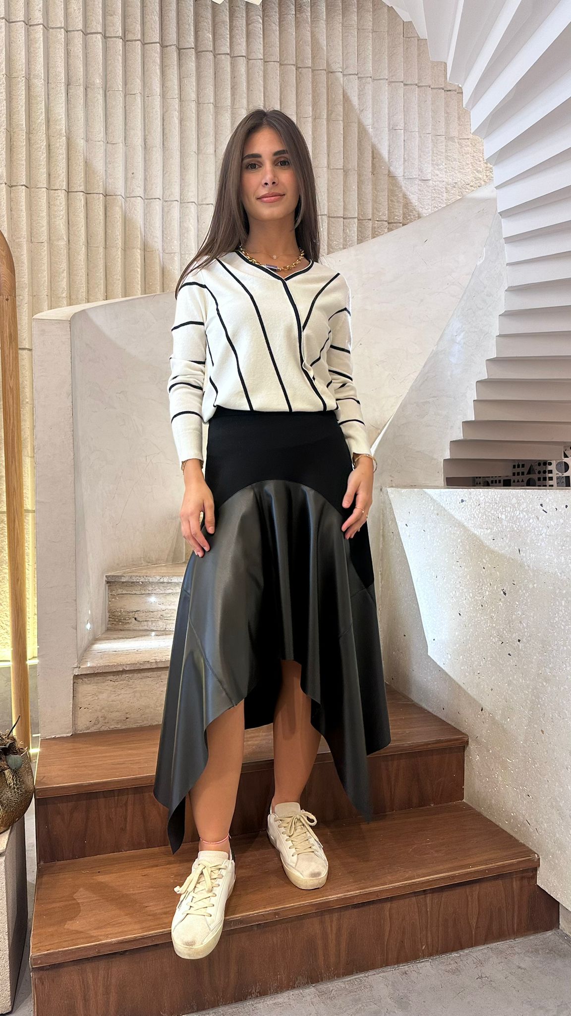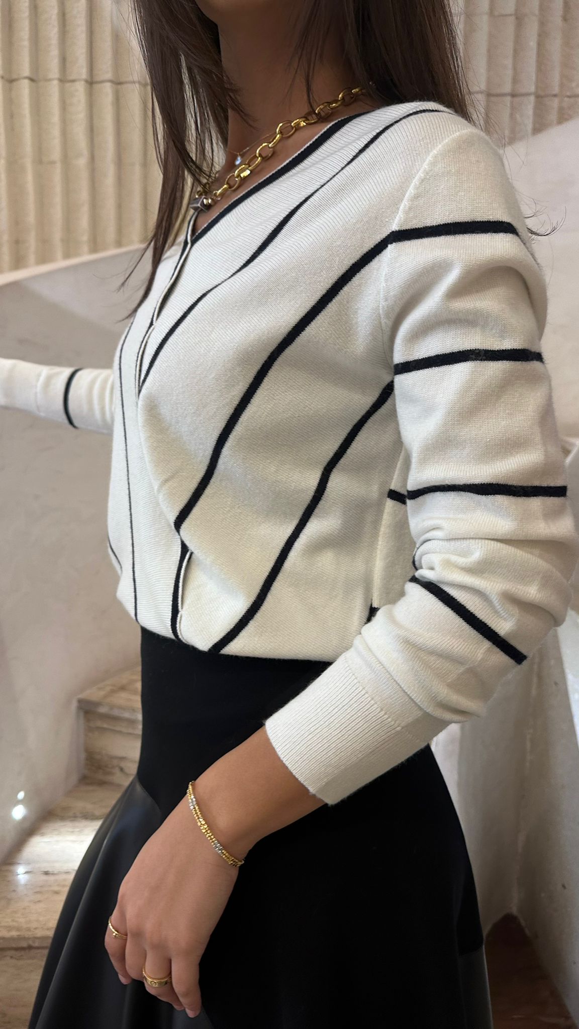 V Neck Navy Striped Knitwear Top with ribbed hem and long sleeve and ribbed cuff