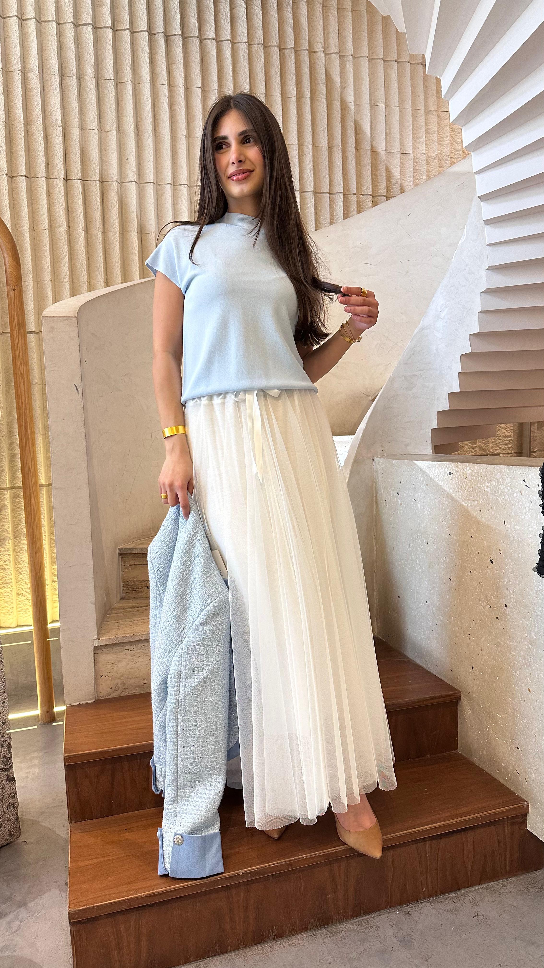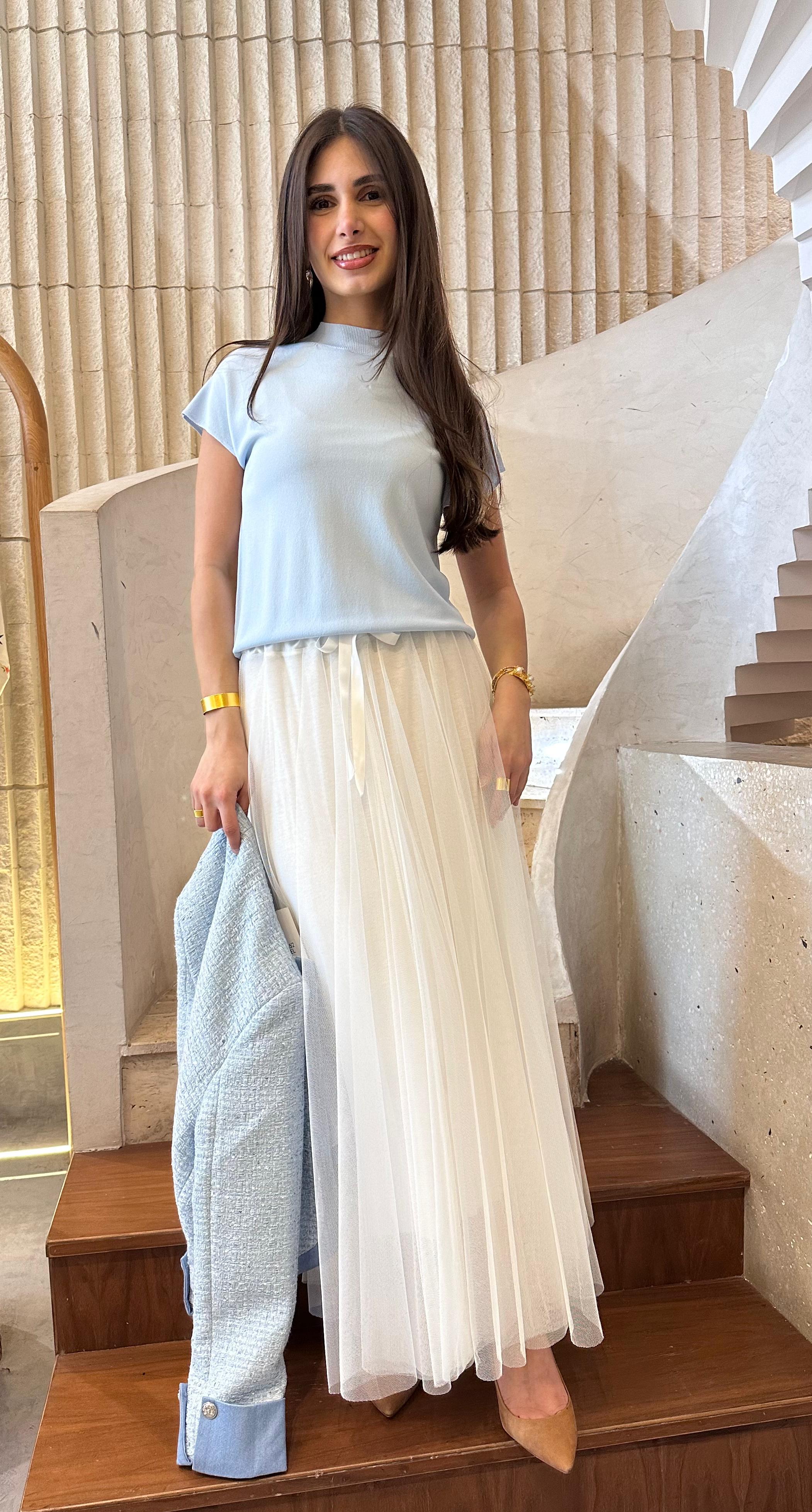 SVD6197 Crew Neck Sweater Knitted Top is designed for effortless elegance with a lightweight knit in a lovely light pastel blue. This top features a comfortable crew neck and short sleeves, making it perfect for casual outings or relaxed weekends. The rib hem adds a refined touch, ensuring a polished look that pairs beautifully with skirts and trousers.