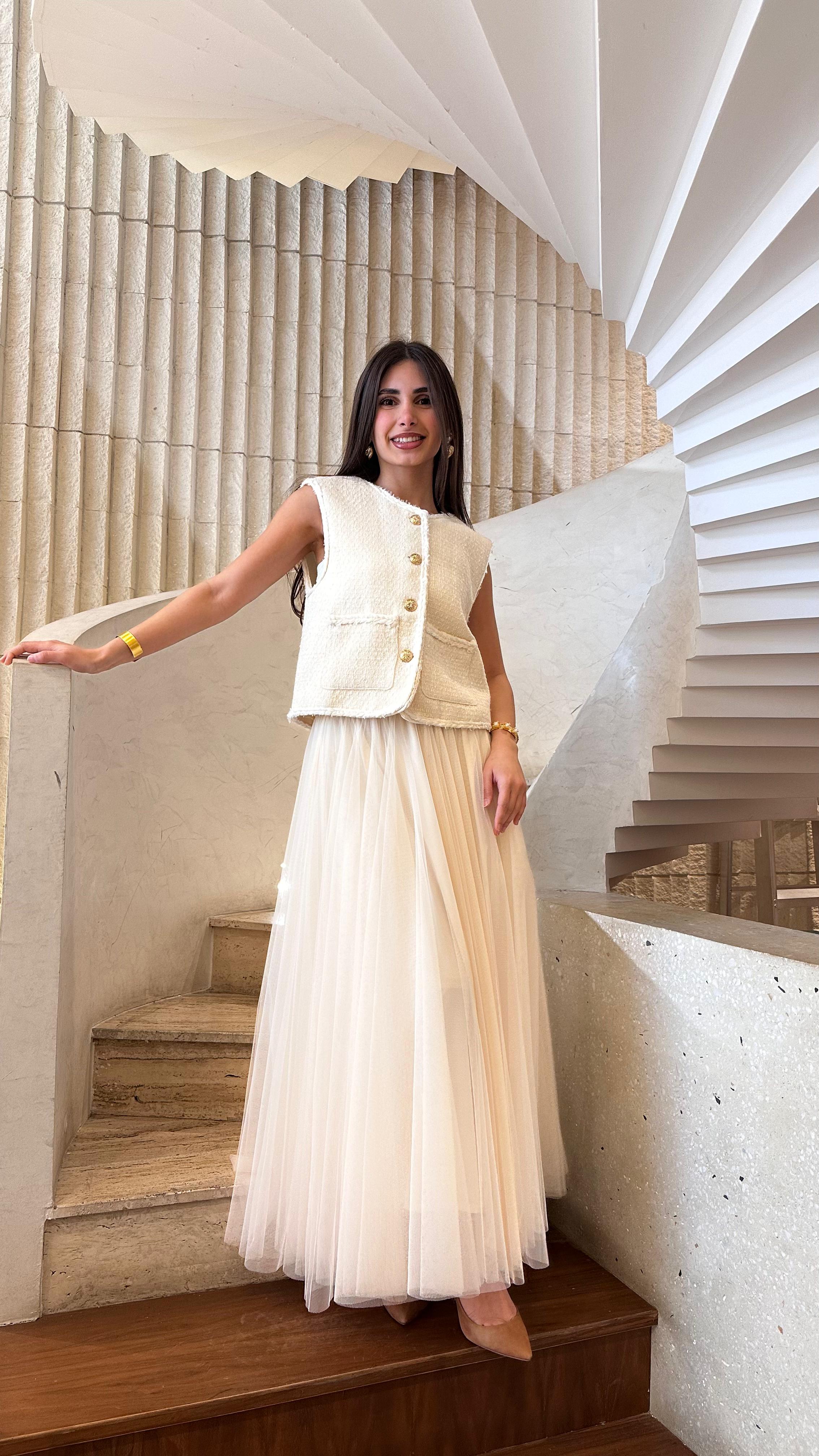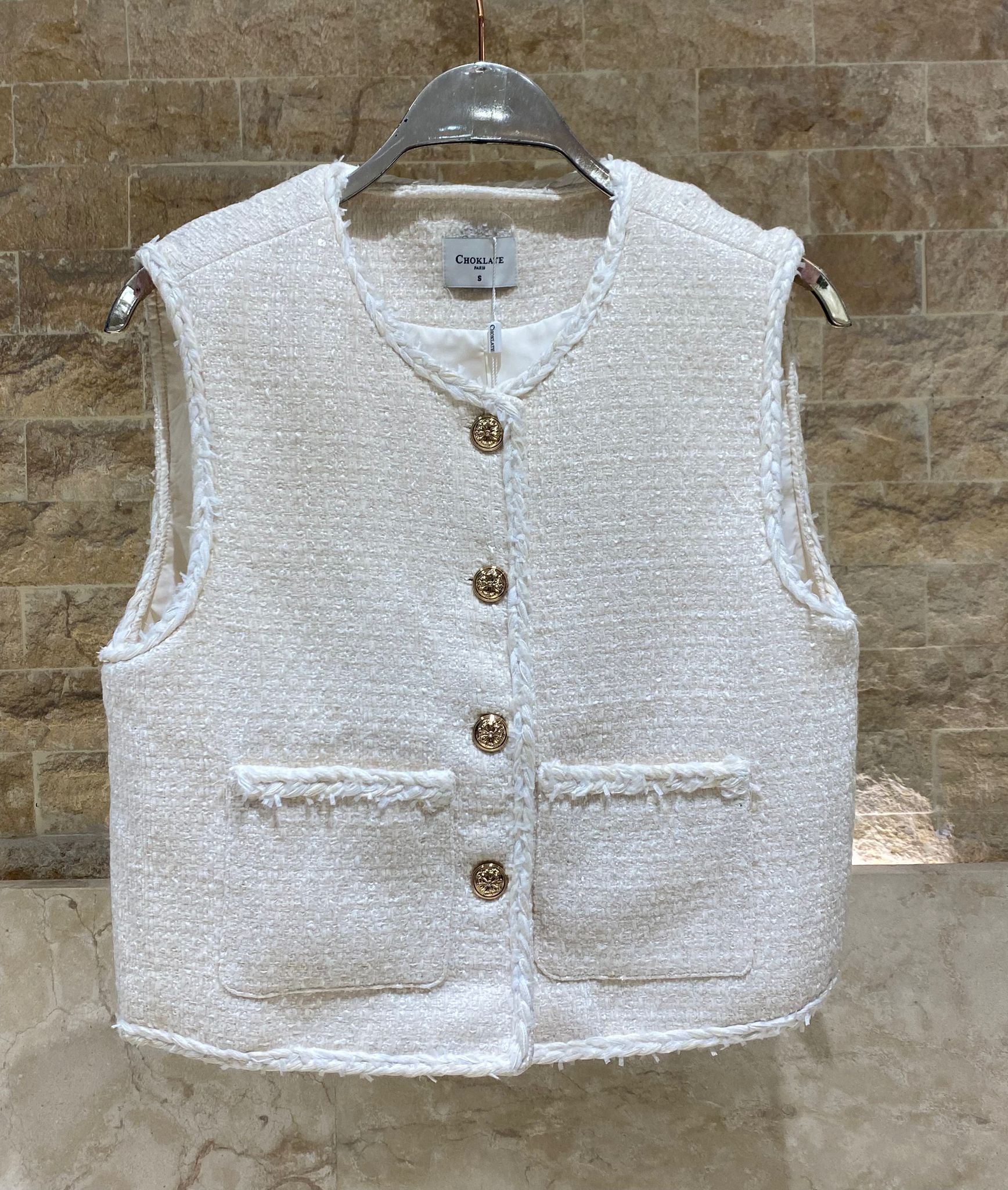 08536-1 Tweed Knit Vest featuring a round neckline and buttoned front for easy wear. The vest is designed with braided edge trim details and front patch pockets that enhance its chic appeal. This sleeveless, boxy silhouette in cream/ivory offers an elegant and feminine look, making it perfect for pairing with flowy skirts and heels.
