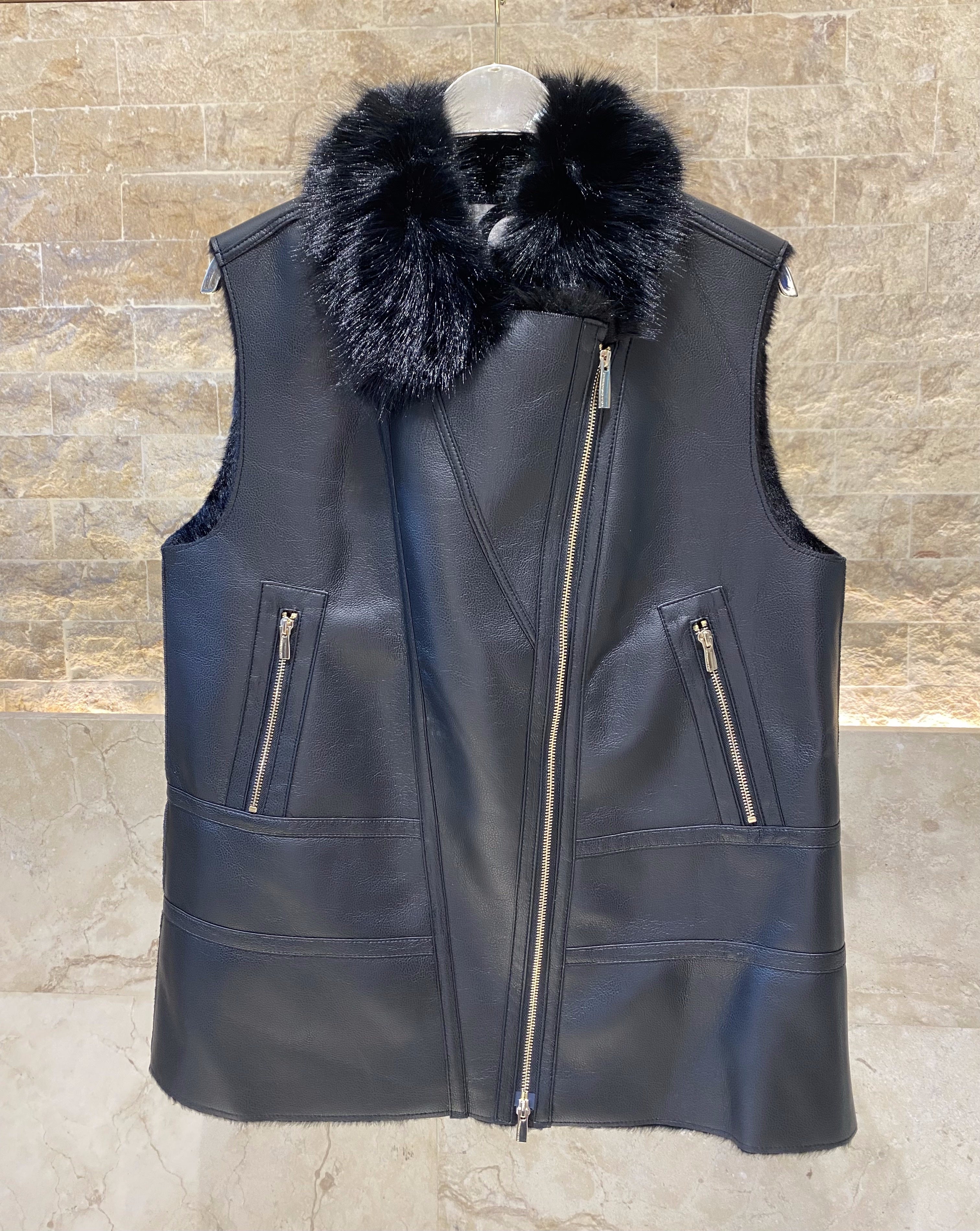 Fur Collared Asymmetric Zippered Faux Leather Double Sided Vest with soft fur interior and siide pockets