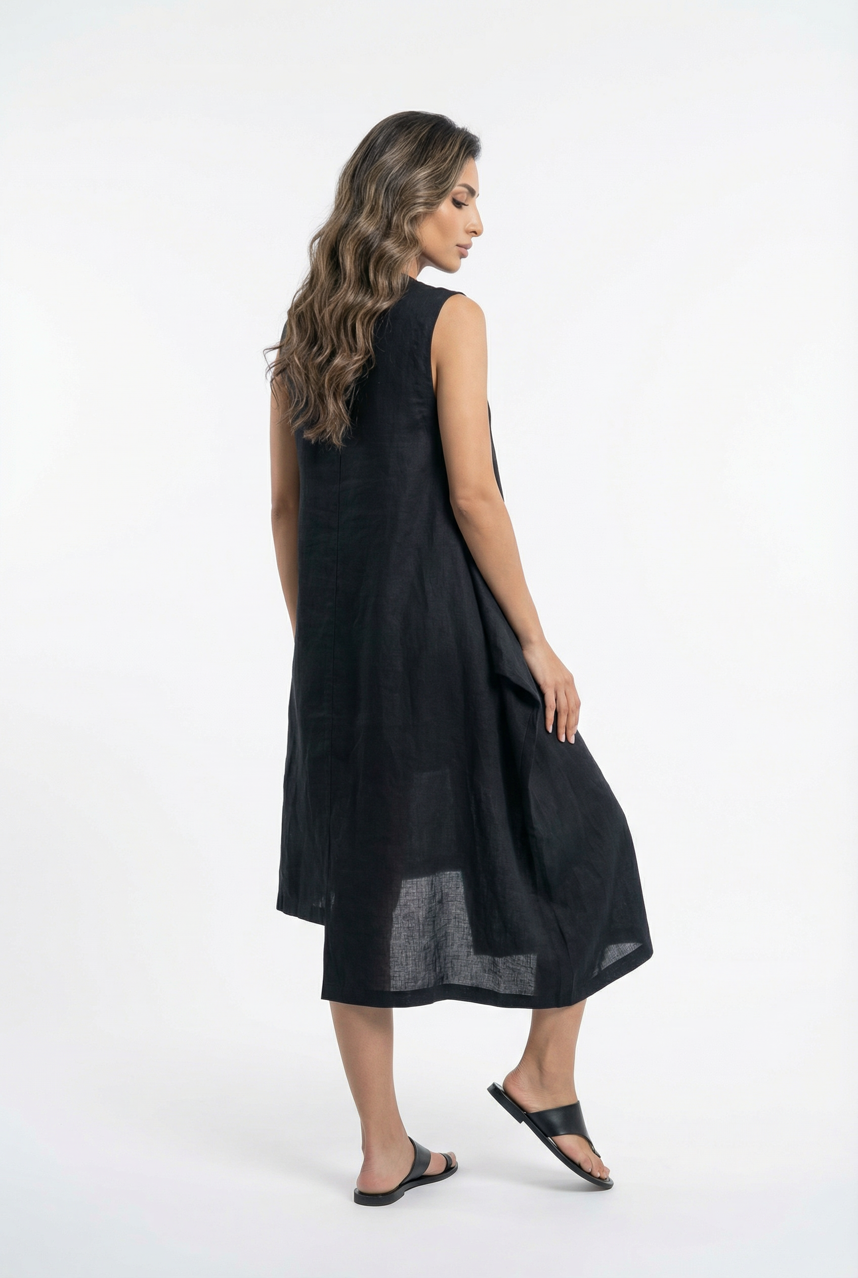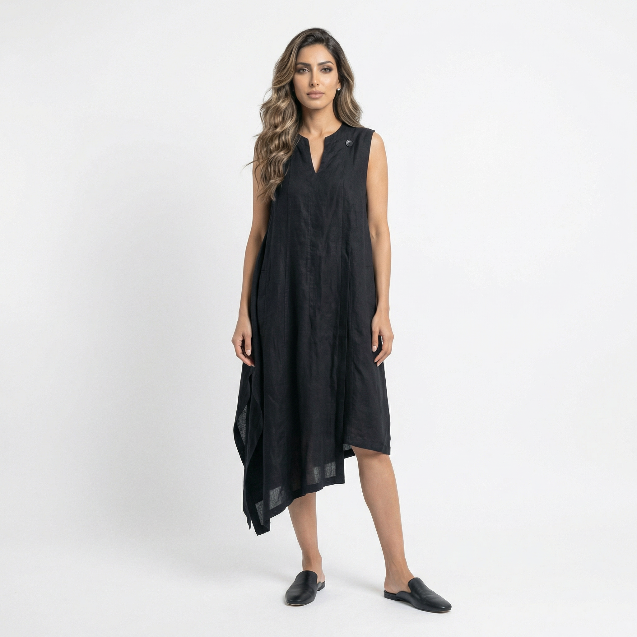 Round V Neck Placket Zippered Asymmetric Sleeveless Long Vest with side pockets and one side open with single buttoned details