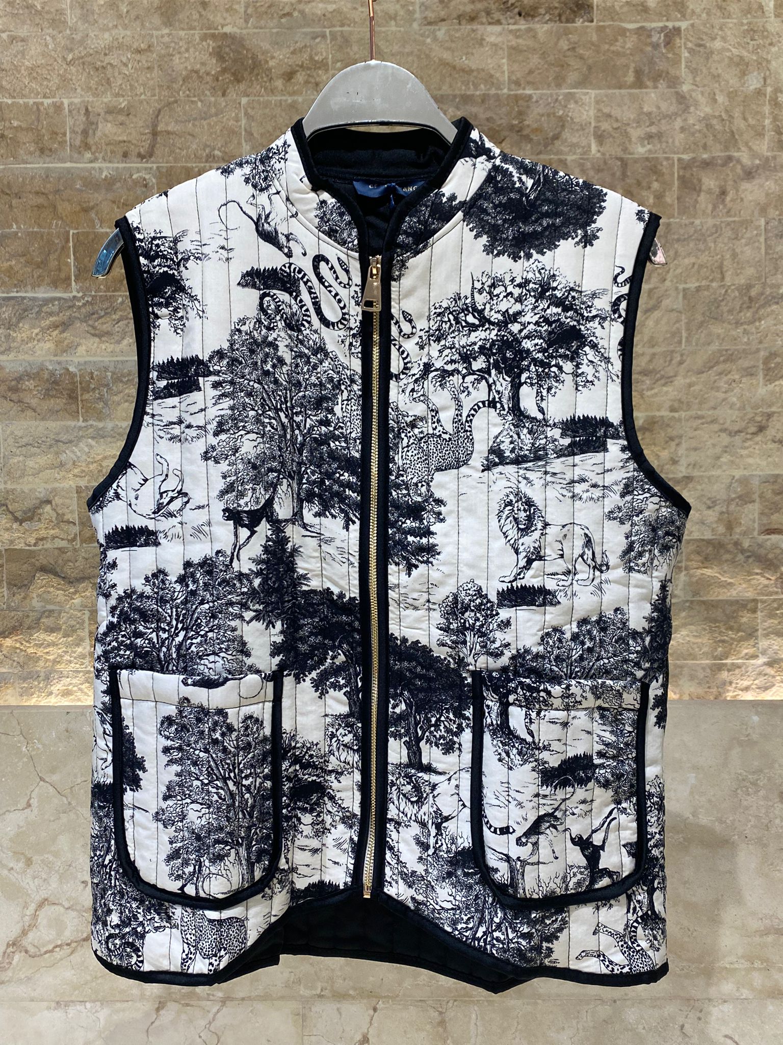 KD9901-2 Zip-Up Safari Print Vest is a stylish layering piece that features a sophisticated mandarin collar and a striking monochrome jungle print. This sleeveless vest is designed with practicality in mind, offering front patch pockets and luxurious satin hem details. Perfect for both smart-casual and evening outings, it combines a tailored yet relaxed fit for versatile styling.