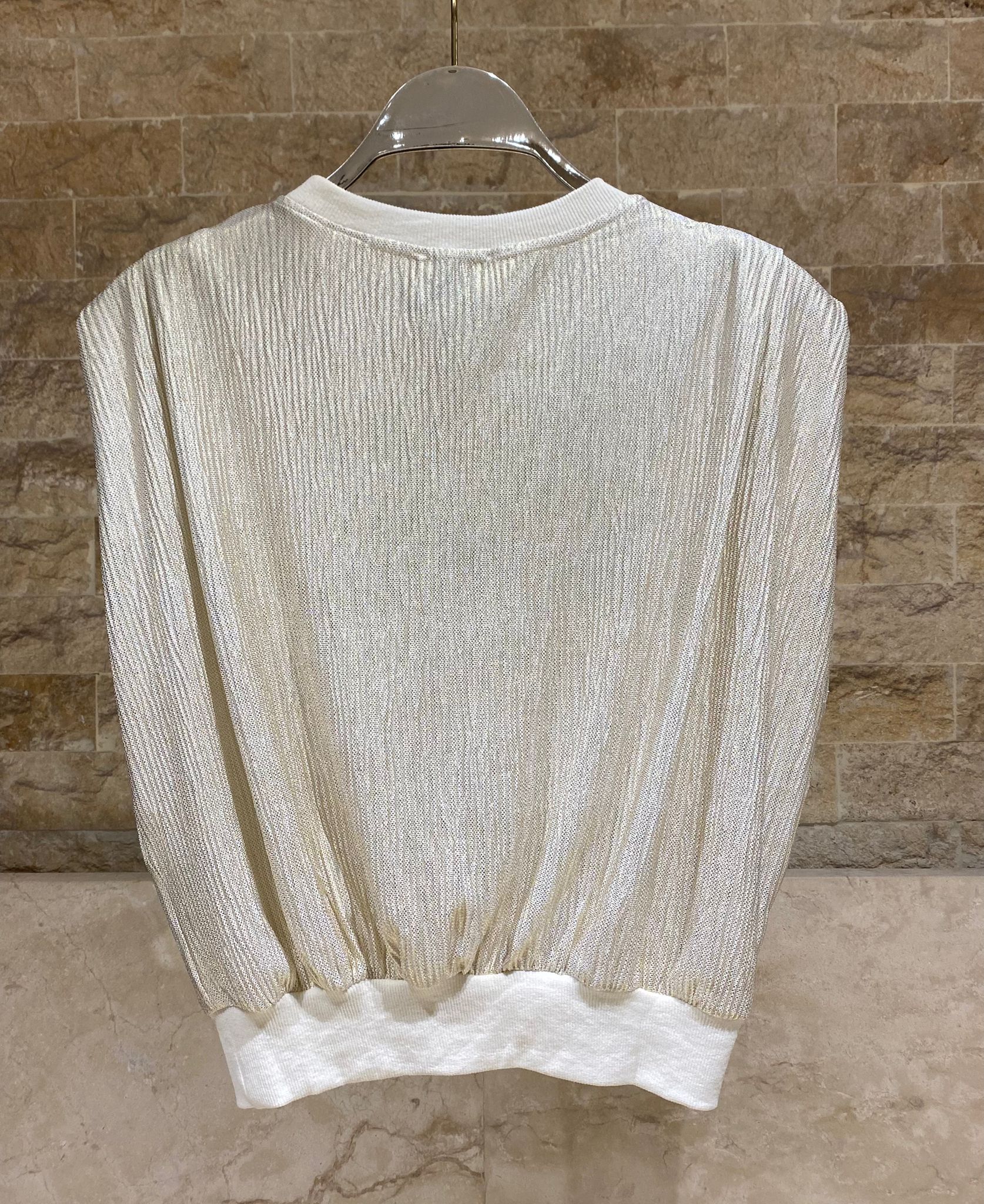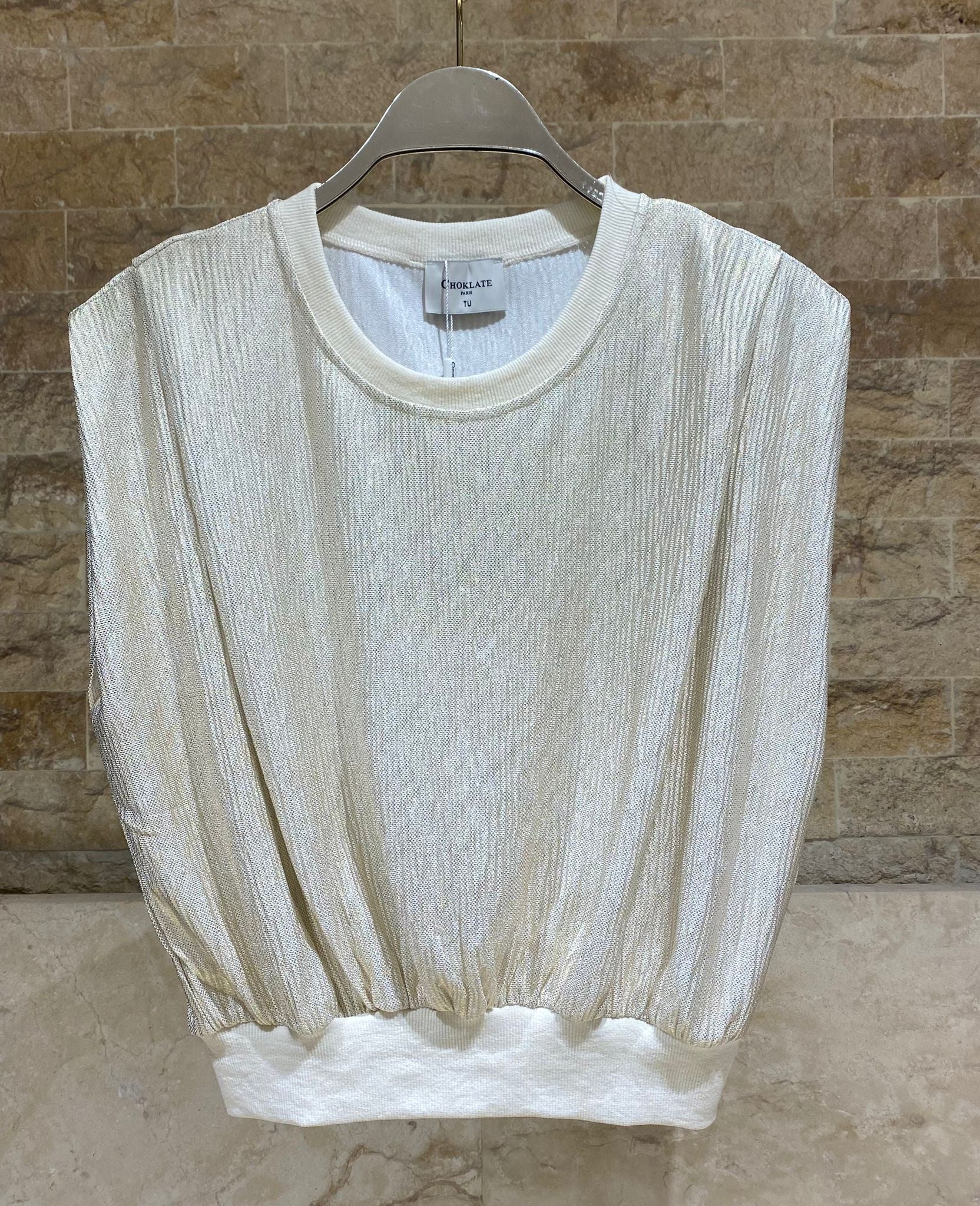Crew Neck Metallic Gold Sleeveless Knit Top with distinct pleated details and elastic ribbed banded hem