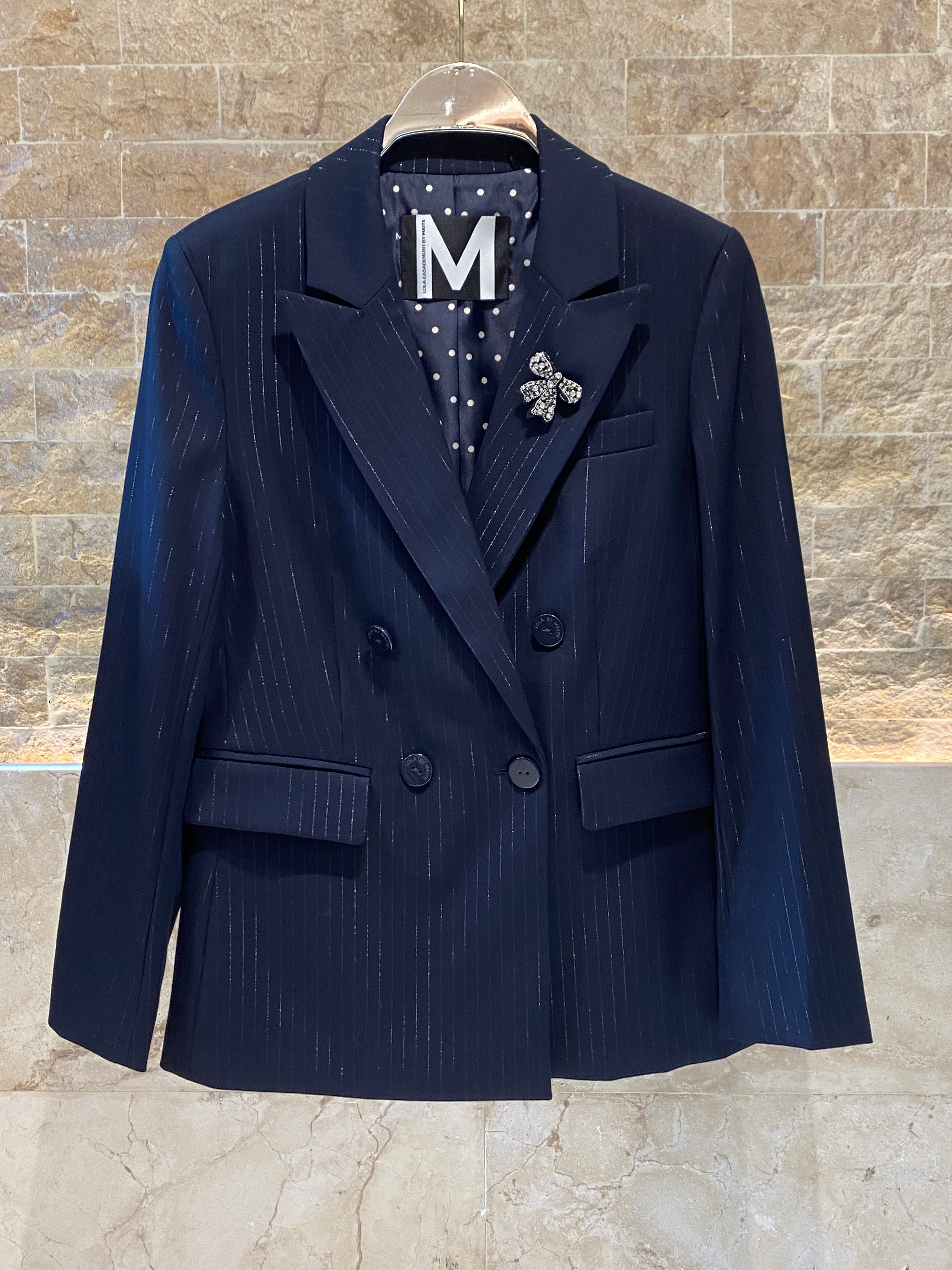 Lapel Collared Double Breasted Classic Fit Pinstripe Jacket with jewel details on lapel, flap front pockets, padded shoulder and long sleeves. With Matching Straight Cut Pinstripe Pants with adjustable drawstring, side pockets and elastic waistband back details