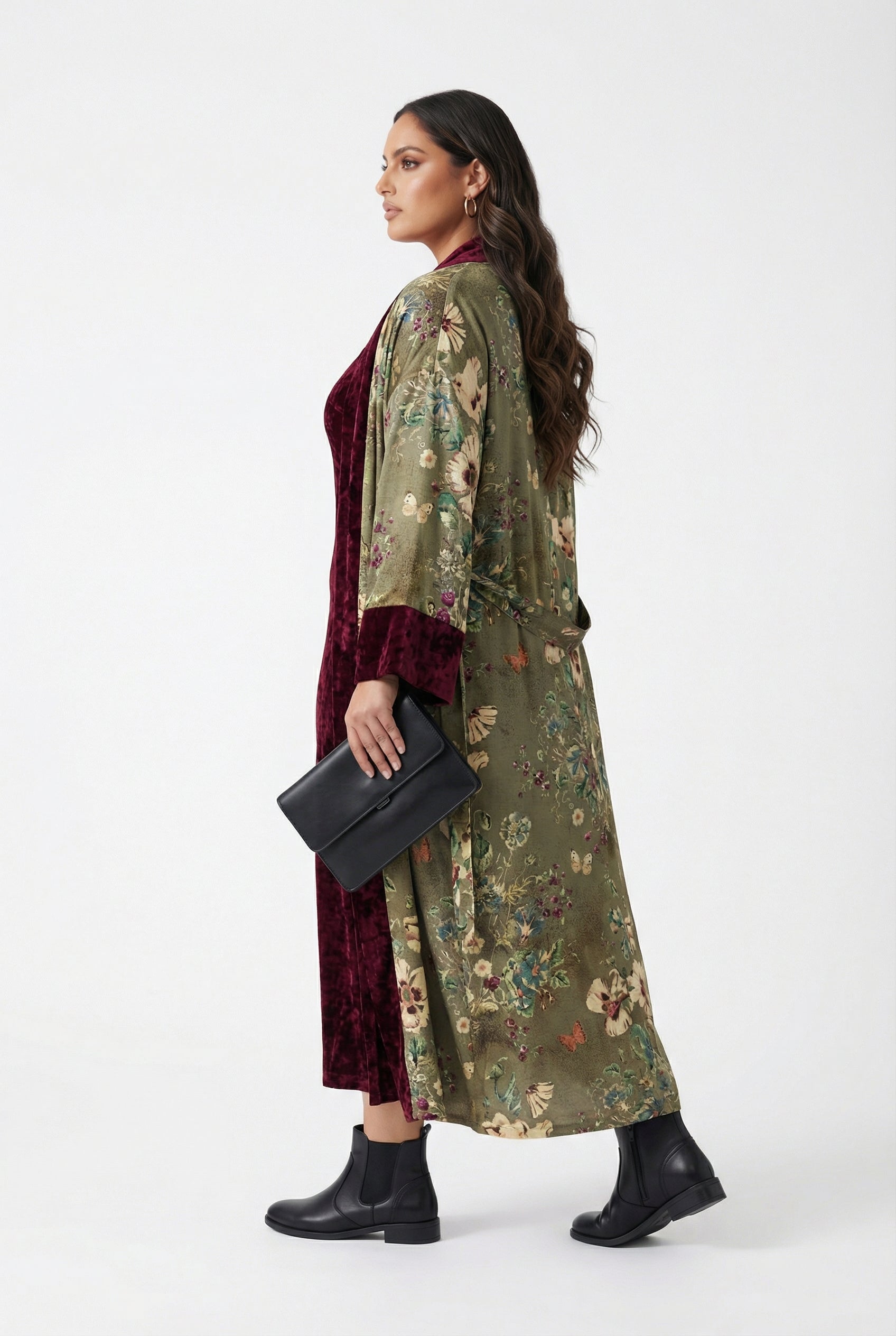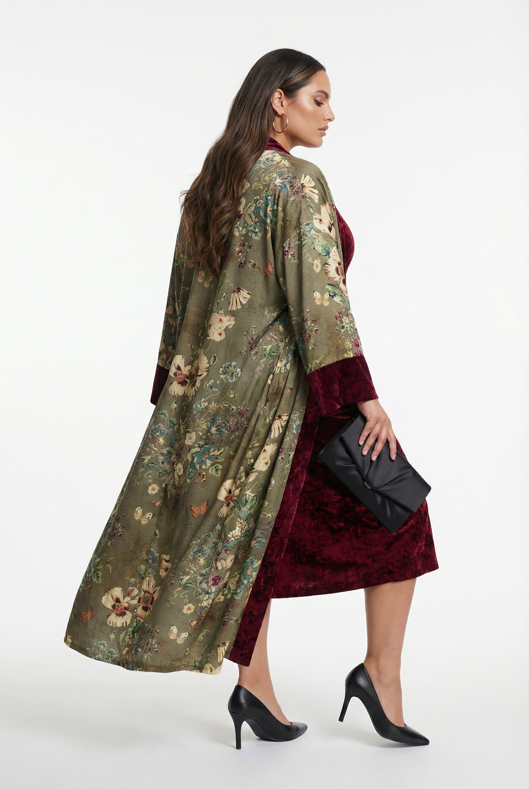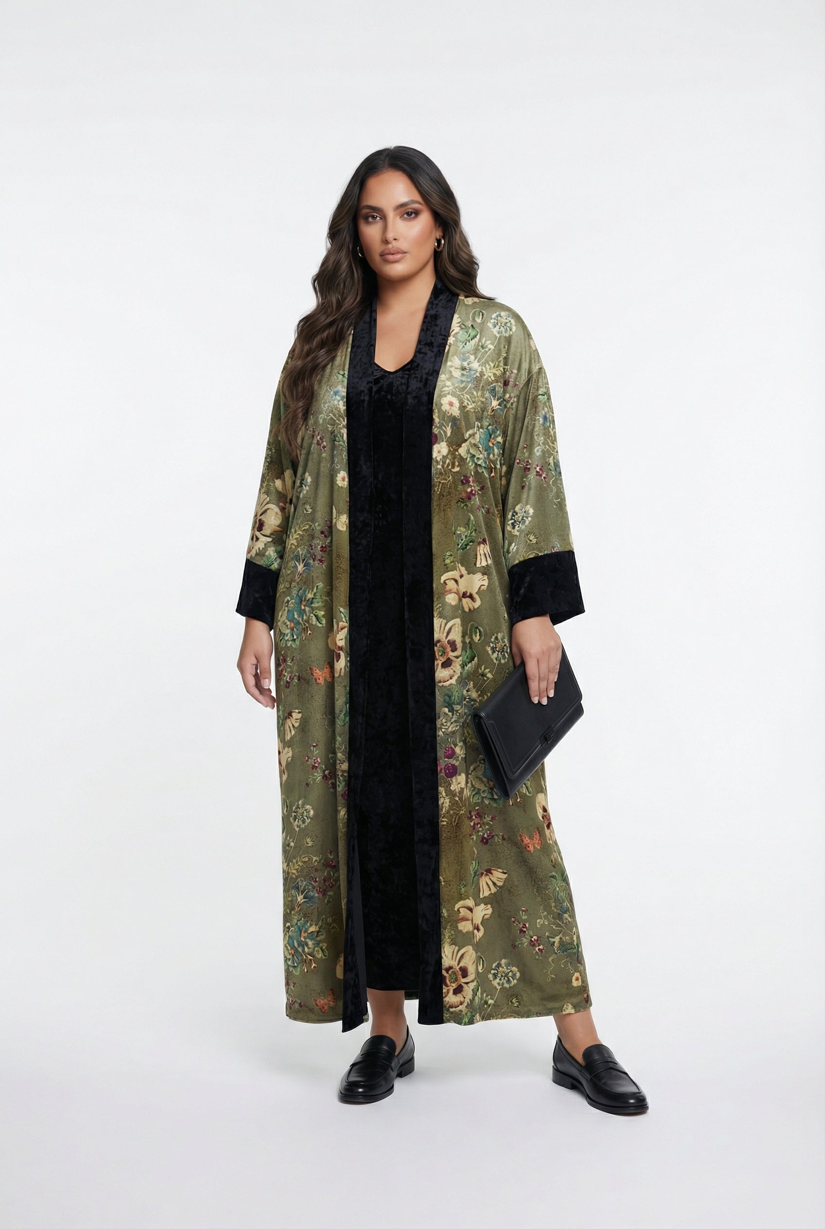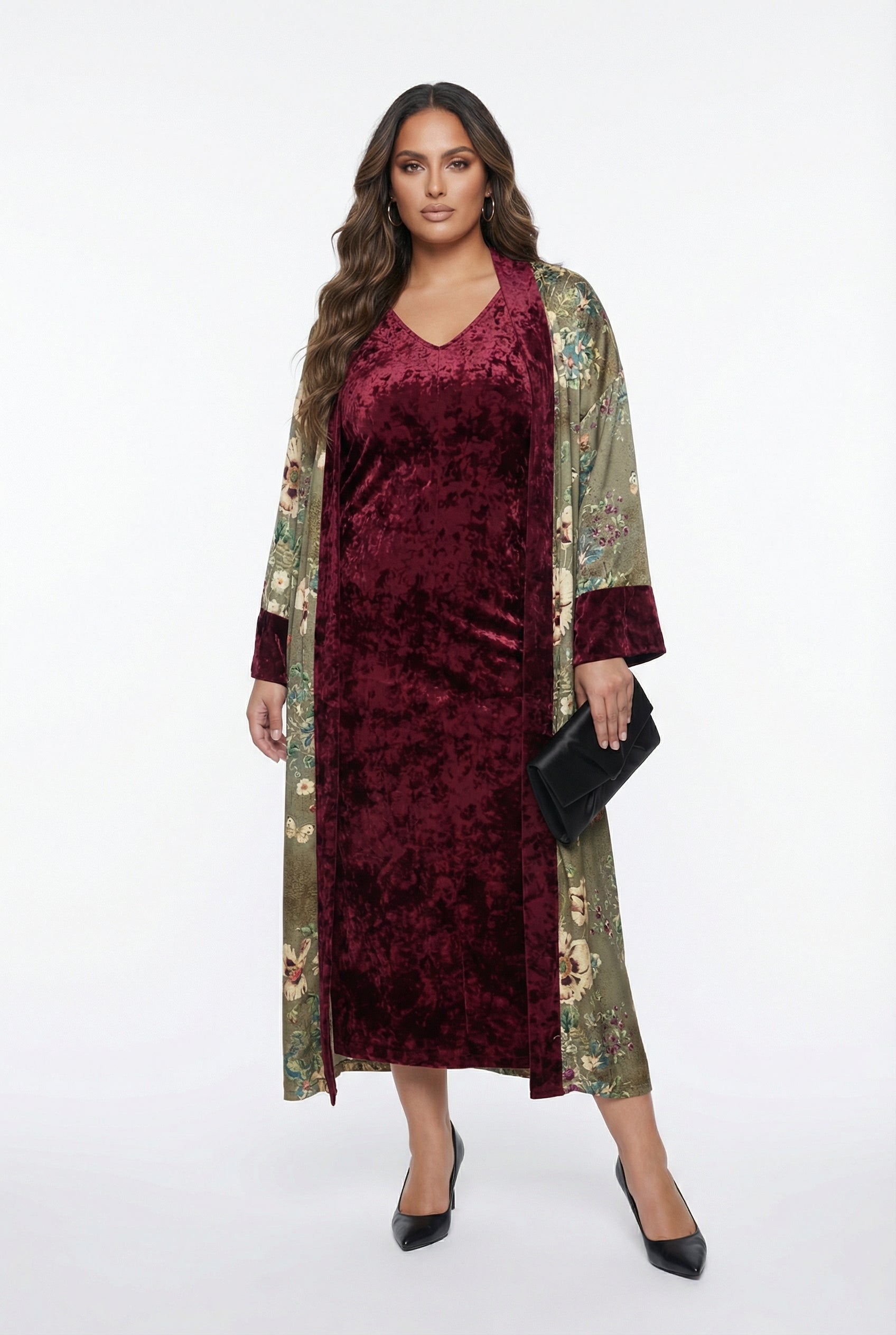 Scoop Neckline Velvet Long Sleeveless Dress with matching Open Front Floral Print Long Chenille Kimono with velvet lining, drop shoulder, side slip pockets and long wide sleeve with velvet cuff details