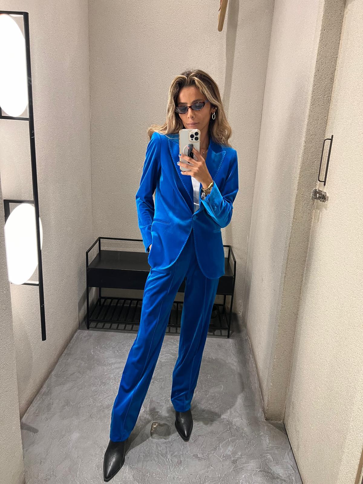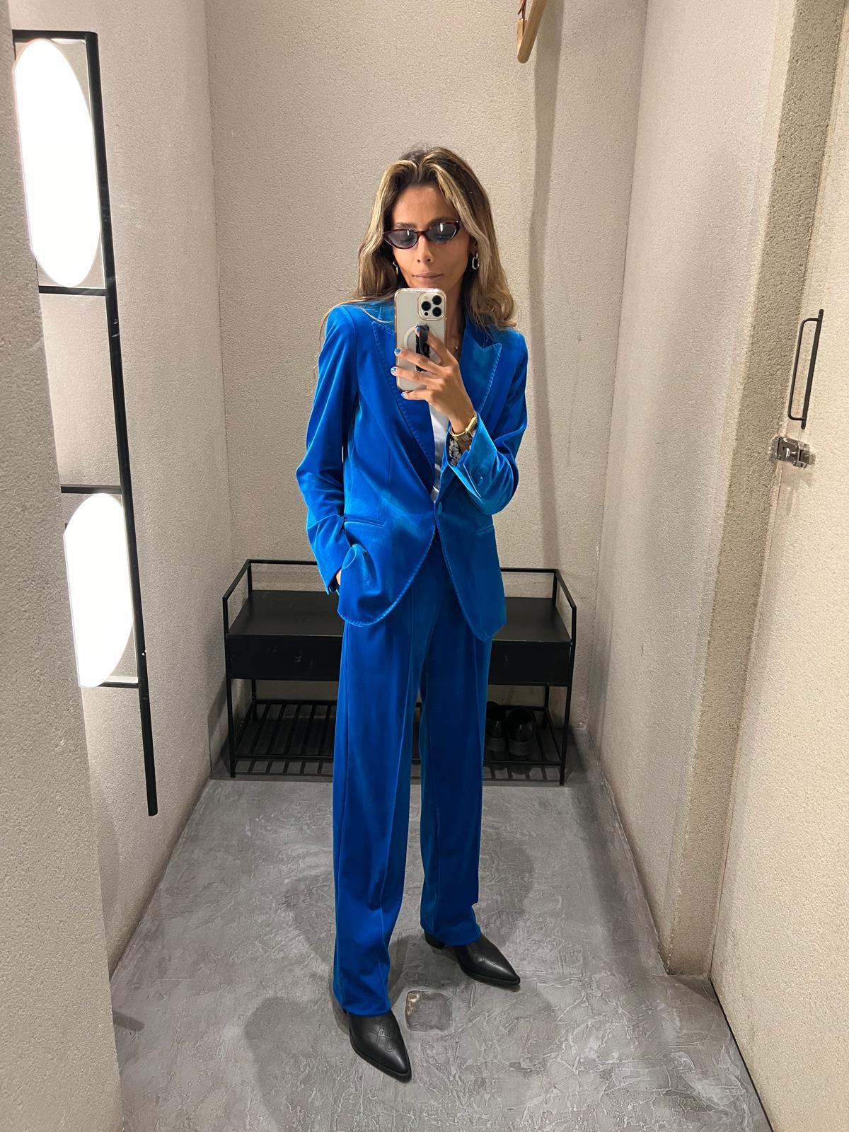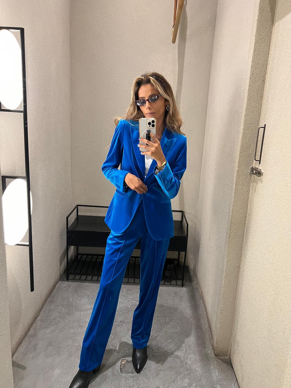 Classic Lapel Collared One Buttoned Velvet Jacket with welt pockets, slightly structured straight cut, printed inner lining and green contrast collar detail and long sleeve with buttoned details. Matching with Elastic Waistband Mid Rise Velvet Pants in straight cut, long leg, side pockets, belt loop and front stitched details